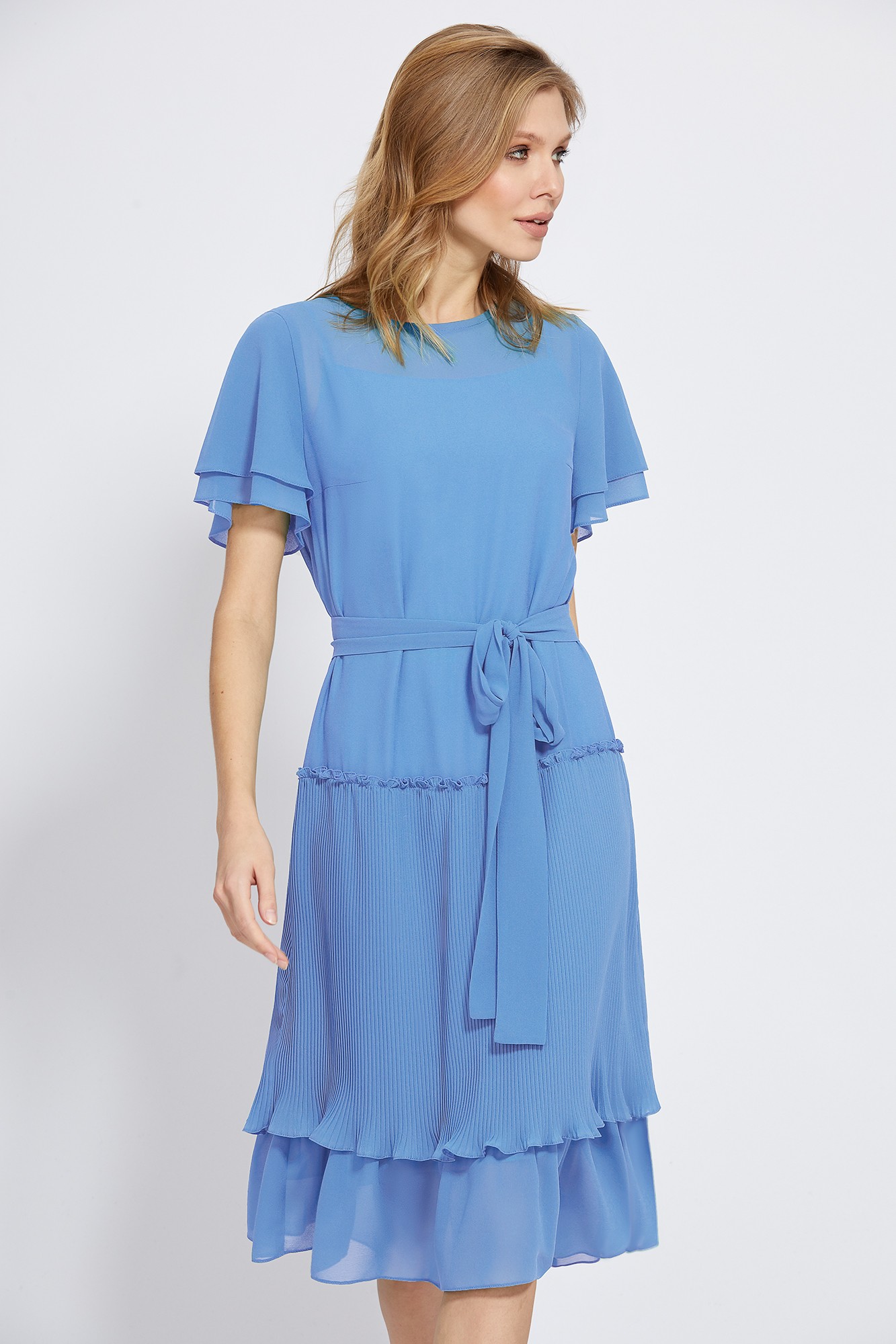 Чрезвычайно нежное платье прямого силуэта, выполненное из мягкого, приятного, однотонного шифона. Привлечь особое внимание к себе помогают оборки, верхняя из которых выполнена с помощью мелкой плиссировки и романтичные двухслойные рукава «флаттер». В среднем шве спинки обработана застёжка на навесную петлю и ювелирную пуговицу.