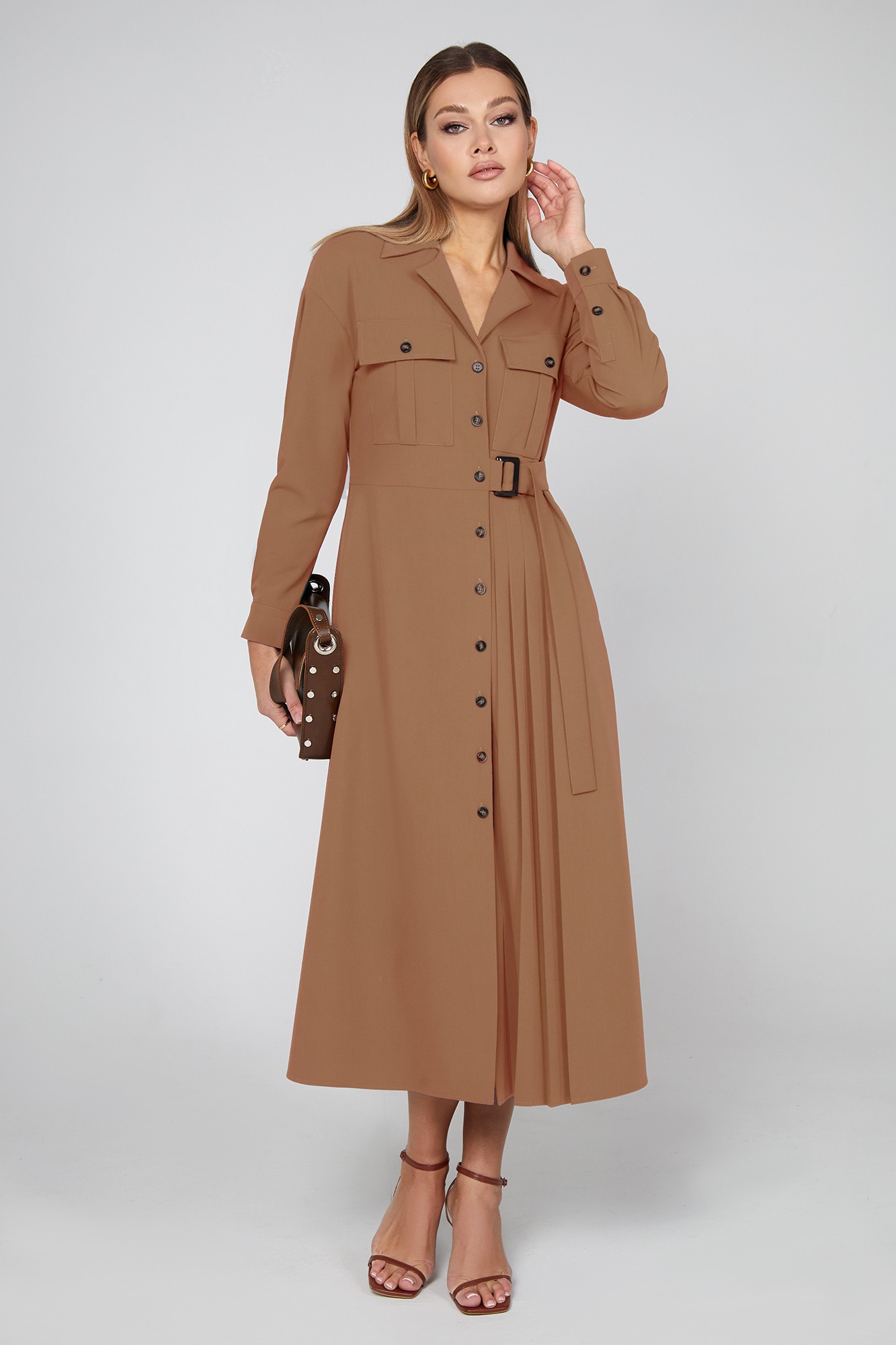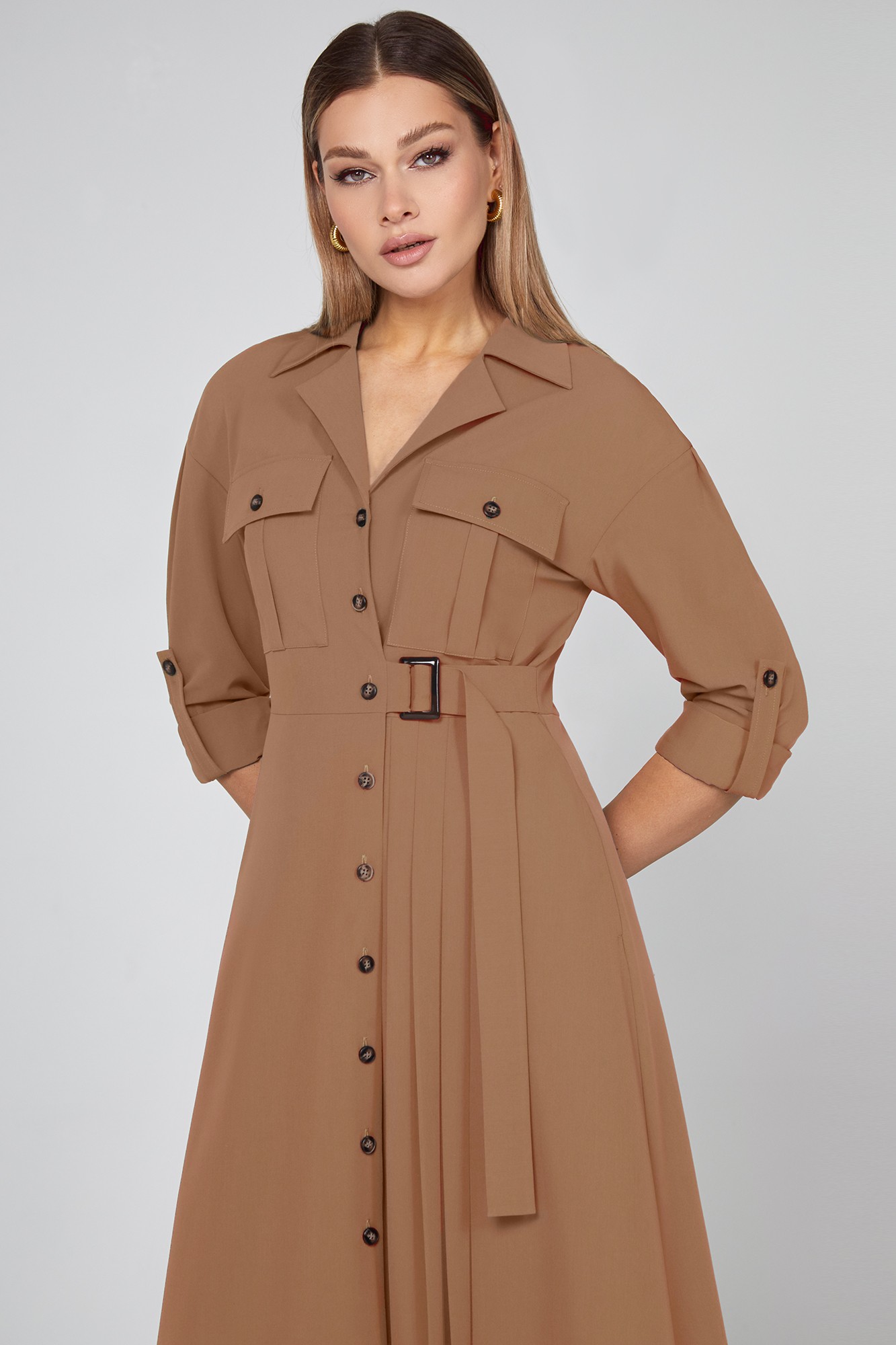 Просто фантастика! Это изысканное платье длиной макси с женственным кроем идеально дополняется аккуратным воротником с лацканами и пояском с пряжкой. Дизайн дополняется карманами с клапанами на груди, спущенной линией плеч с притачными рукавами с манжетами, которые при желании можно подвернуть и зафиксировать при помощи пат и пуговиц. Застежка на пуговицы по всей длине придаёт ему яркий штрих, а карманы в боковых швах добавляют функциональности. Вертикальные складки по детали переда завершают шикарный образ. Высококачественная испанская эластичная ткань также гарантирует износостойкость.