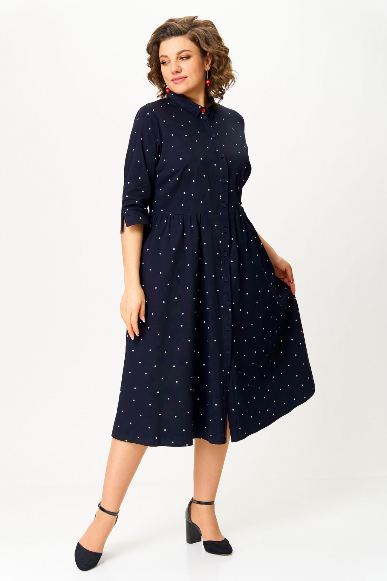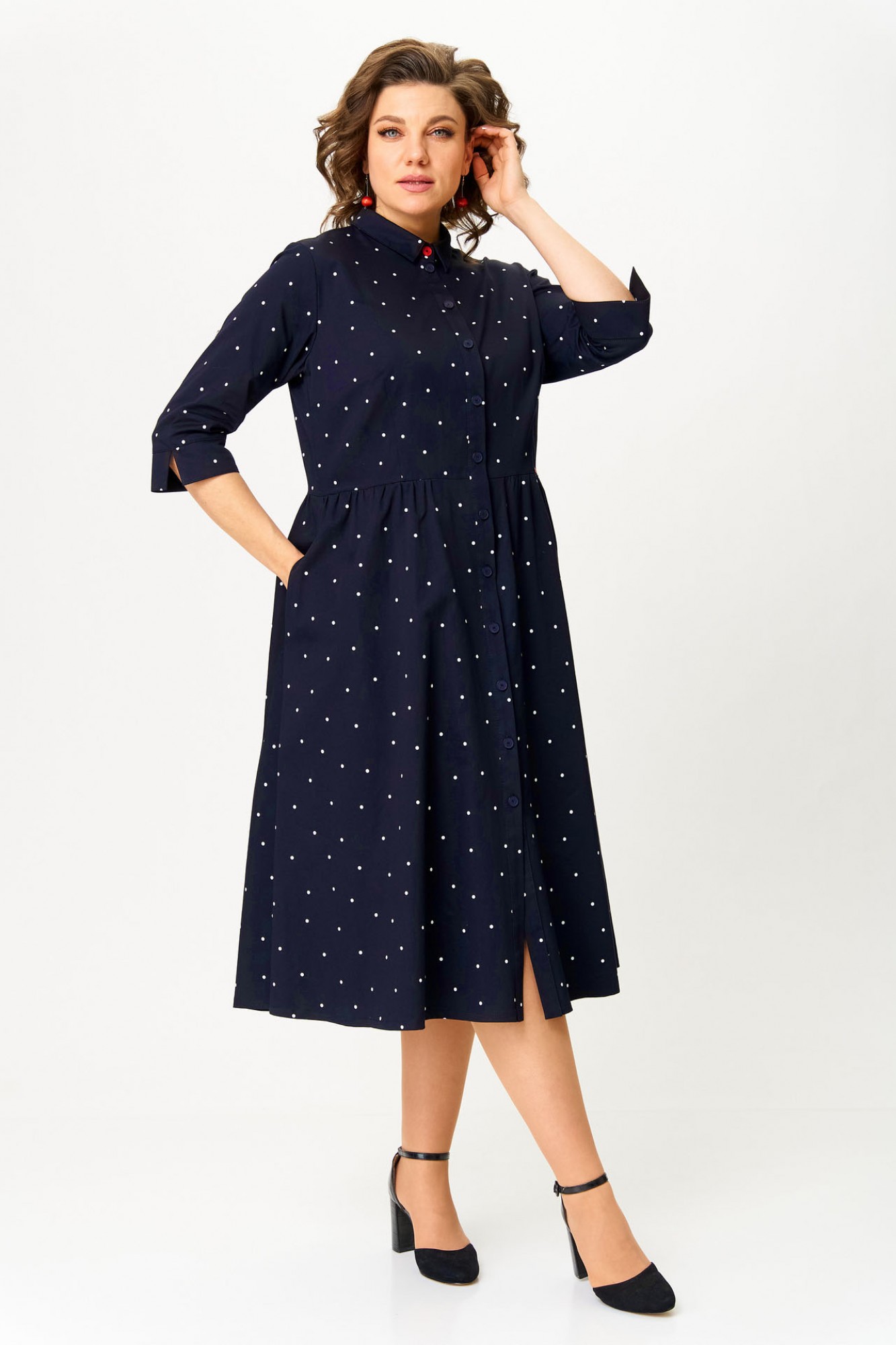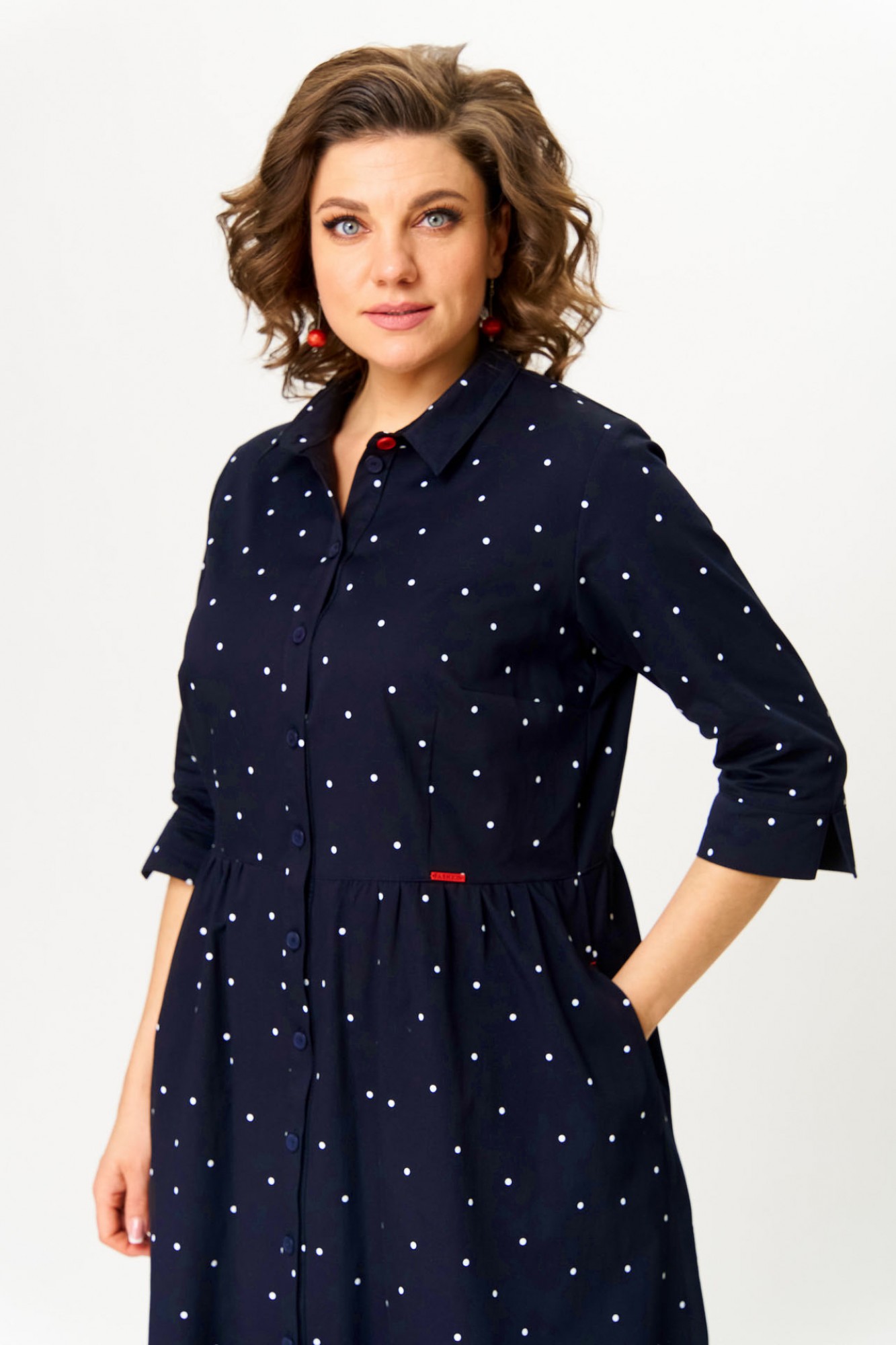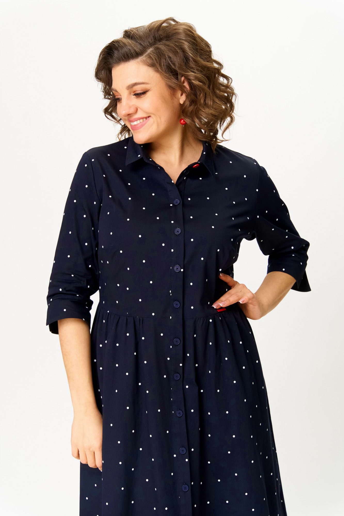 Платье женское, повседневное, полуприлегающего силуэта, отрезное по линии талии, длиной ниже линии колен, из хлопковой ткани. Перед с застежкой на пуговицы. Вырез горловины обработан воротником на стойке. Рукав втачной, по низу обработан цельнокроенной манжетой.