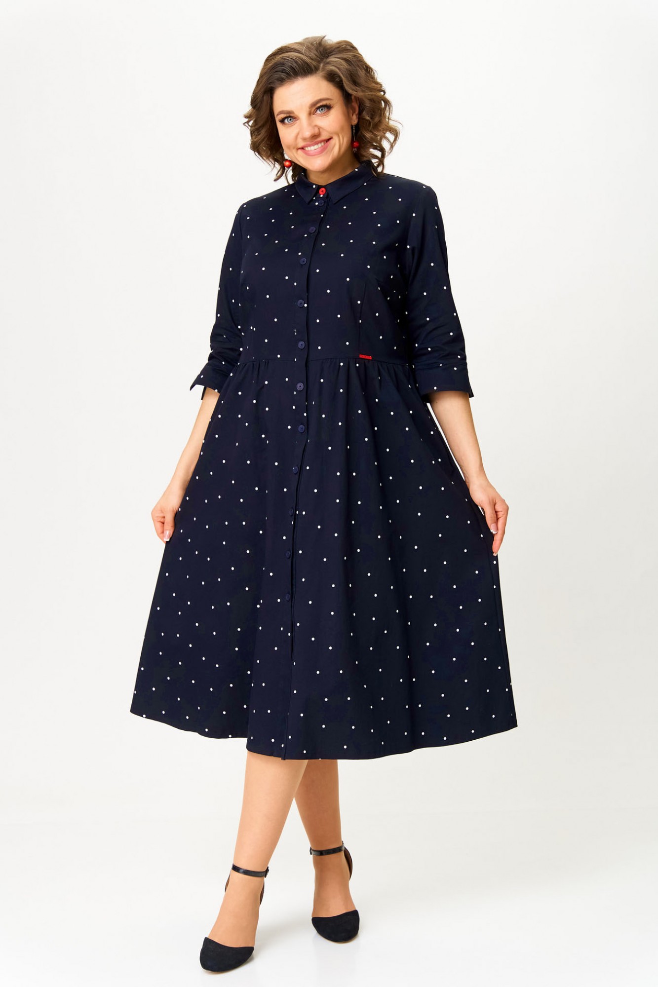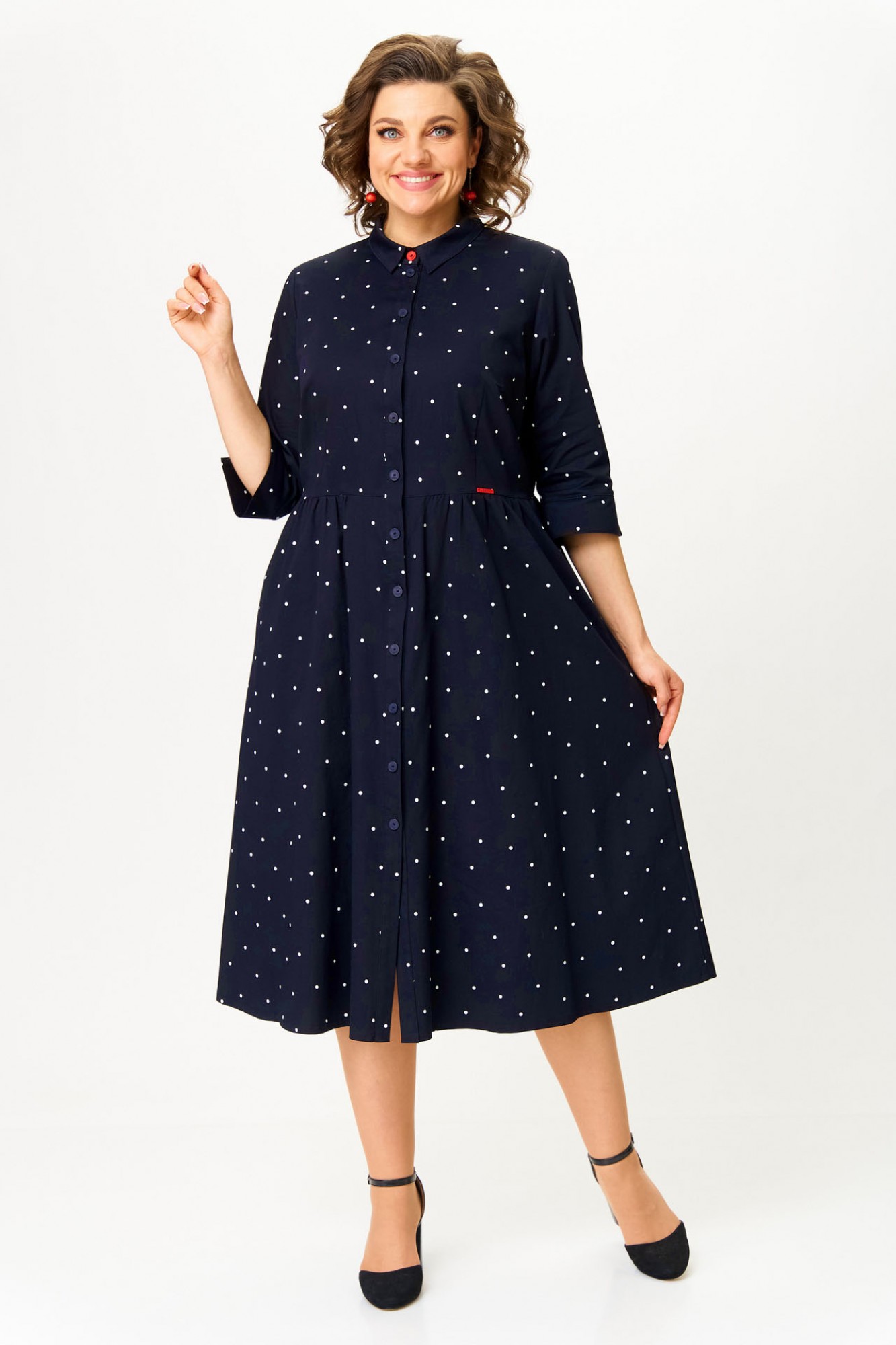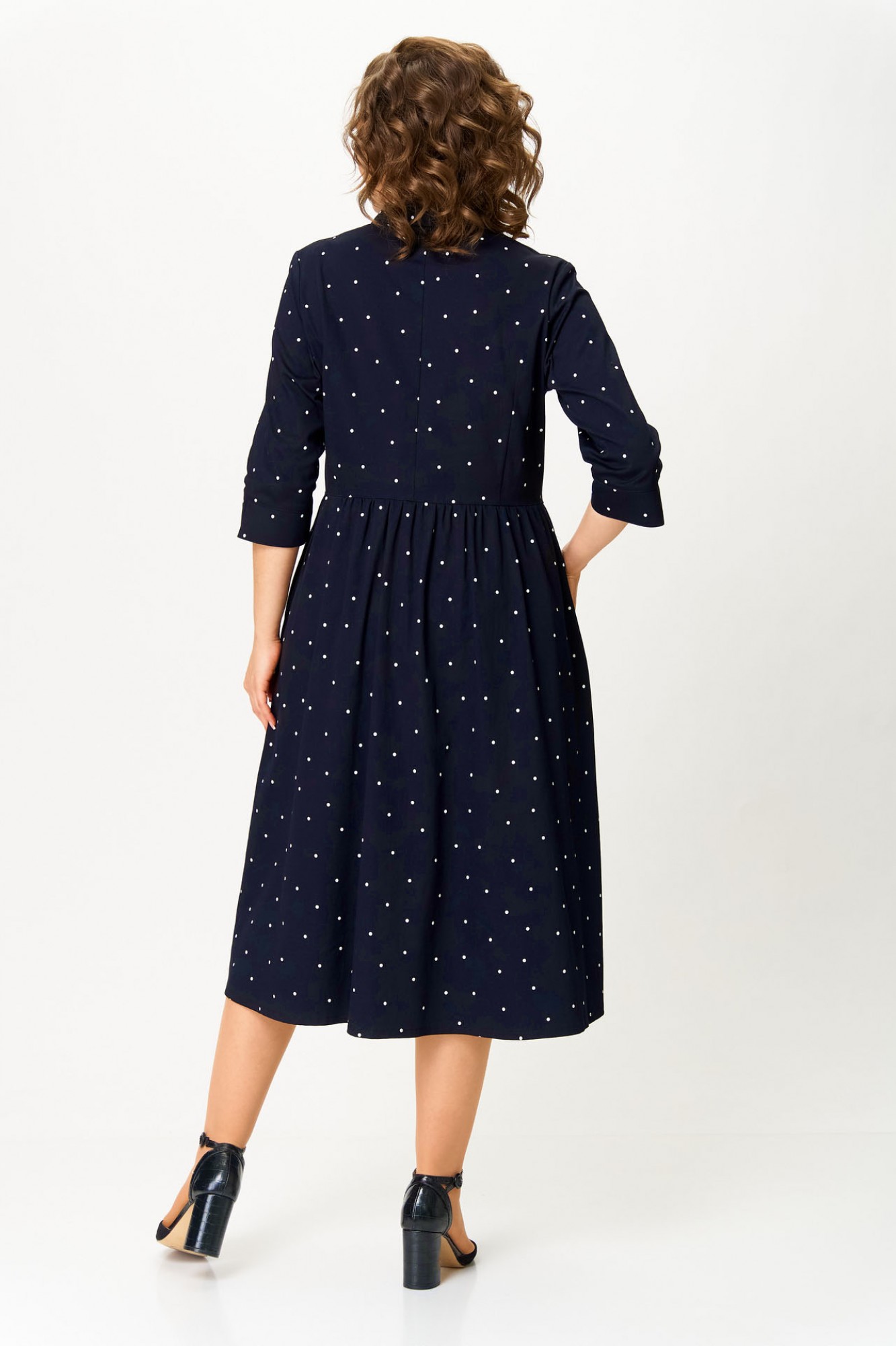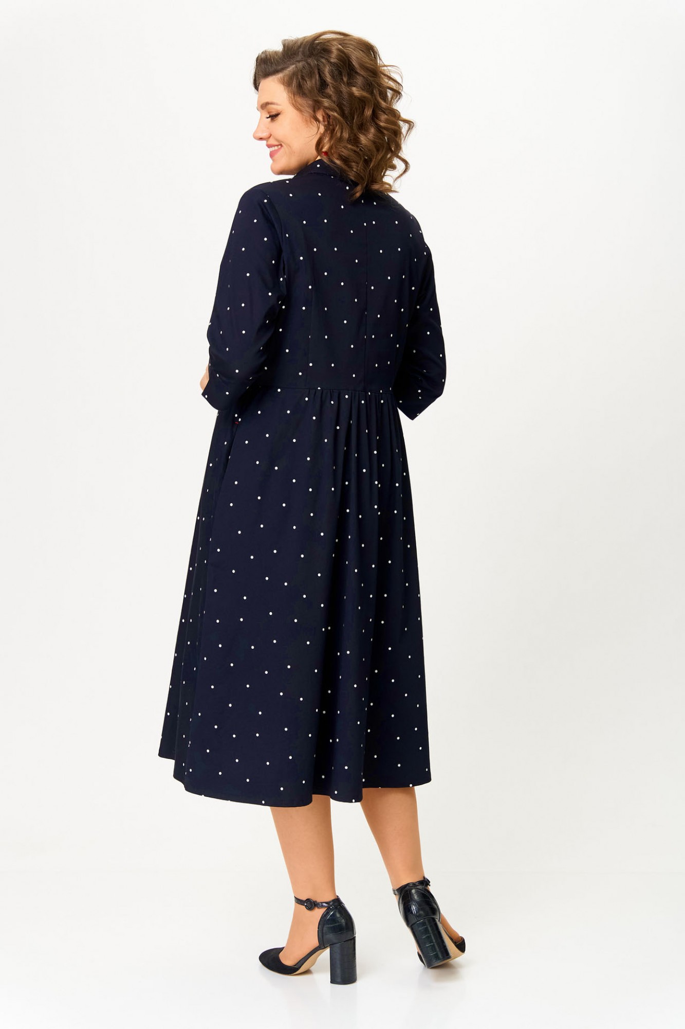 Платье женское, повседневное, полуприлегающего силуэта, отрезное по линии талии, длиной ниже линии колен, из хлопковой ткани. Перед с застежкой на пуговицы. Вырез горловины обработан воротником на стойке. Рукав втачной, по низу обработан цельнокроенной манжетой.