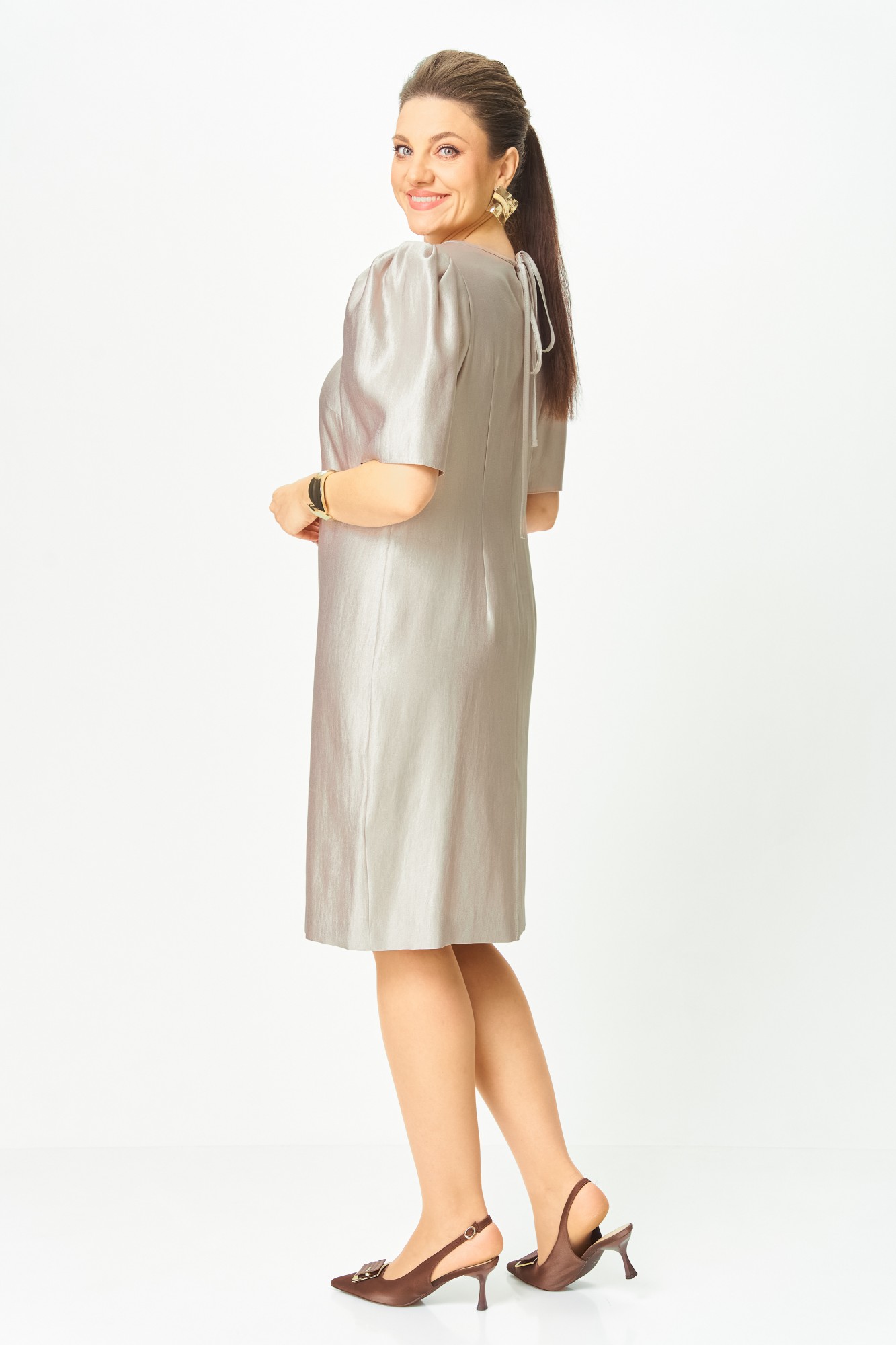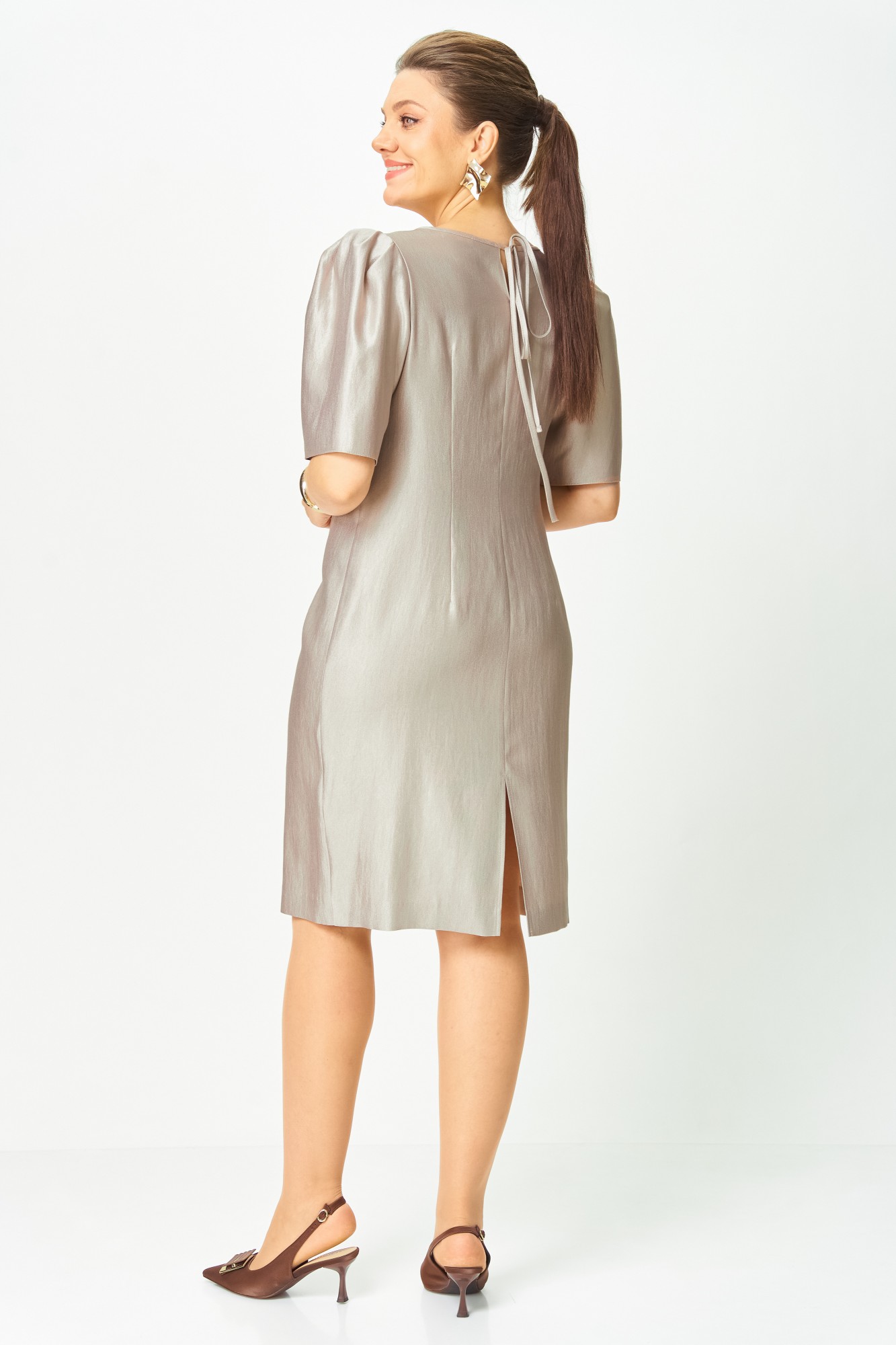 Элегантное женское платье, выполнено из плательной ткани с небольшим блеском. Платье полуприлегающего силуэта, горловина круглая. По спинке в центральном шве разрез возле горловины с завязкой и разрез по низу. Платье без подкладки.
