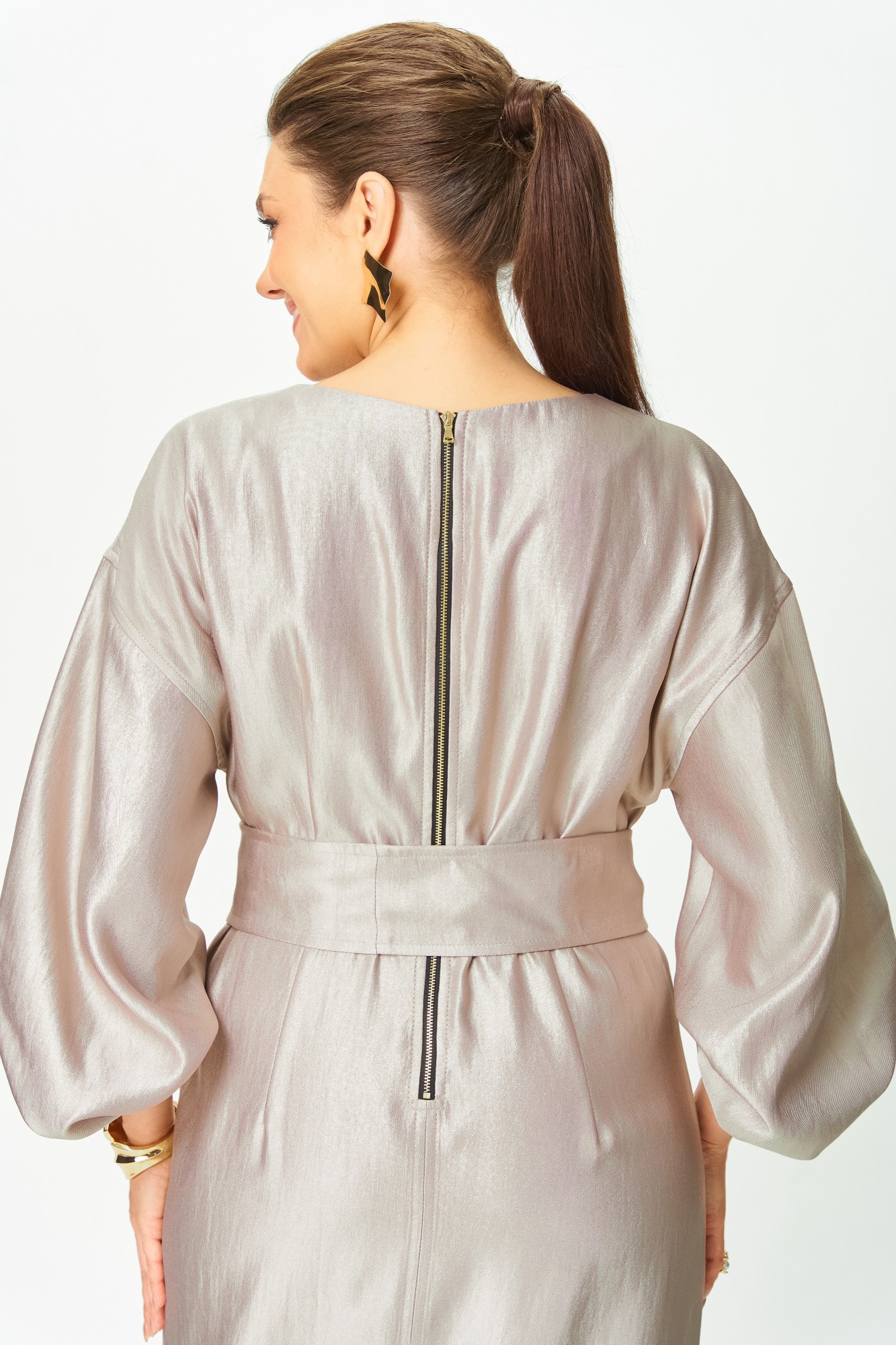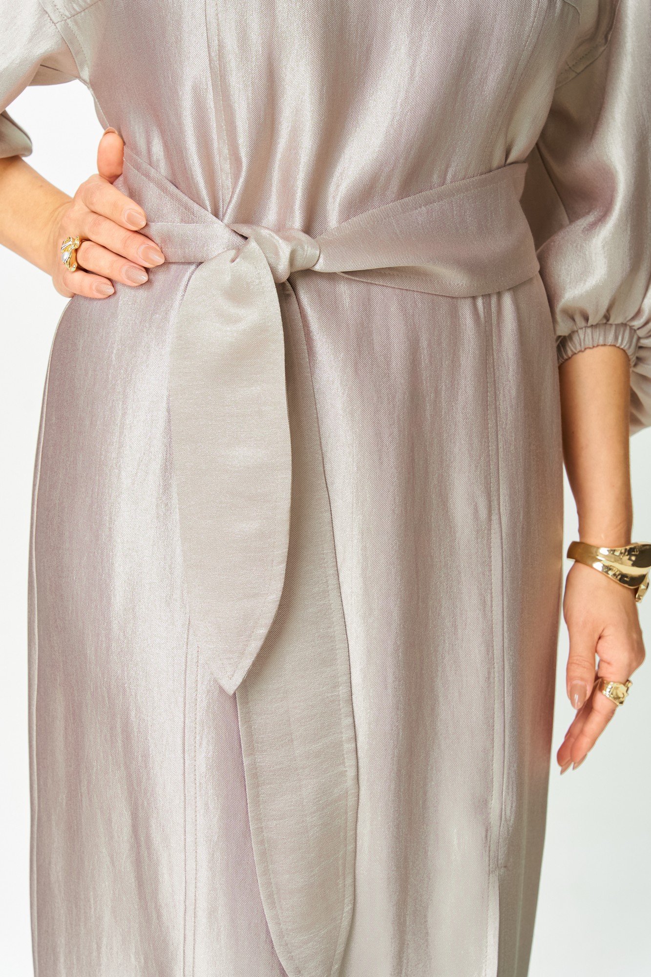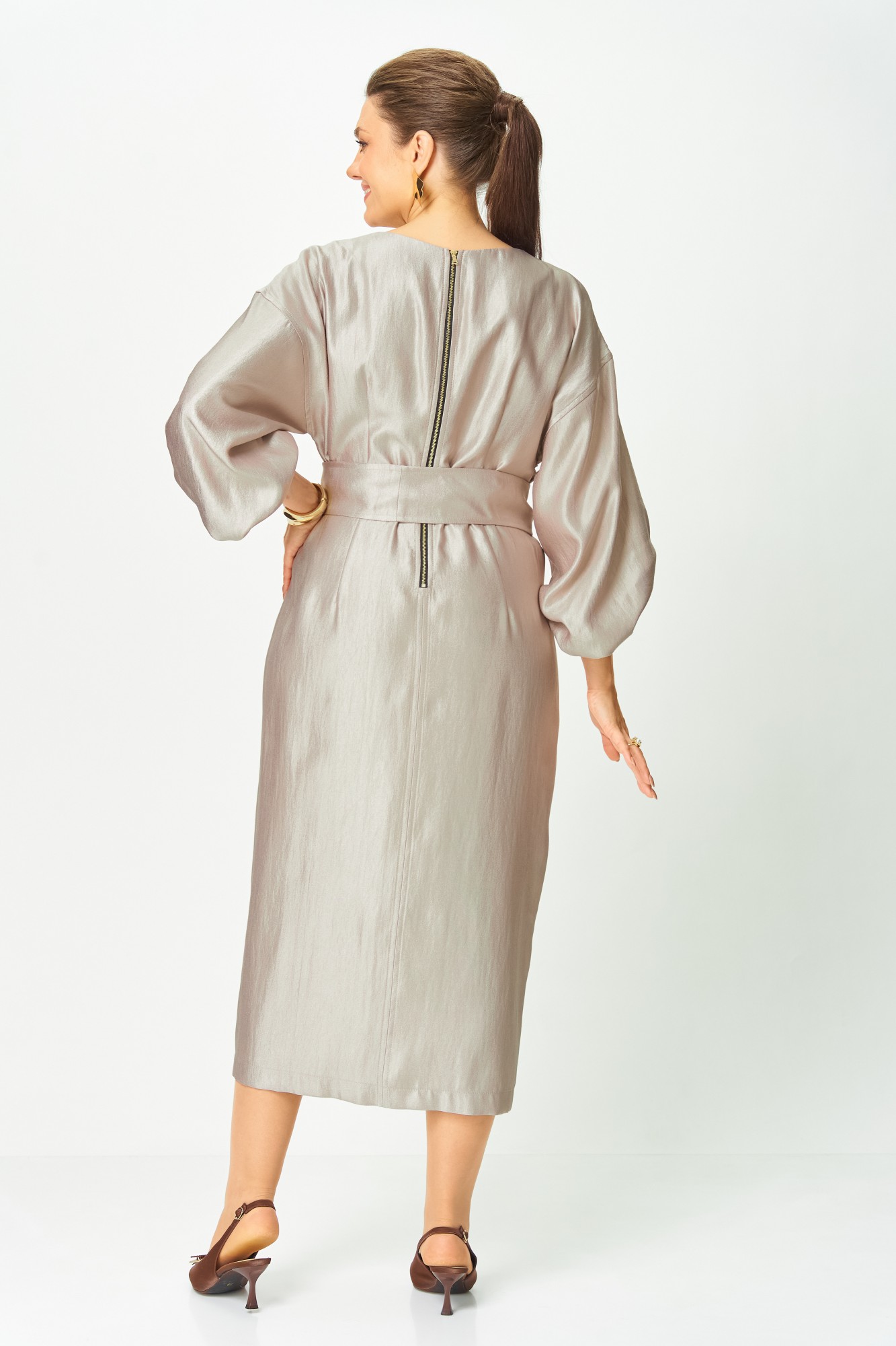Стильное женское платье, выполнено из плательной ткани с небольшим блеском. Платье прямого силуэта, с отрезными бочками и разрезом по низу платья. Застежка на декоративную молнию в центральном шве спинки. Горловина круглая. Рукава со спущенной проймой. Рукав широкий, с асимметричным низом, собранным на резинку. В комплект входит пояс их основной ткани. Платье без подкладки.