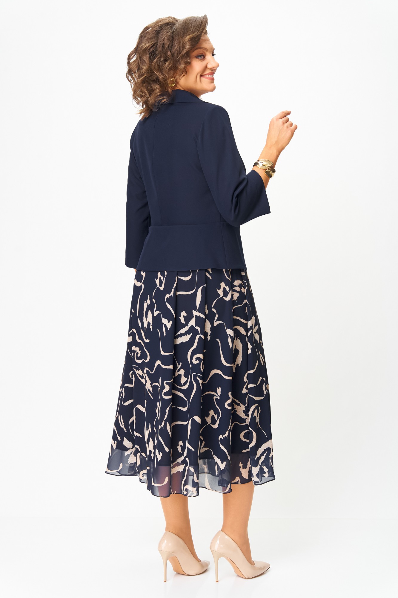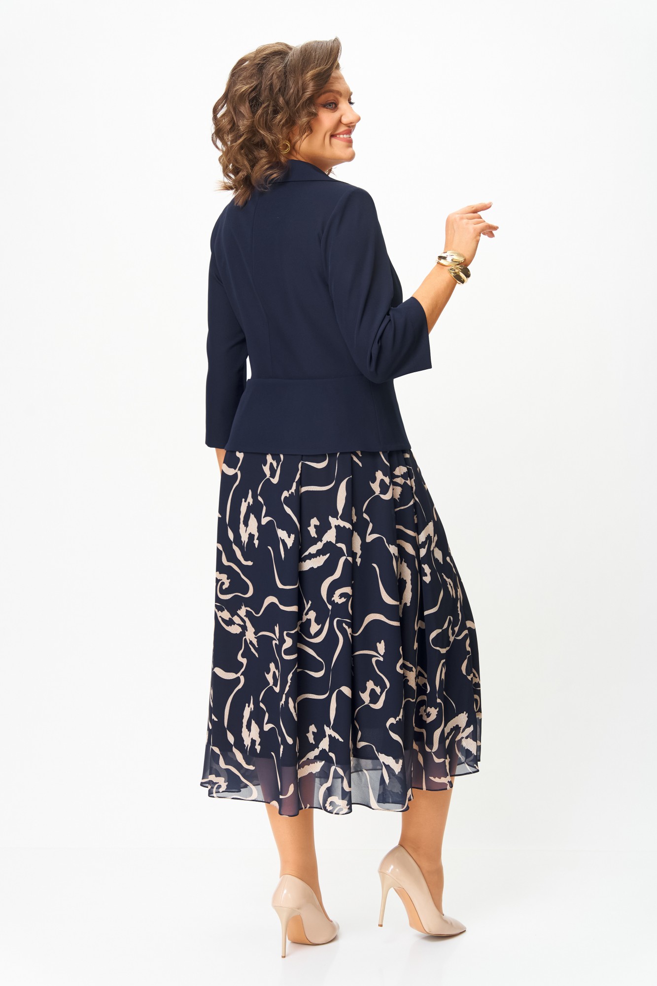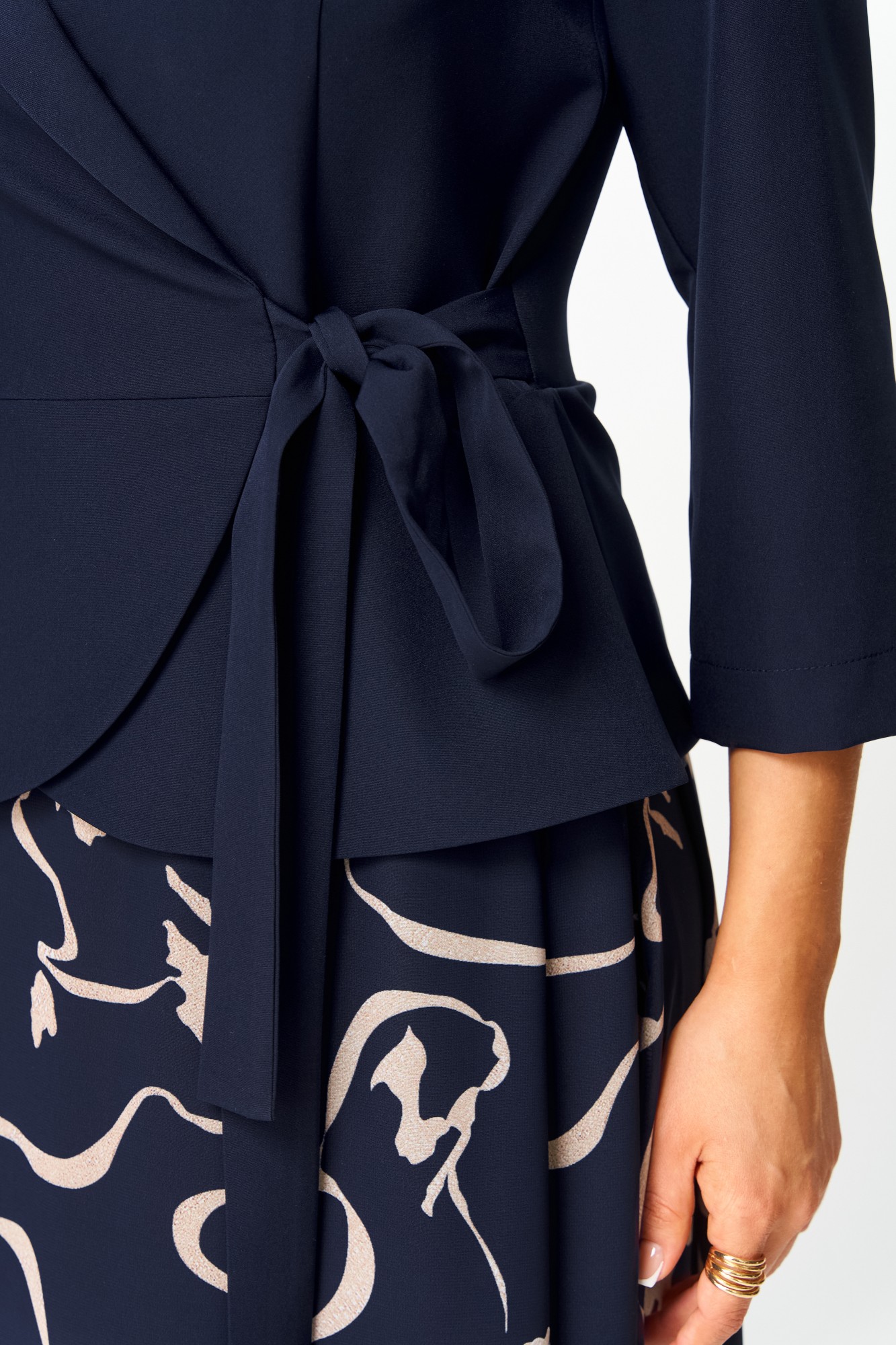 Элегантное женское платье, выполнено в виде имитации костюма из двух видов ткани. Лиф из плательной ткани, юбка из шифона. Платье с запахом, горловина с воротником пиджачного типа с отложными лацканами. Рукава втачные, длина 3/4. Юбка со складками по линии талии, расширенная к низу, на подкладке. По линии талии вставлен завязывающийся пояс.
