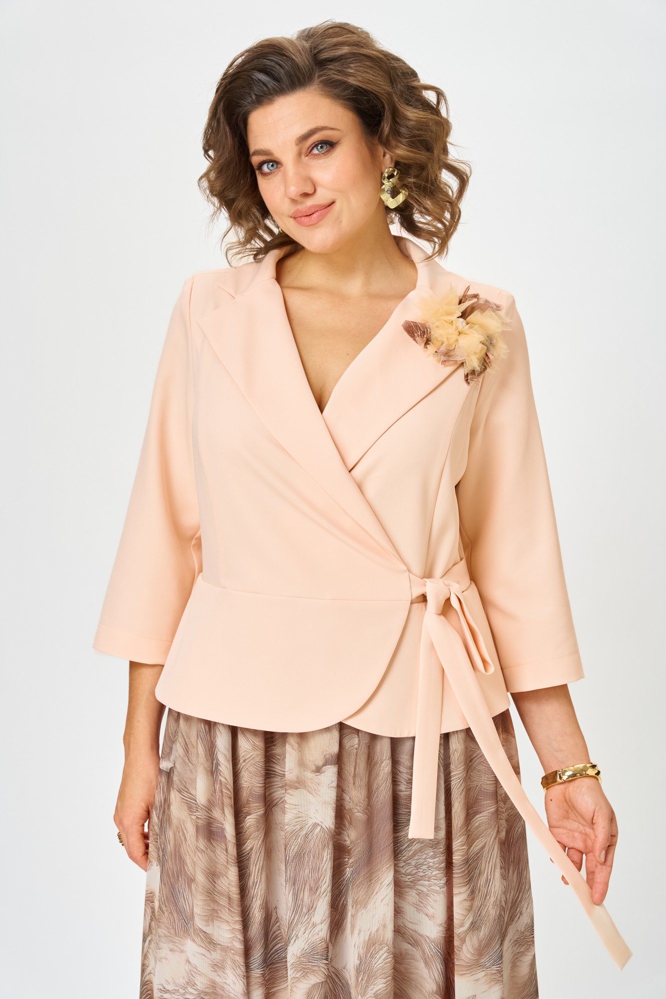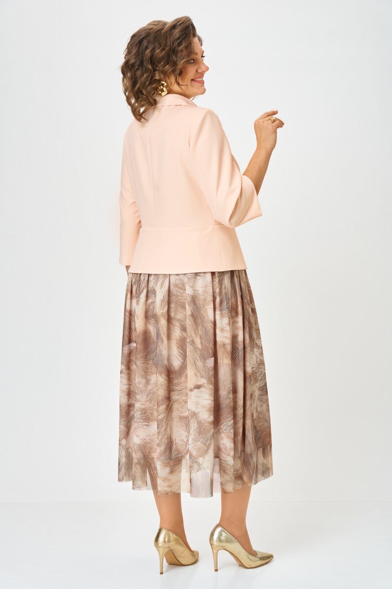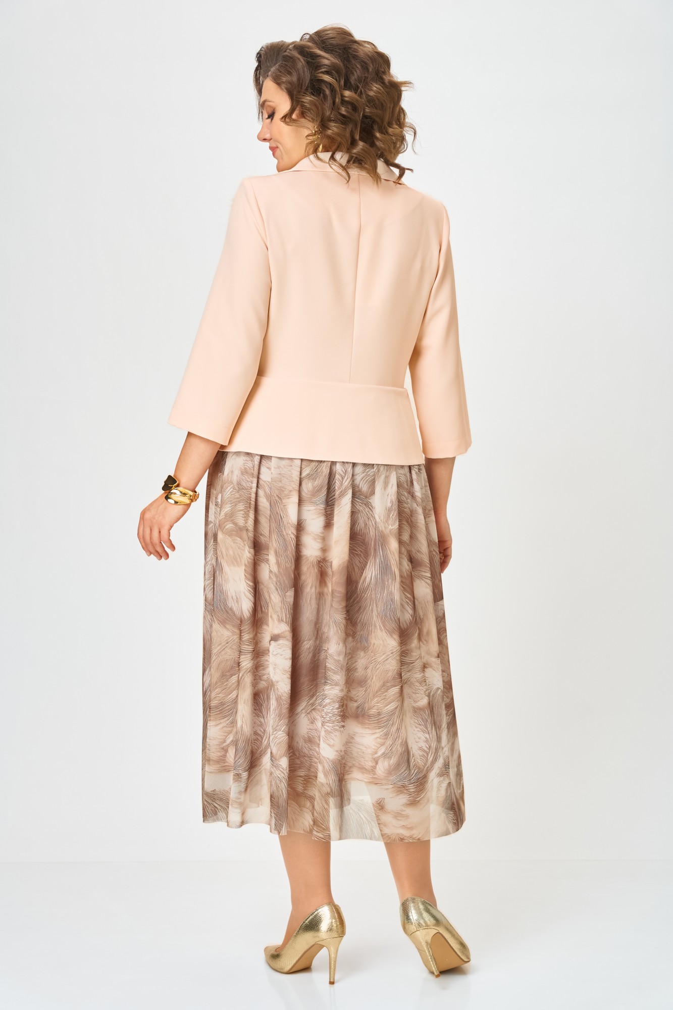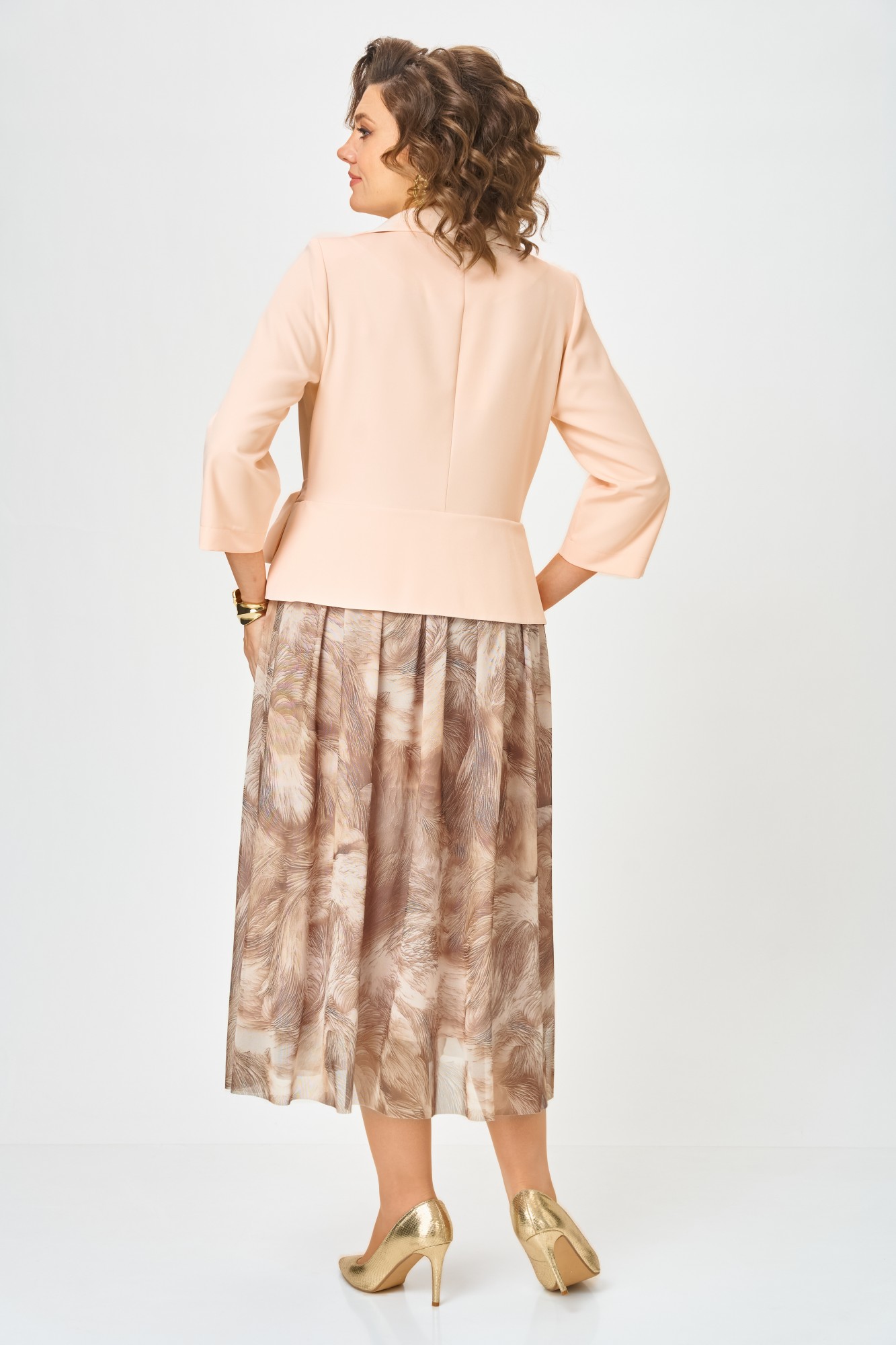 Элегантное женское платье, выполнено из двух видов ткани. Верх из плательной ткани, низ – сетка. Платье полуприлегающего силуэта, верх жакетного типа с запахом. Юбка расширенная со сборкой по талии, на подкладке. Платье украшено съемным цветком ручной работы.