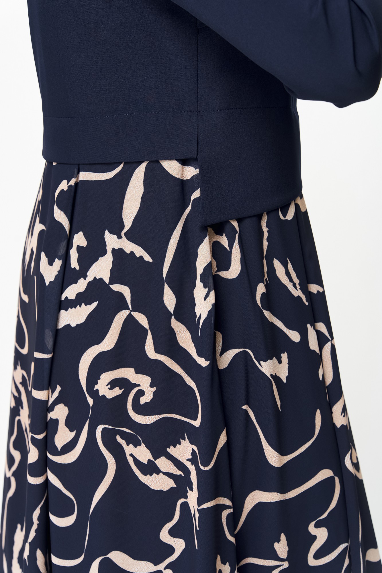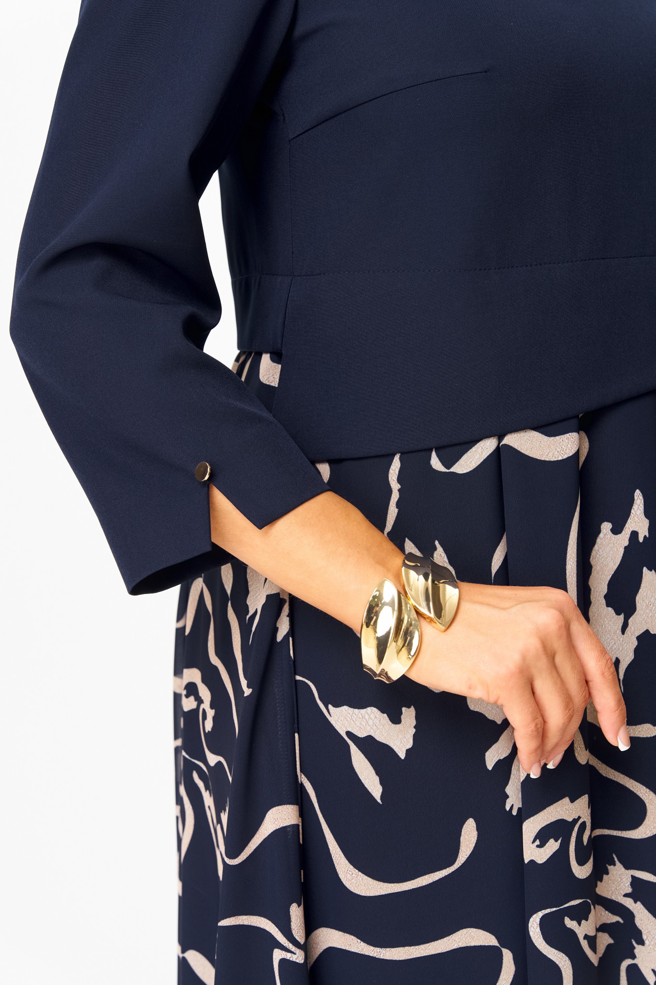 Элегантное женское платье, выполнено из двух видов ткани. Лиф из плательной ткани, горловина круглая с декоративным элементом по центру, по низу лифа ответная складка, по переду низ асимметричный, рукава втачные, по низу декоративный элемент с пуговицей. Юбка платья из шифона, расширенная со складками, на подкладке.