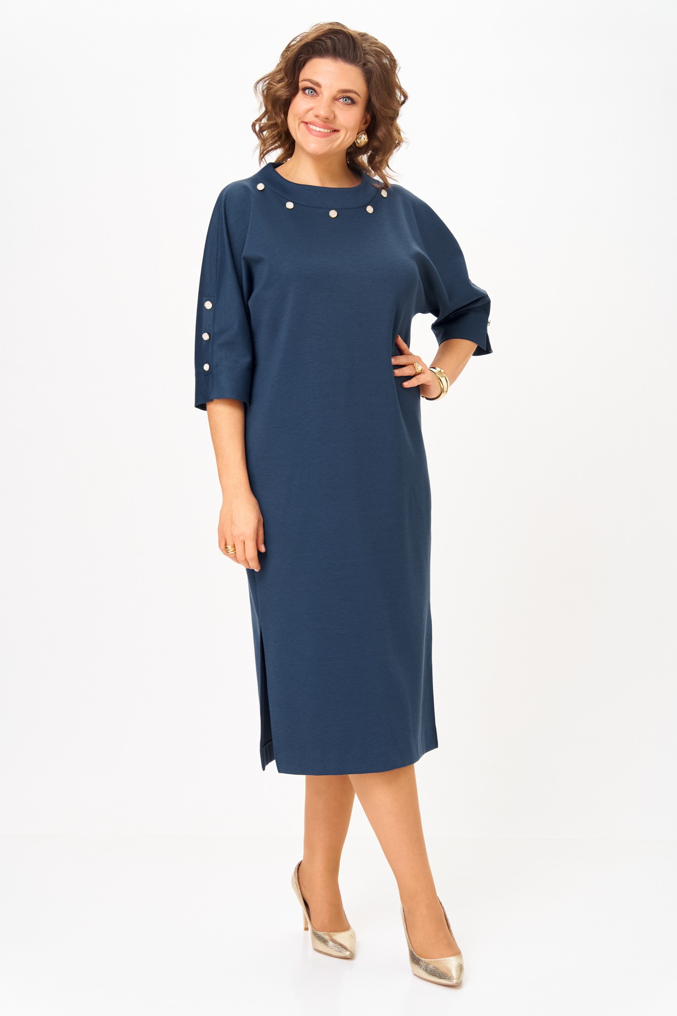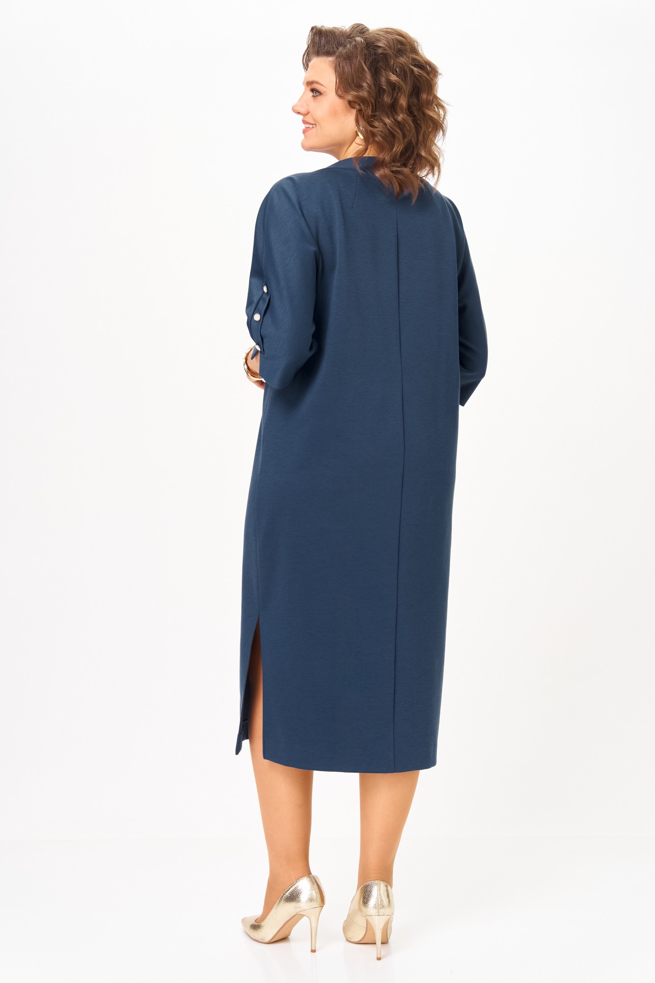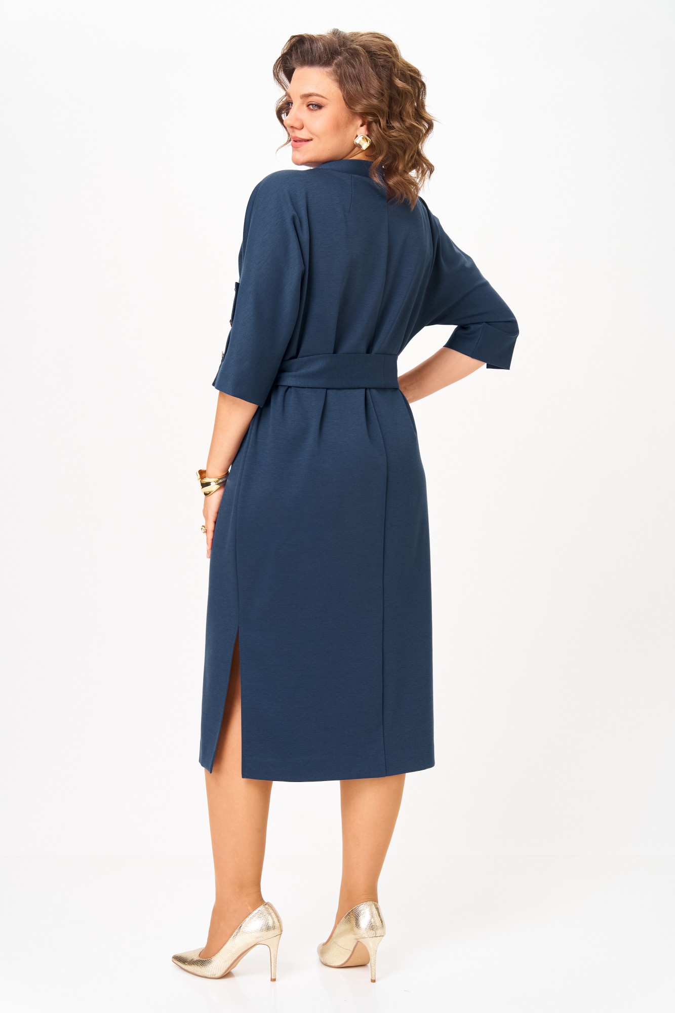 Платье полуприлегающего силуэта из трикотажного полотна с цельнокроеным рукавом длиной три четверти. В верхнем шве рукава обработана декоративная планка с пуговицами и разрез по низу. Горловина широкая с воротником-стойка. Со стороны спинки в воротнике обработана застежка с навесными петлями и пуговцами. Вдоль шва горловины расположены декоративные пуговицы. В боковых швах обработаны разрезы. Платье с декоративным поясом из основной ткани и шлевками в боковых швах. Платье без подкладки.