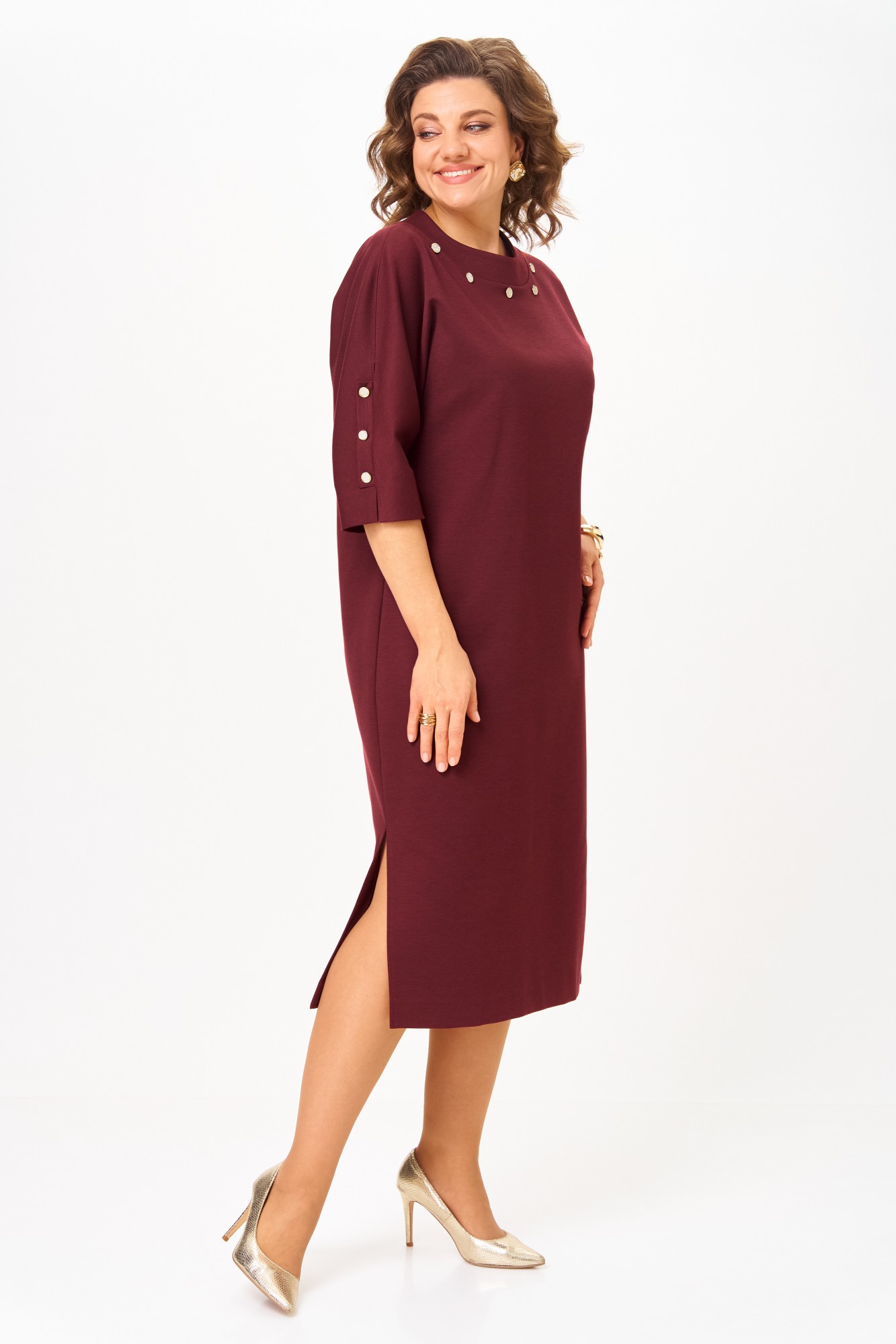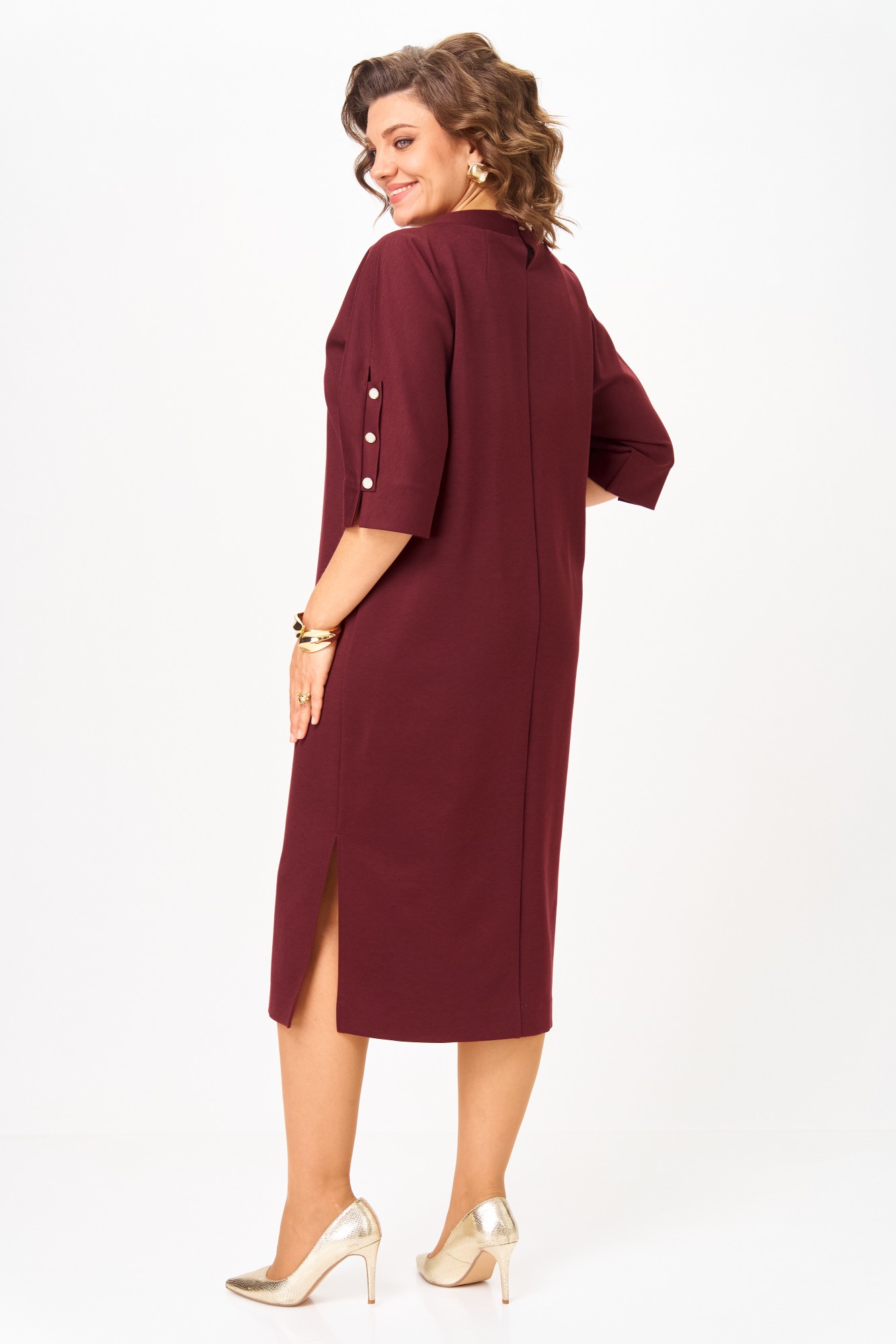 Платье полуприлегающего силуэта из трикотажного полотна с цельнокроеным рукавом длиной три четверти. В верхнем шве рукава обработана декоративная планка с пуговицами и разрез по низу. Горловина широкая с воротником-стойка. Со стороны спинки в воротнике обработана застежка с навесными петлями и пуговцами. Вдоль шва горловины расположены декоративные пуговицы. В боковых швах обработаны разрезы. Платье с декоративным поясом из основной ткани и шлевками в боковых швах. Платье без подкладки.
