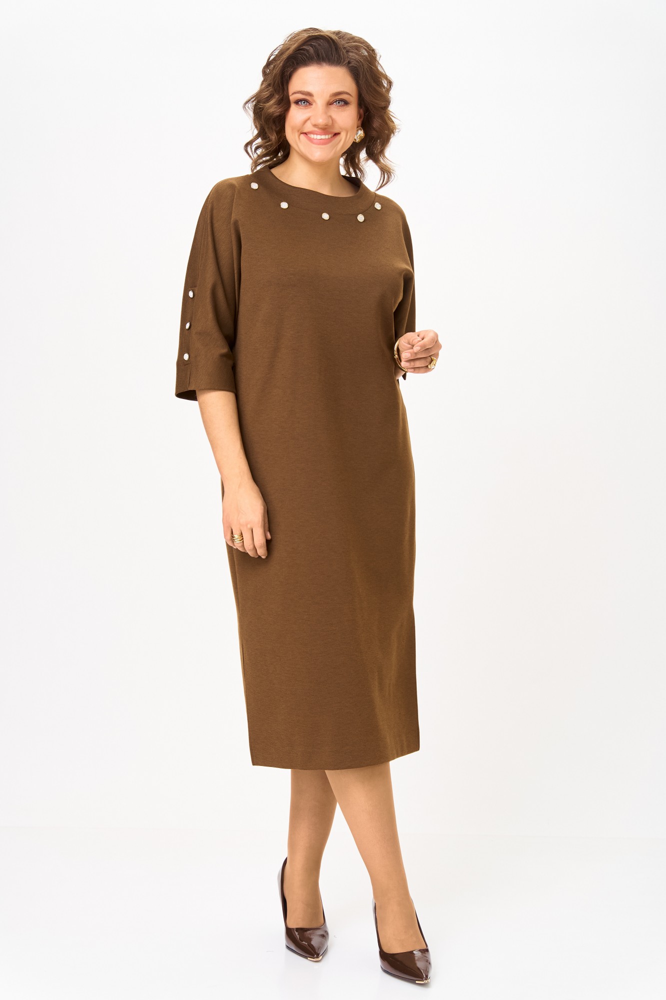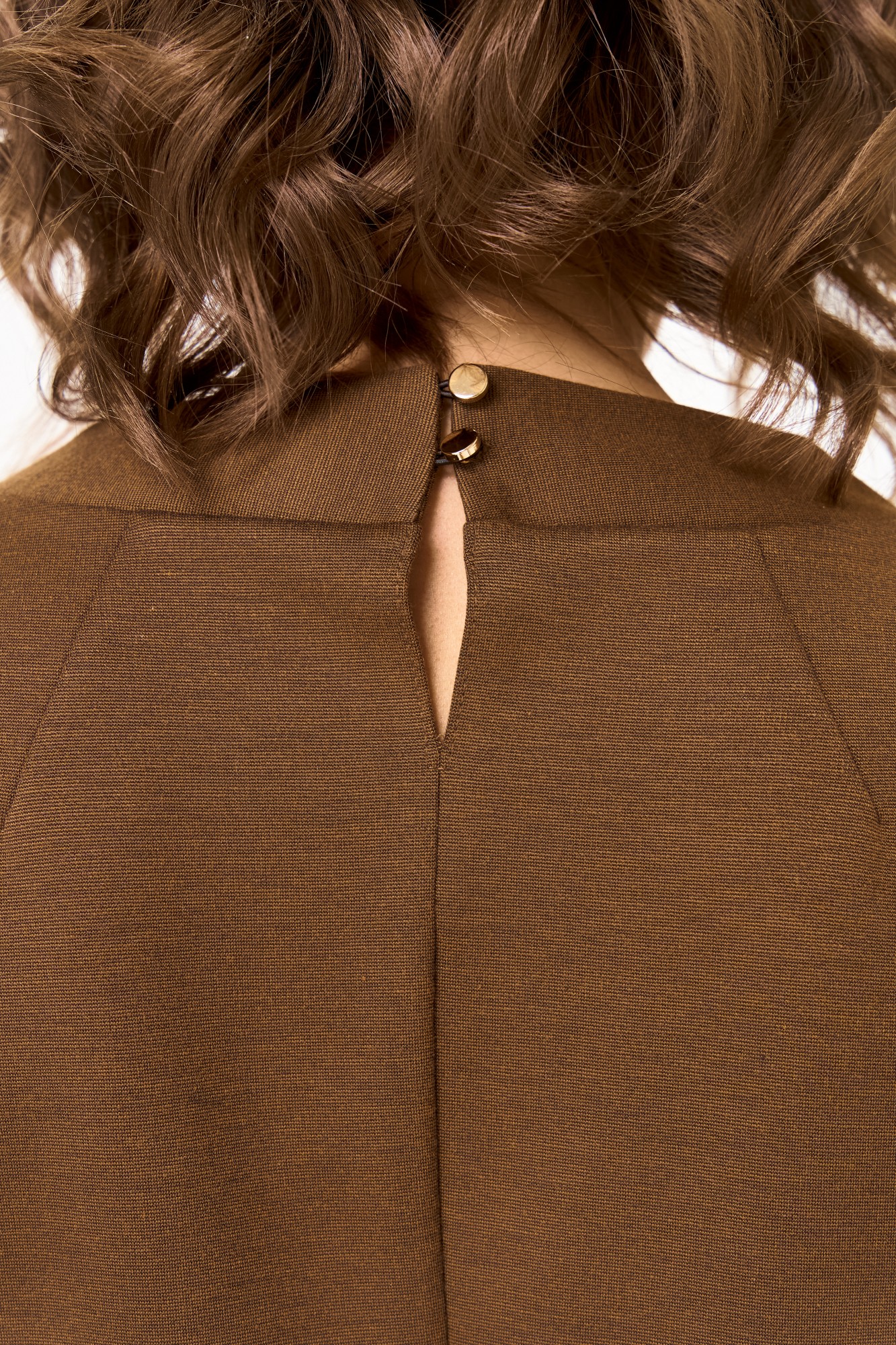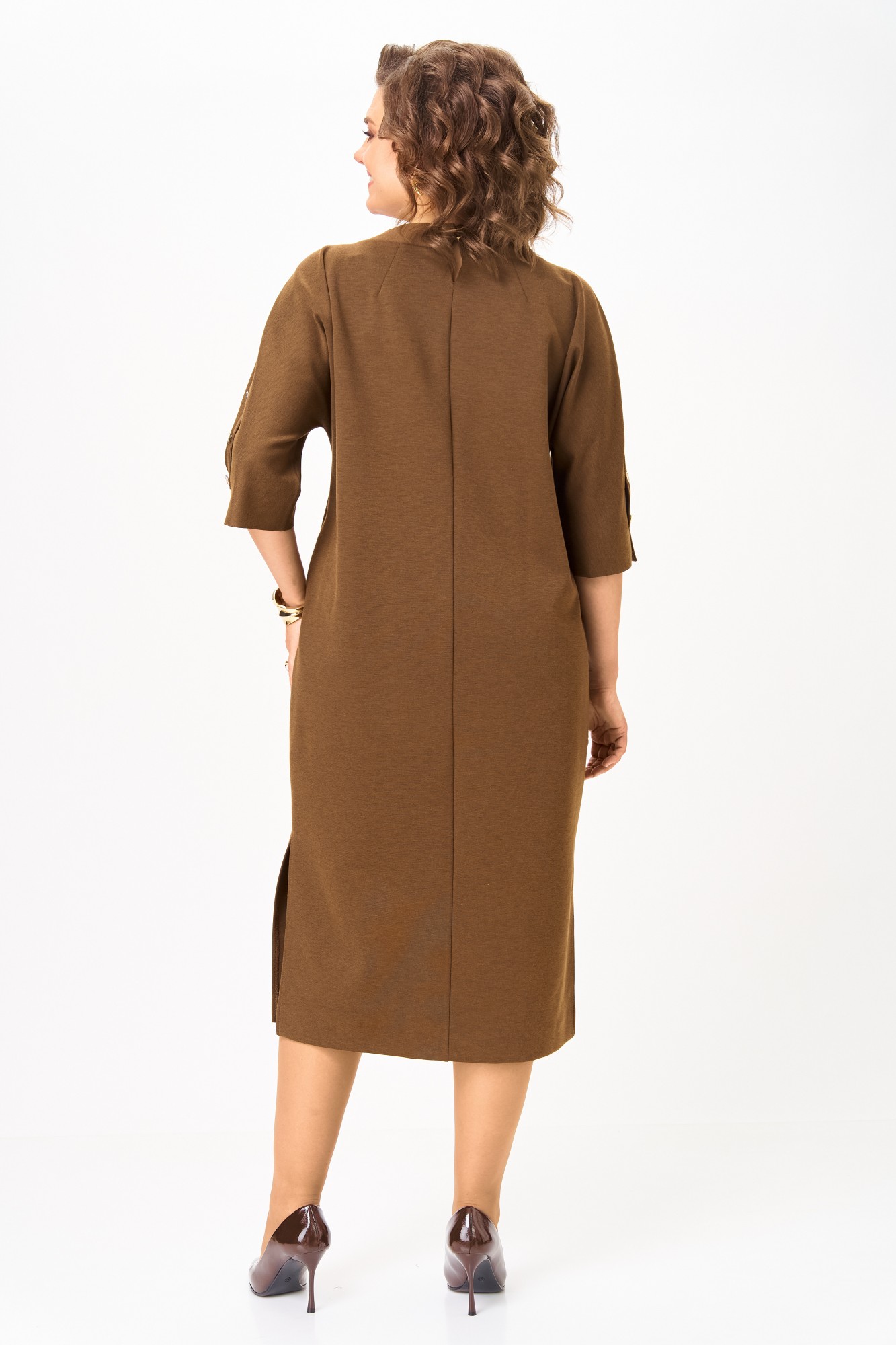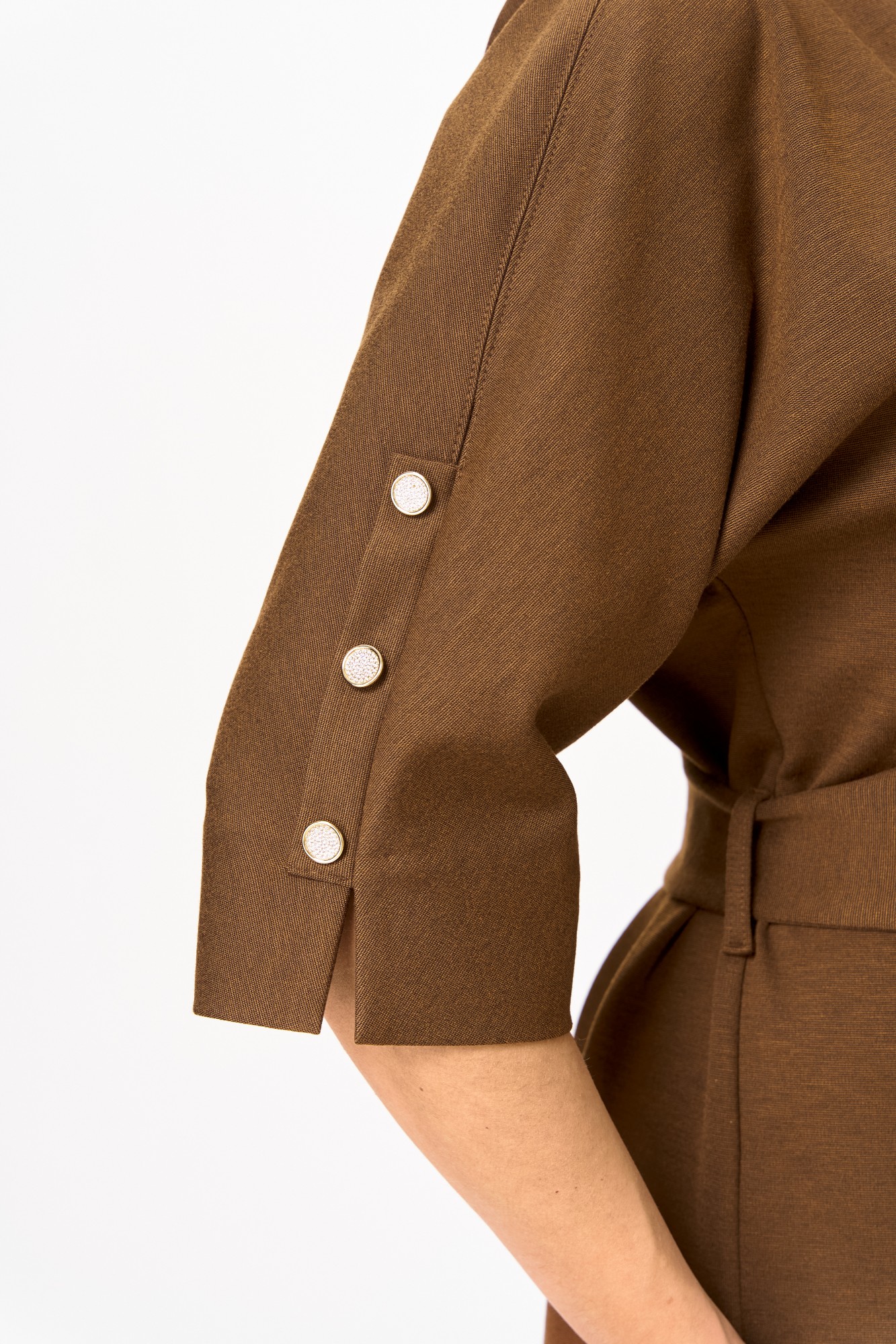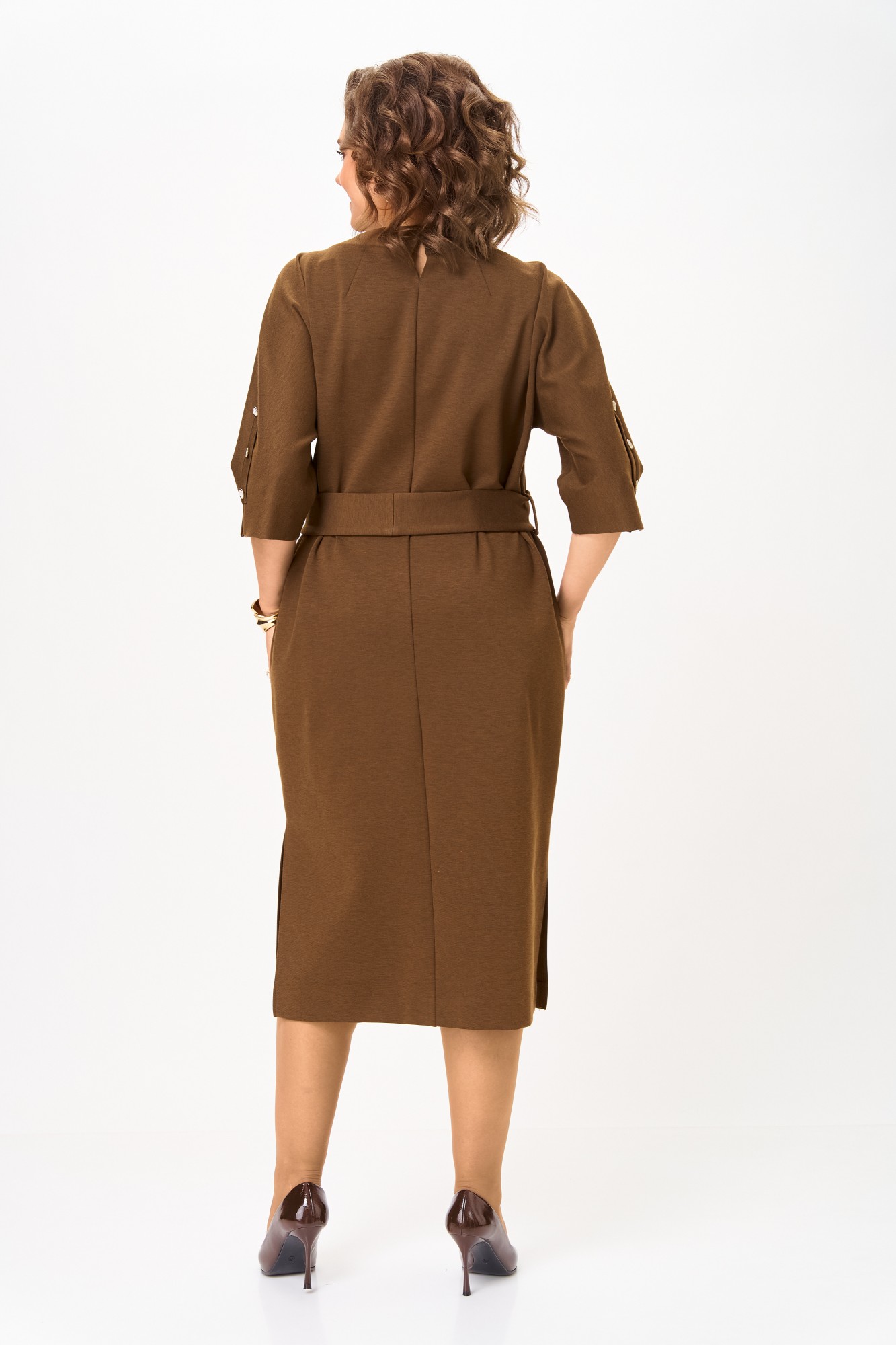 Платье полуприлегающего силуэта из трикотажного полотна с цельнокроеным рукавом длиной три четверти. В верхнем шве рукава обработана декоративная планка с пуговицами и разрез по низу. Горловина широкая с воротником-стойка. Со стороны спинки в воротнике обработана застежка с навесными петлями и пуговцами. Вдоль шва горловины расположены декоративные пуговицы. В боковых швах обработаны разрезы. Платье с декоративным поясом из основной ткани и шлевками в боковых швах. Платье без подкладки.