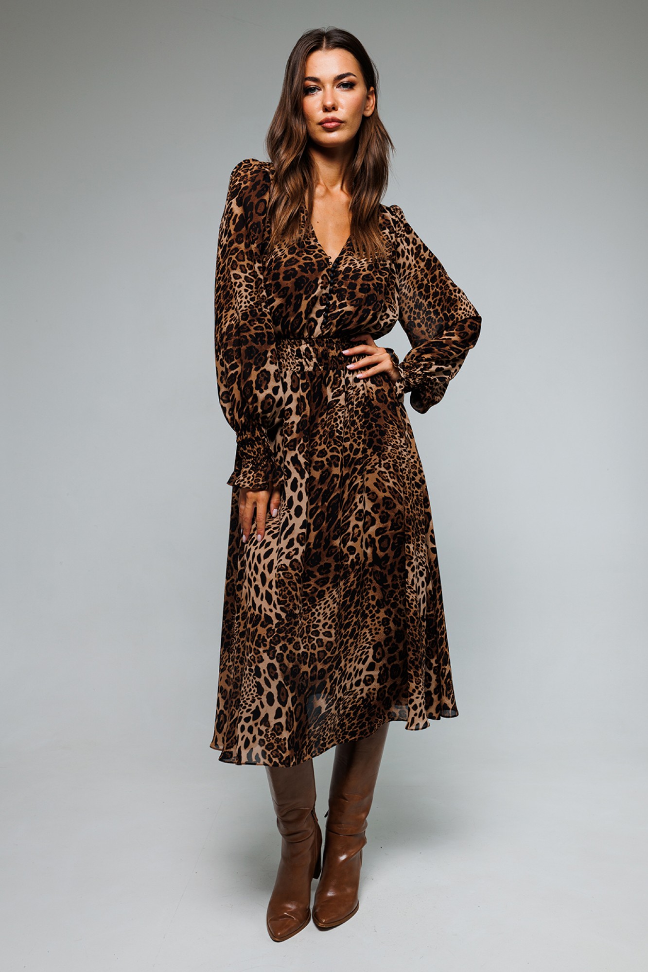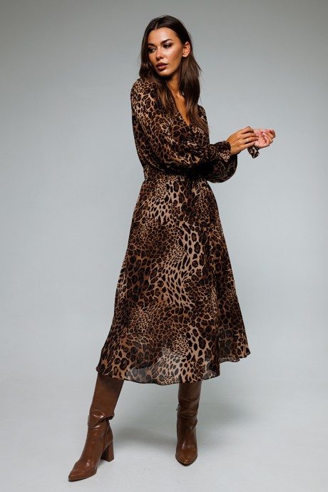 Платье полуприлегающего силуэта отрезное по линии талии, нижняя часть расширенна к низу. Платье с втачным рукавом со сборкой по окату и внизу на резинках. Лиф с V-образным вырезом и с центральной застежкой на пуговицы. Сборка по плечевому шву по переду. По спинке и переду выставка на талии с резинками. Платье на подкладке.