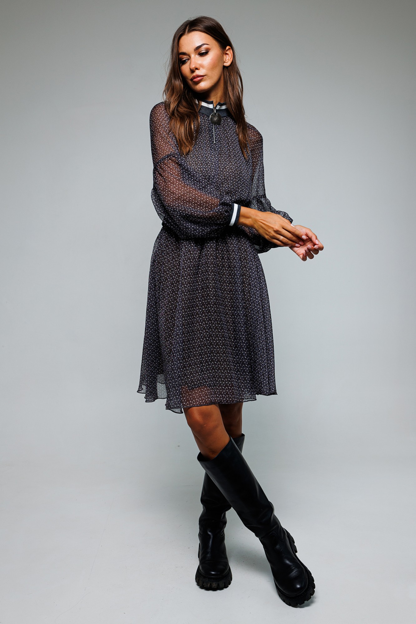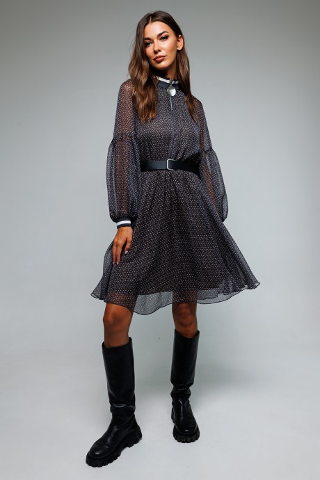 Платье полуприлегающего силуэта отрезное по линии талии на резинке, нижняя часть расширенна к низу. Платье с декоративным отделочным довязом по горловине и центральной застежкой на тесьму молнию. Рукава-реглан со сборкой по горловине внизу на манжете из довяза, тоже со сборкой. Платье на подкладке. Ремень в комплекте.