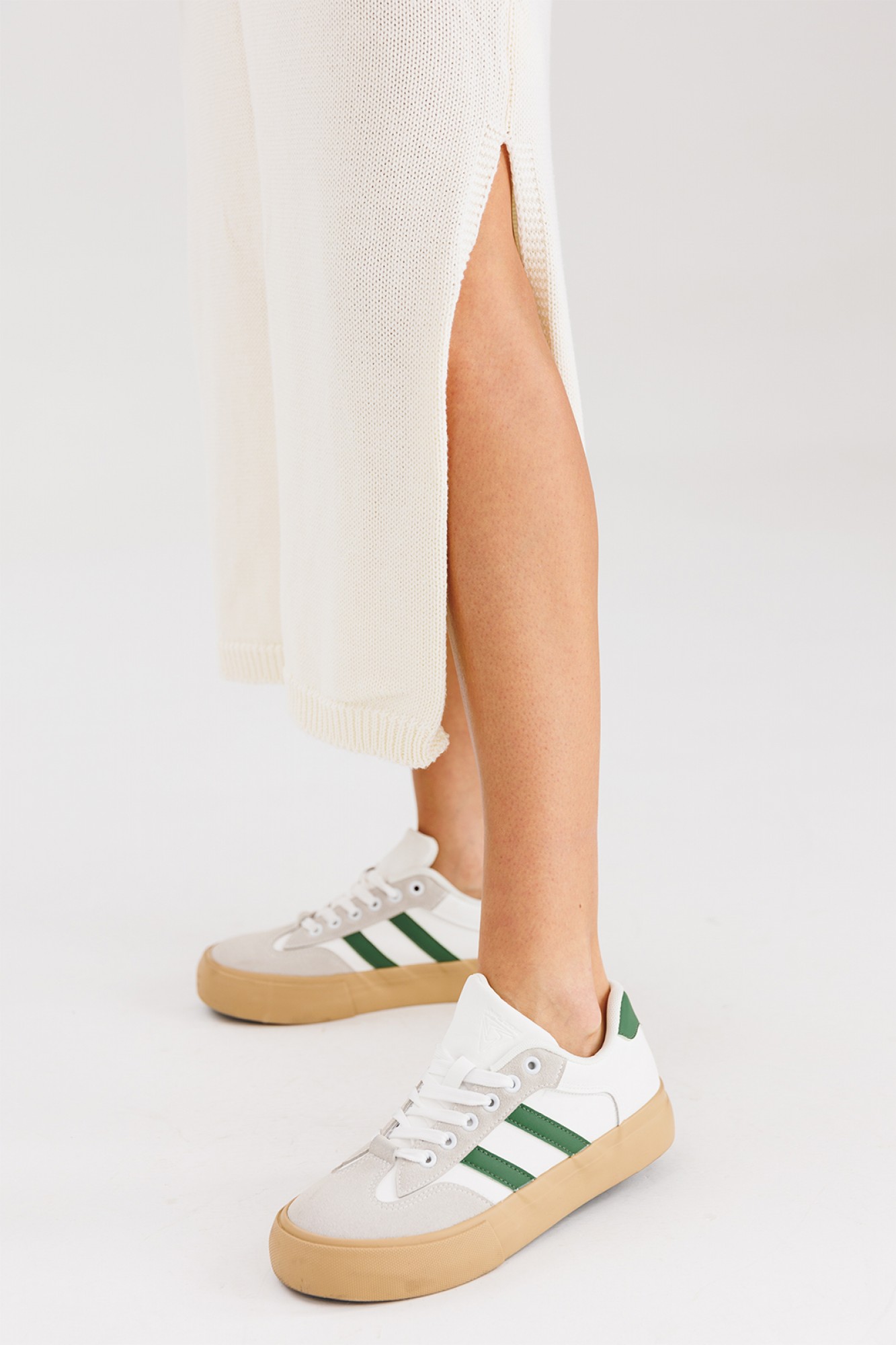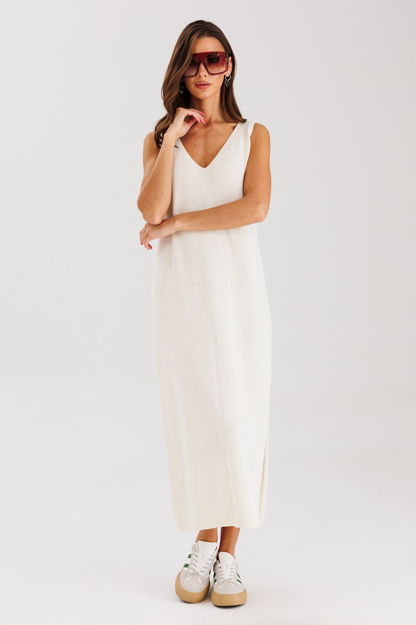 Платье трикотажное прямого силуэта, без рукавов, длинное. По переду с V-образным вырезом. С права по боковому шву разрез.