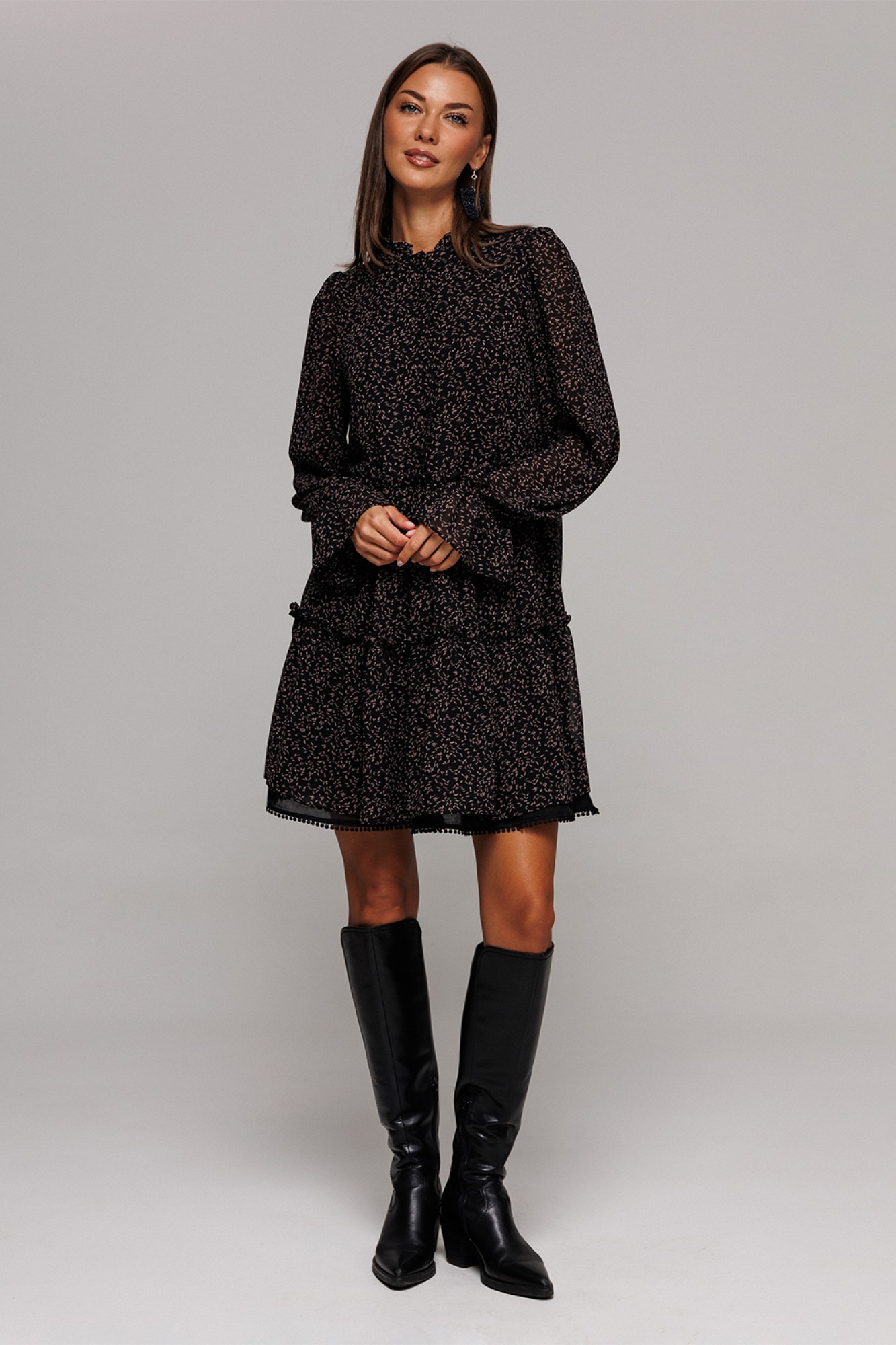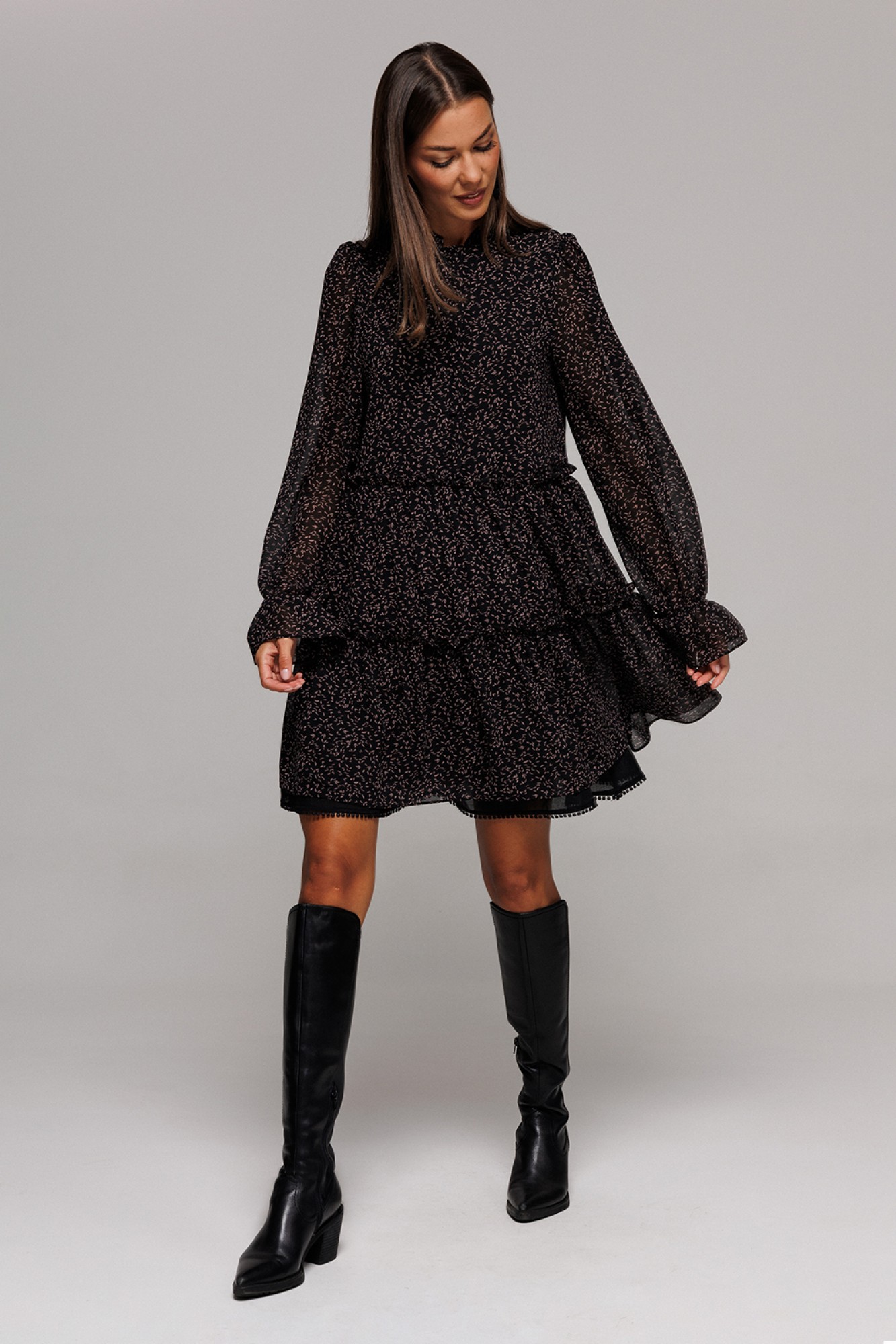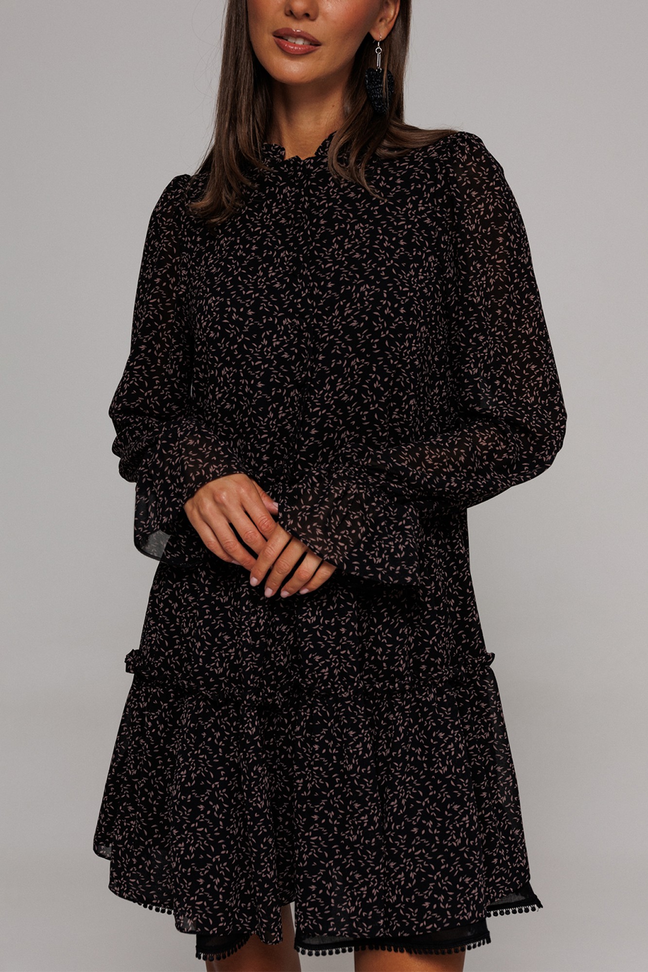 Платье шифоновое А-силуэта, отрезное по линии талии с рюшей. Втачной длинный рукав со сборкой по окату и внизу на резинке. По переду лиф с центральной застежкой на петли-пуговицы. Полочка и спинка с притачными, слегка присборенным воланом с рюшей из основной ткани и воланом из отделочной ткани по низу платья. Воротник-стойка с рюшей. Платье на подкладке.