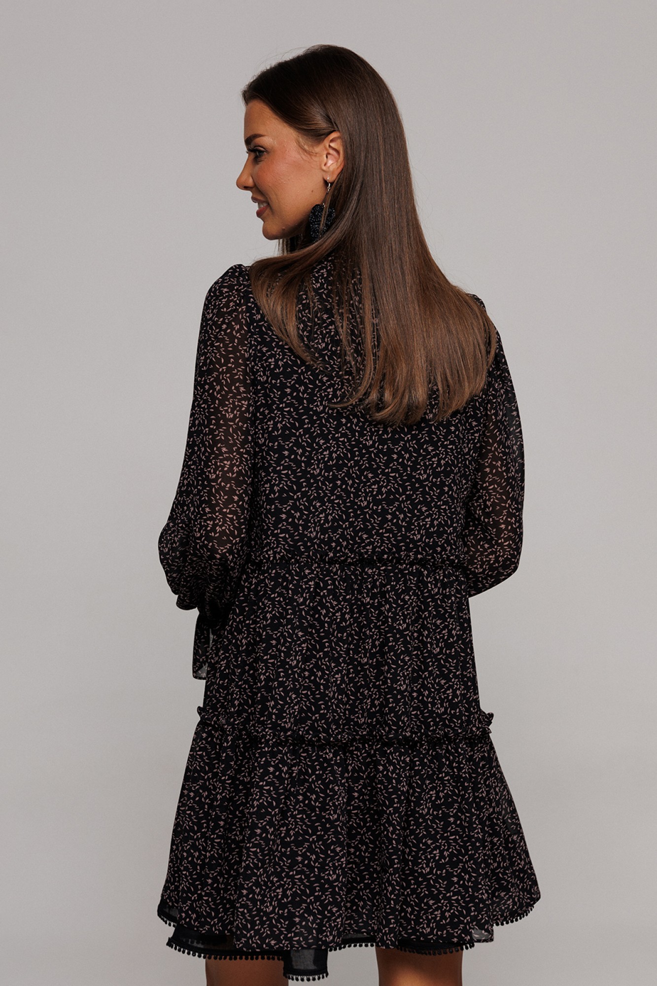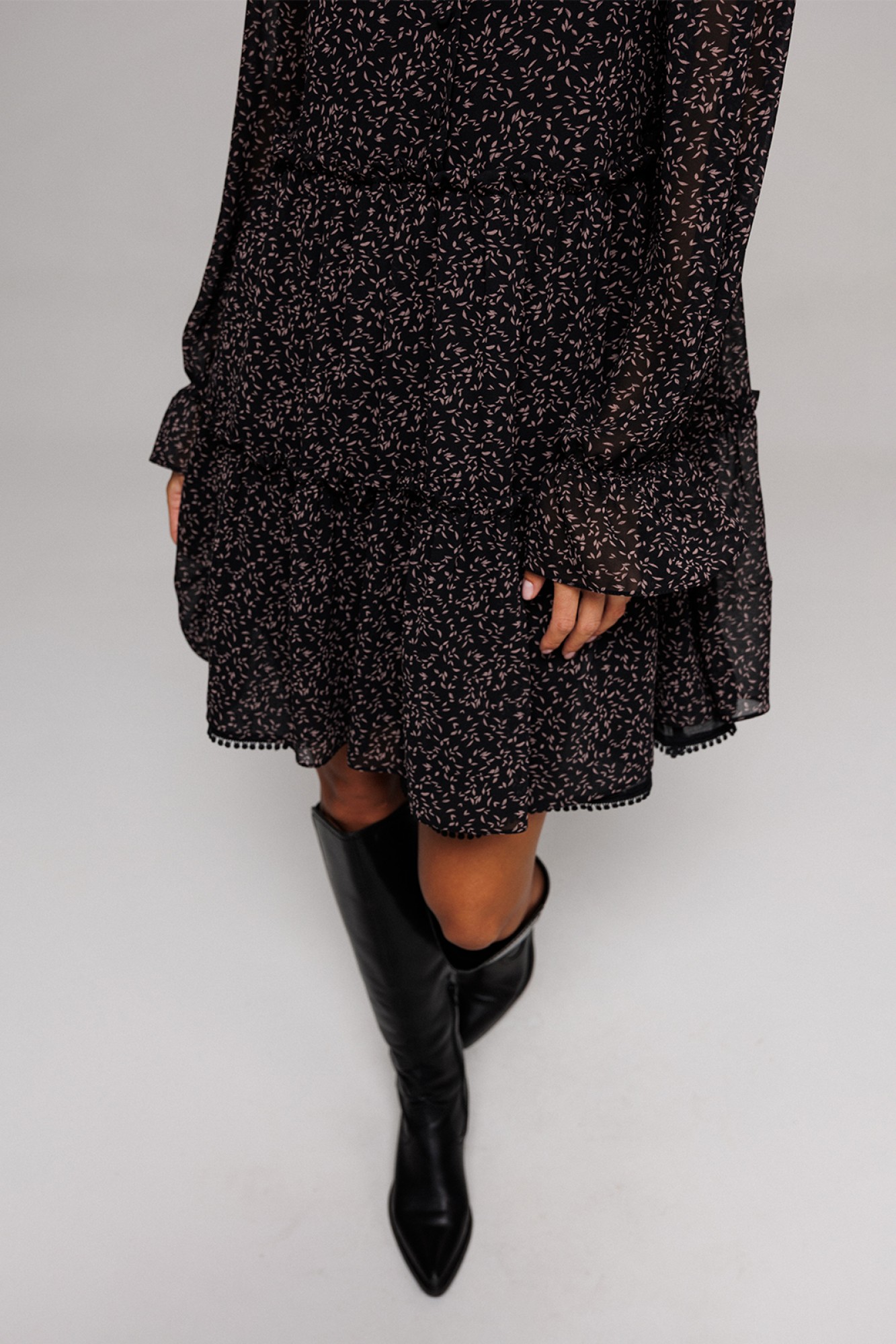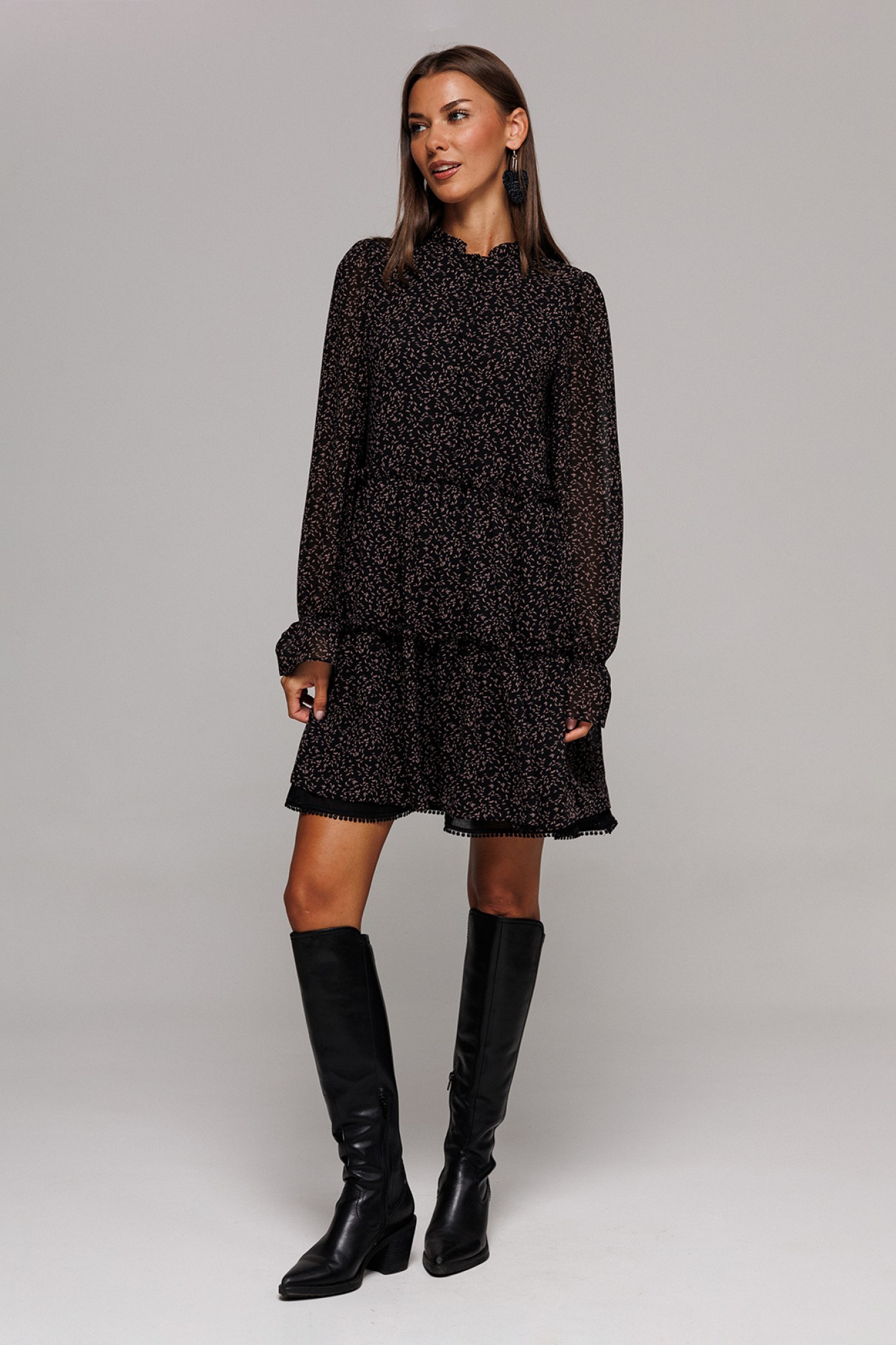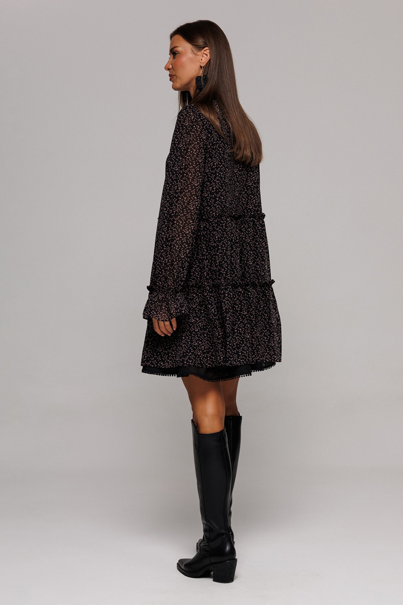 Платье шифоновое А-силуэта, отрезное по линии талии с рюшей. Втачной длинный рукав со сборкой по окату и внизу на резинке. По переду лиф с центральной застежкой на петли-пуговицы. Полочка и спинка с притачными, слегка присборенным воланом с рюшей из основной ткани и воланом из отделочной ткани по низу платья. Воротник-стойка с рюшей. Платье на подкладке.