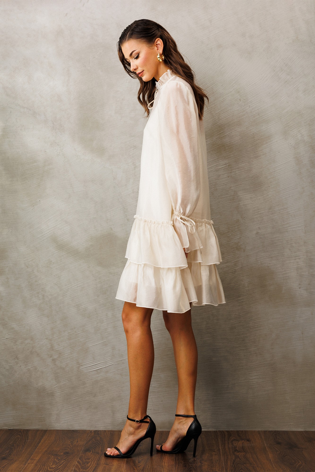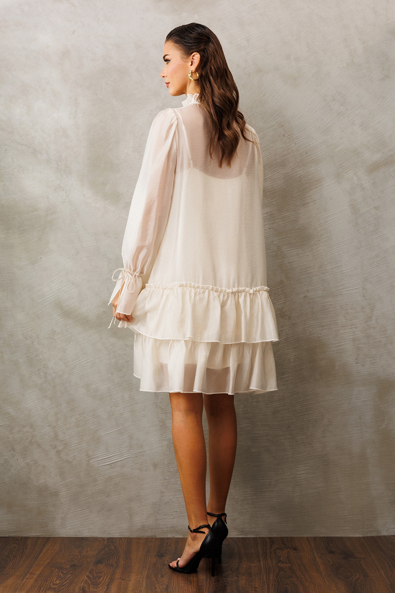 Платье из креп-шифона с напылением А-силуэта, состоящее из 2-х слоев. Верхний слой: Втачной длинный рукав со сборкой по окату и внизу на завязке, полочка и спинка с притачными слегка присборенным воланом с рюшей, воротник стойка-рюша и вырезом каплей по переду на завязке. Нижний слой: платье на бретелях.