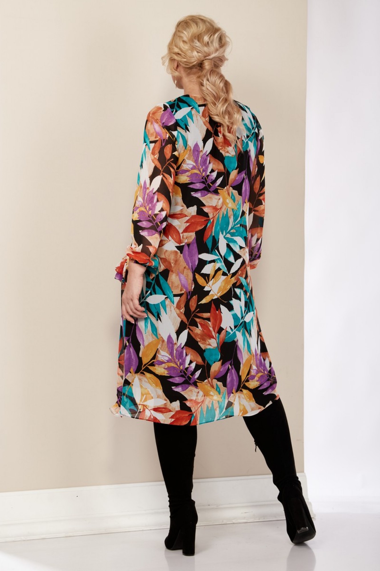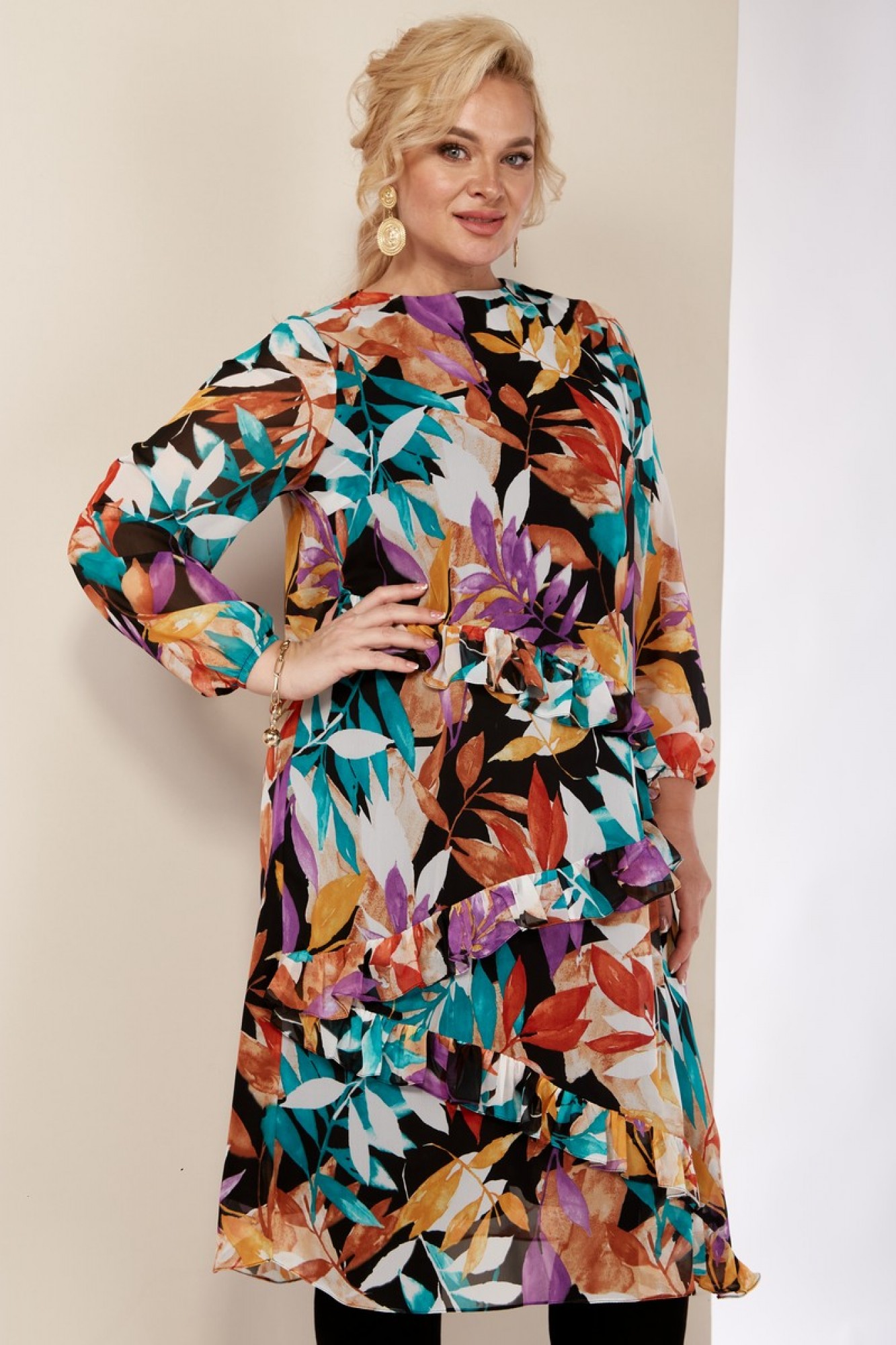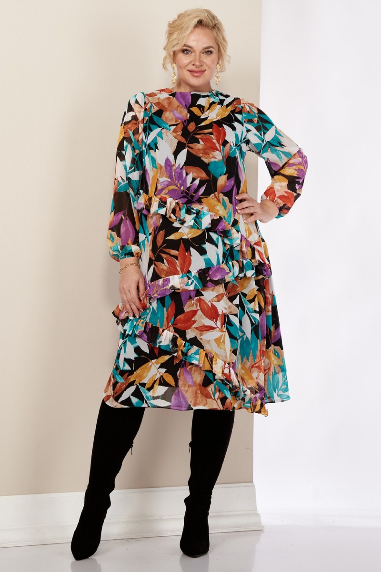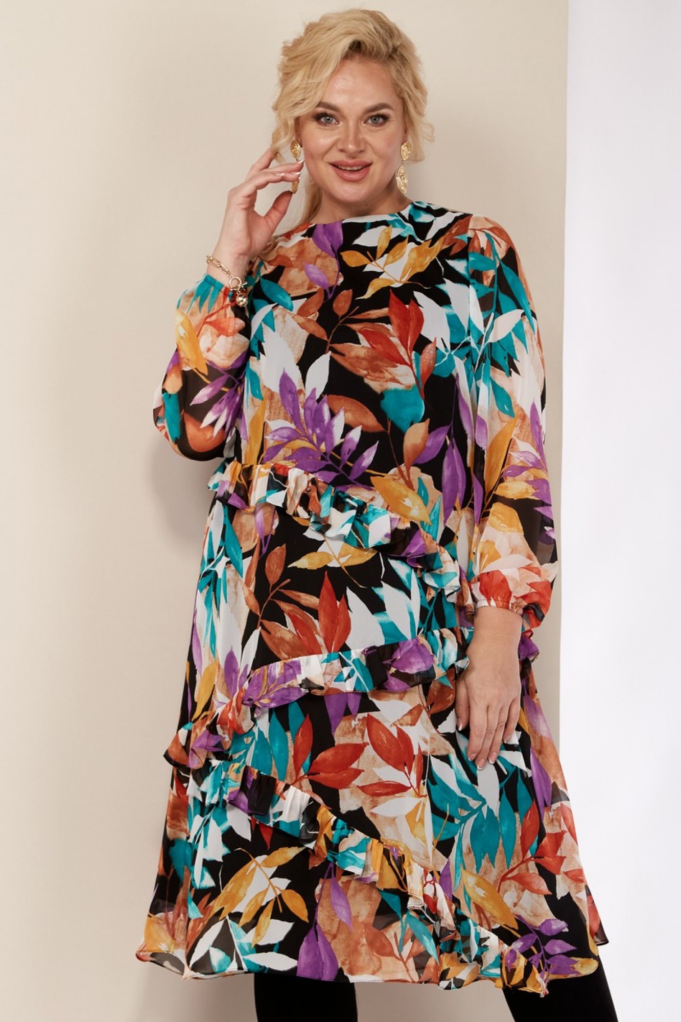 Полочка платья с асимметричными подрезами, в которые вставлены рюши, спинка цельная. Горловина округлая, застежка на навесную петлю и пуговицу на спинке. Рукав одношовный длинный, низ на резинке.