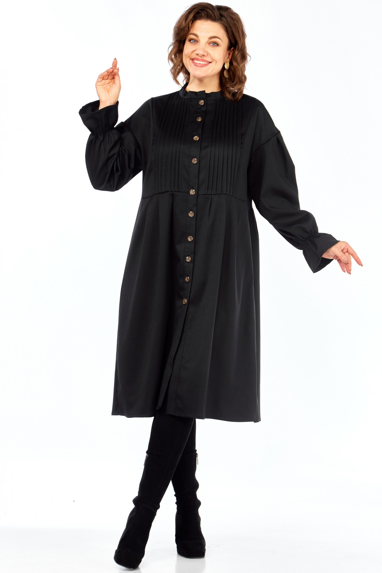 Идеальное платье для современной женщины! Натуральный состав ткани позволяет коже дышать, обеспечивая максимальный комфорт на протяжении всего дня. Платье свободного кроя, с округлой горловиной обработанной воротником стойкой. Застежка центральная на петли и пуговицы позволяет регулировать глубину выреза. Рукав платья со спущенным плечом и манжетой на резинке создают непринужденный и элегантный силуэт. Центральная часть полочки обработана односторонними складками, линия талии подчеркнута легкой сборкой (защипы). В комплекте идет пояс, который подчеркивает женственные формы, и при этом не сковывает движений. В платье есть внутренние карманы в боковых швах, что придает удобства платью. Ткань не тянется. Длина платья 106 см, длина рукава 69см с учетом приспущенного плеча.