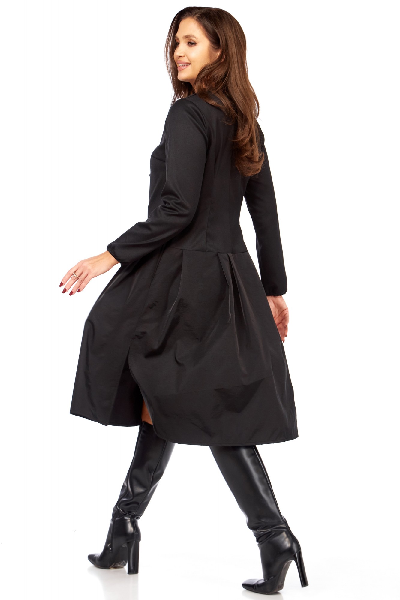Платье с характером: Ваша новая визитная карточка стиля! Устали от обыденности? Ищете платье, которое расскажет о вас без слов? Встречайте модель, сочетающую в себе изысканность и смелый дизайн! Это миди-платье притягивает взгляд своей нестандартной асимметричной застежкой. Ряд контрастных светлых пуговиц, словно жемчужная дорожка, подчеркивает изящный крой и придает образу особую динамику и утонченность. Она не только придает платью неповторимый шарм, но и визуально вытягивает силуэт, делая его еще более стройным и грациозным. Идеальный крой – приталенный лиф, подчеркивающий талию, и расклешенная юбка со складками, создающая воздушный и женственный силуэт. Длинные рукава добавляют завершенности и элегантности. Это платье в глубоком черном цвете — настоящая находка для тех, кто ценит универсальность без компромиссов в стиле. Оно одинаково великолепно смотрится с лодочками для делового мероприятия, с ботильонами для похода в театр или с высокими сапогами для осенней прогулки. Почувствуйте себя неотразимой! Комфортное, стильное и абсолютно уникальное – оно создано, чтобы вы чувствовали себя на высоте. Откройте для себя совершенство в деталях!
