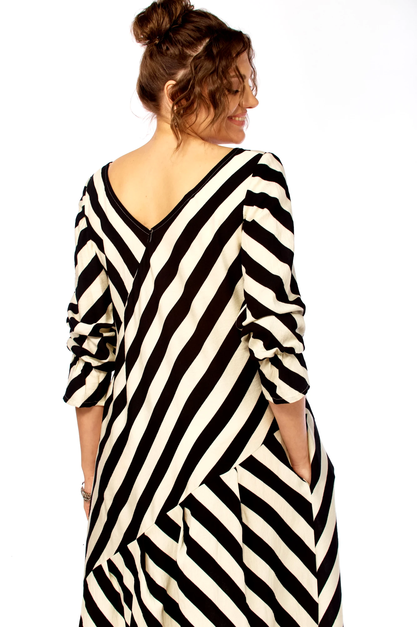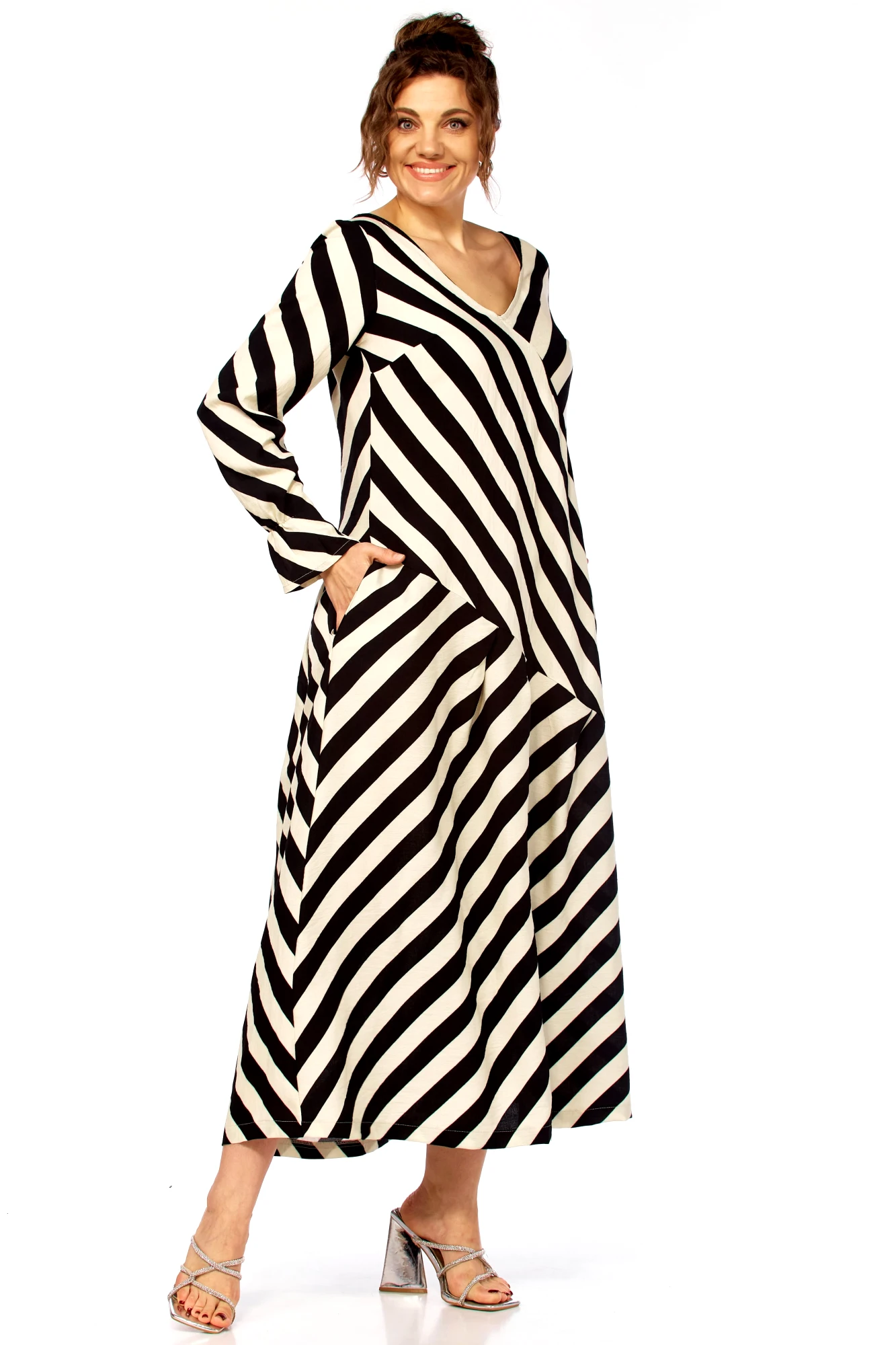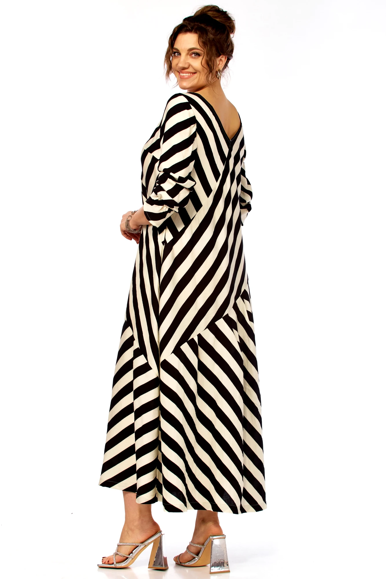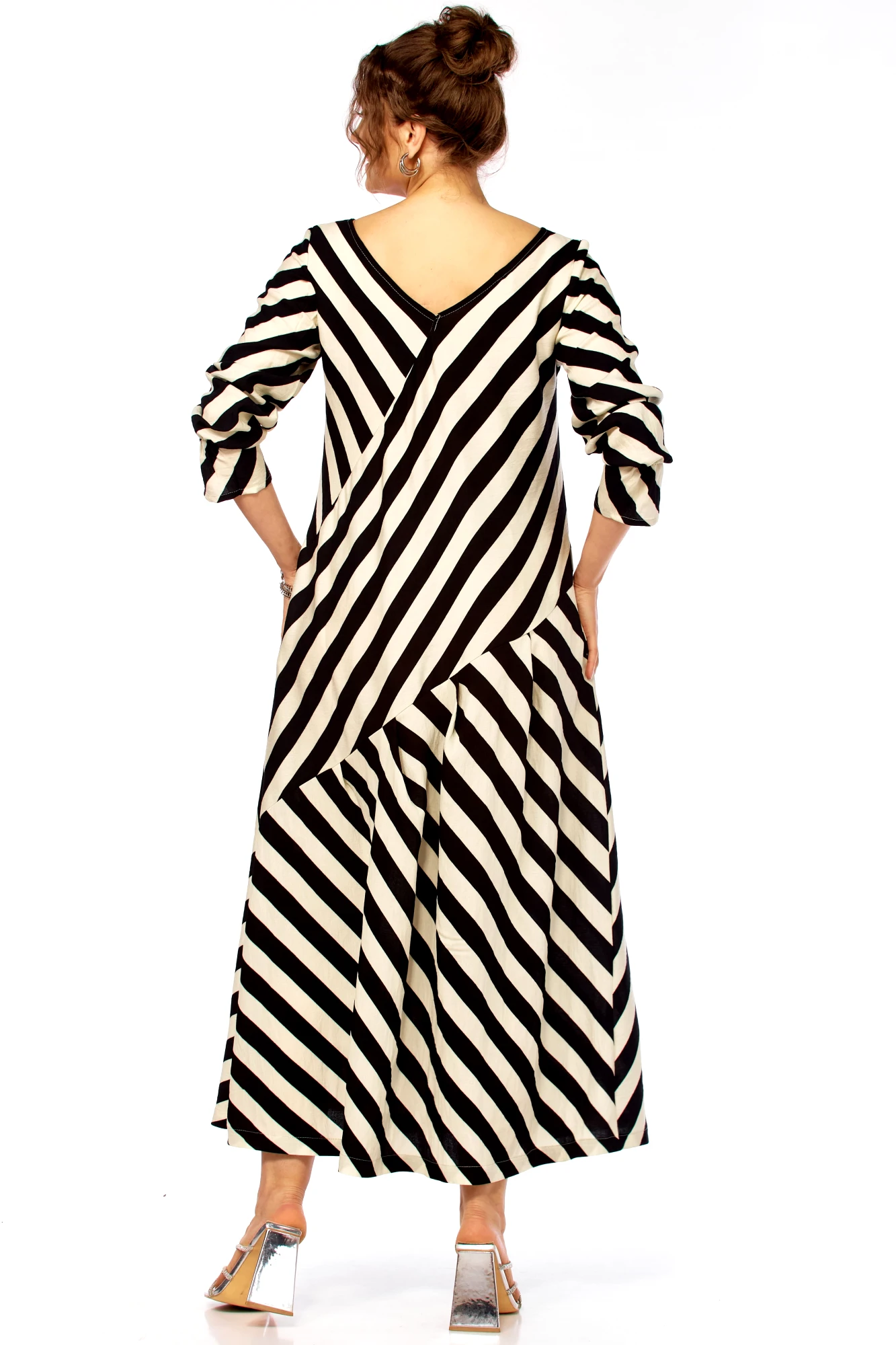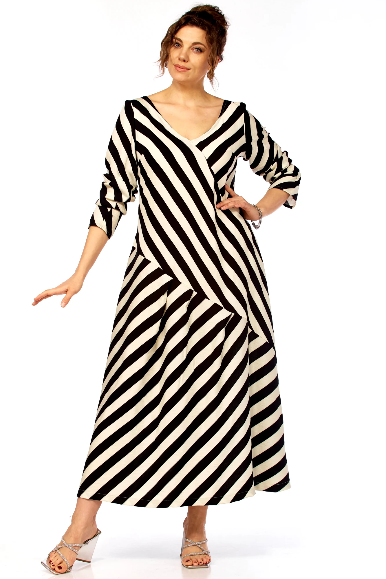 Ищете платье, которое само «строит» фигуру? Представляем безупречное воплощение элегантности и динамики. Это не просто платье в полоску — это платье продумано до мелочей для создания образа уверенной, стильной и современной женщины. Уникальный крой с чередованием направлений полоски создает мощный визуальный эффект. Диагональные линии мгновенно «вытягивают» силуэт, скрывают нюансы в области талии и бедер, делая фигуру более стройной и грациозной. V-образный вырез благородное декольте и такой же глубокий вырез на спинке открывают линию шеи и ключиц, добавляя образу хрупкости и женственности, при этом оставаясь в рамках делового этикета. Свободный А-силуэт не сковывает движений, а мягкие складки юбки красиво играют при ходьбе. Приятный бонус — незаметные, функциональные карманы в боковых швах. Рукав длинный (62см) с изящной сборкой на манжете позволяет регулировать длину и добавляет образу легкости. Длина платья 130см Сочетание классического черного и молочного — это инвестиция в гардероб, которая никогда не выйдет из моды.