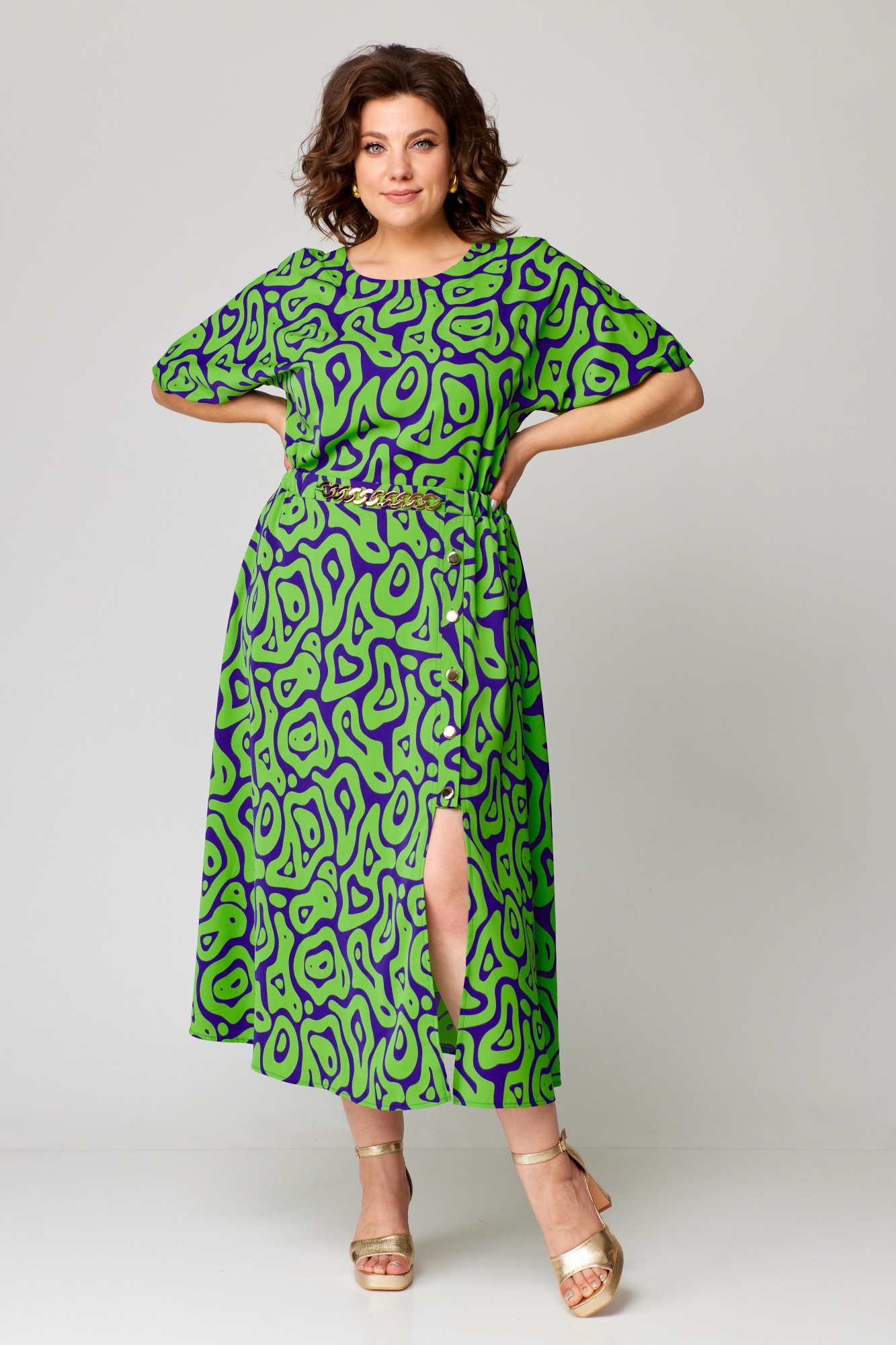 Идеальное платье для торжественных мероприятий и романтических прогулок. Платье в длине миди из качественной плательной ткани с вискозой в составе. Горловина округлая с внутренней обтачкой и отделочной строчкой, по спинке глубокий разрез и застежка на навесную петлю и пуговицу. Крой рукава «кимано» делает платье очень привлекательным, рукав свободный. Платье отрезное по линии талии, частично на эластичной резинке шириной 3 см, по переду выполнен притачной пояс с декоративным элементом в виде цепочки, которую при необходимости можно снять. Декоративные элементы изящно подчеркивают линию талии, позволяя одновременно чувствовать себя комфортно и удобно. Нижняя часть платья в виде расклешенной юбки, легкой и струящейся. По переду юбки с левой стороны расположены притачные планки с отделочными строчками и застежкой на петли пуговицы. Длина застежки до колена, к низу платье с эффектным глубоким разрезом. Элегантное и летящее, оно обеспечит восторженные взгляды.