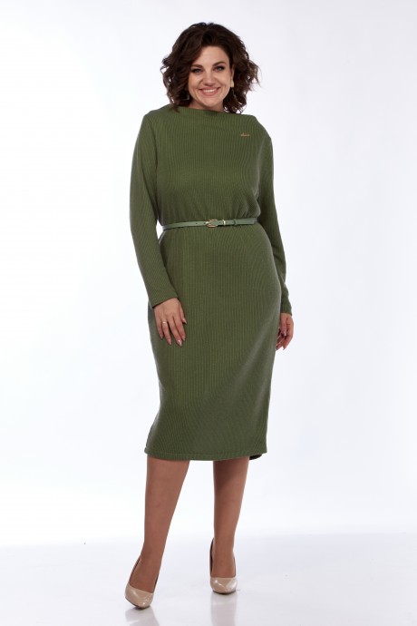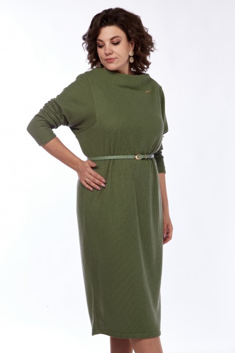 Платье женское, полуприлегающего силуэта, по спинке средний шов, заканчивающийся внизу разрезом. Пройма квадратная, рукав втачно одношовный, зауженный к низу. Воротник- цельнокроеная стойка с расширенной горловиной. В качестве отделки используется фурнитура. Пояс в данном размерном ряду в комплект НЕ входит.