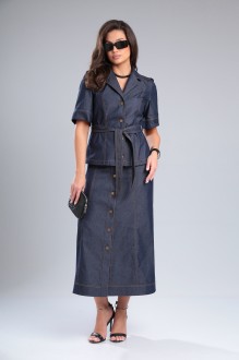 Платье из жаккардовой стрейчевой ткани. Отрезное по линии талии, юбка А-образная с боковыми карманами и отделочной складкой в заутюжку. Воротник отложной с лацканам, застежка на петли пуговицы. Рукав втачной короткий со сборкой, на манжете.