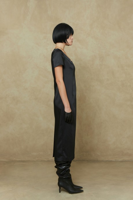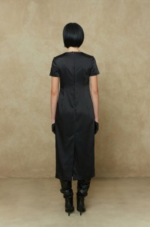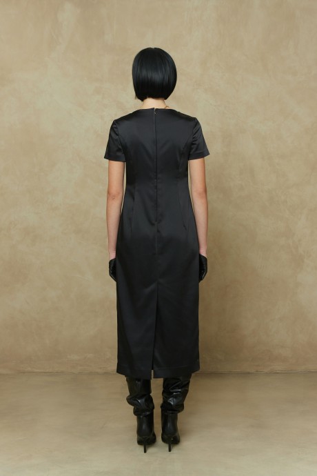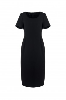 Платье женское полуприлегающего силуэта, длиной ниже колена. В среднем шве спинки застежка на потайную молнию и шлица по низу. Рукав короткий.