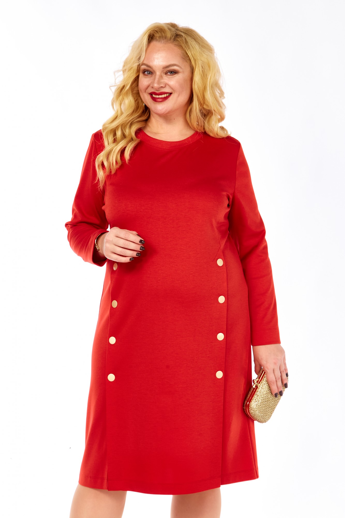 Стильное платье полуприлегающего силуэта выполнено из трикотажной ткани, контрастные декоративные пуговицы визуально создают красивый акцент. Фасон интересен тем, что модельные линии, как нельзя лучше подчеркивают плавные изгибы женской фигуры. Вырез горловины классический овальный. Рукав втачной, полной длины.