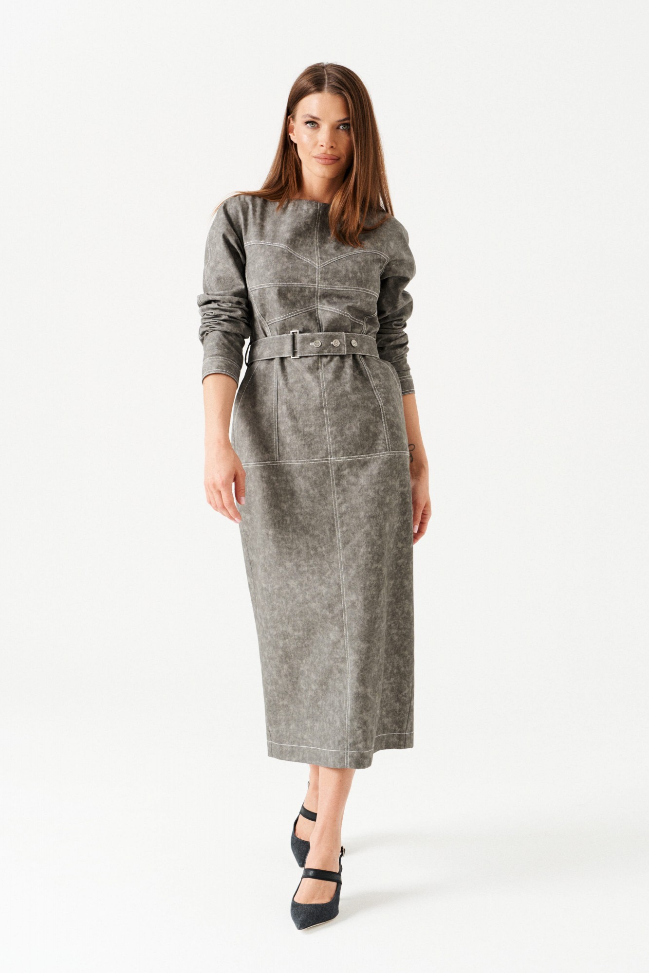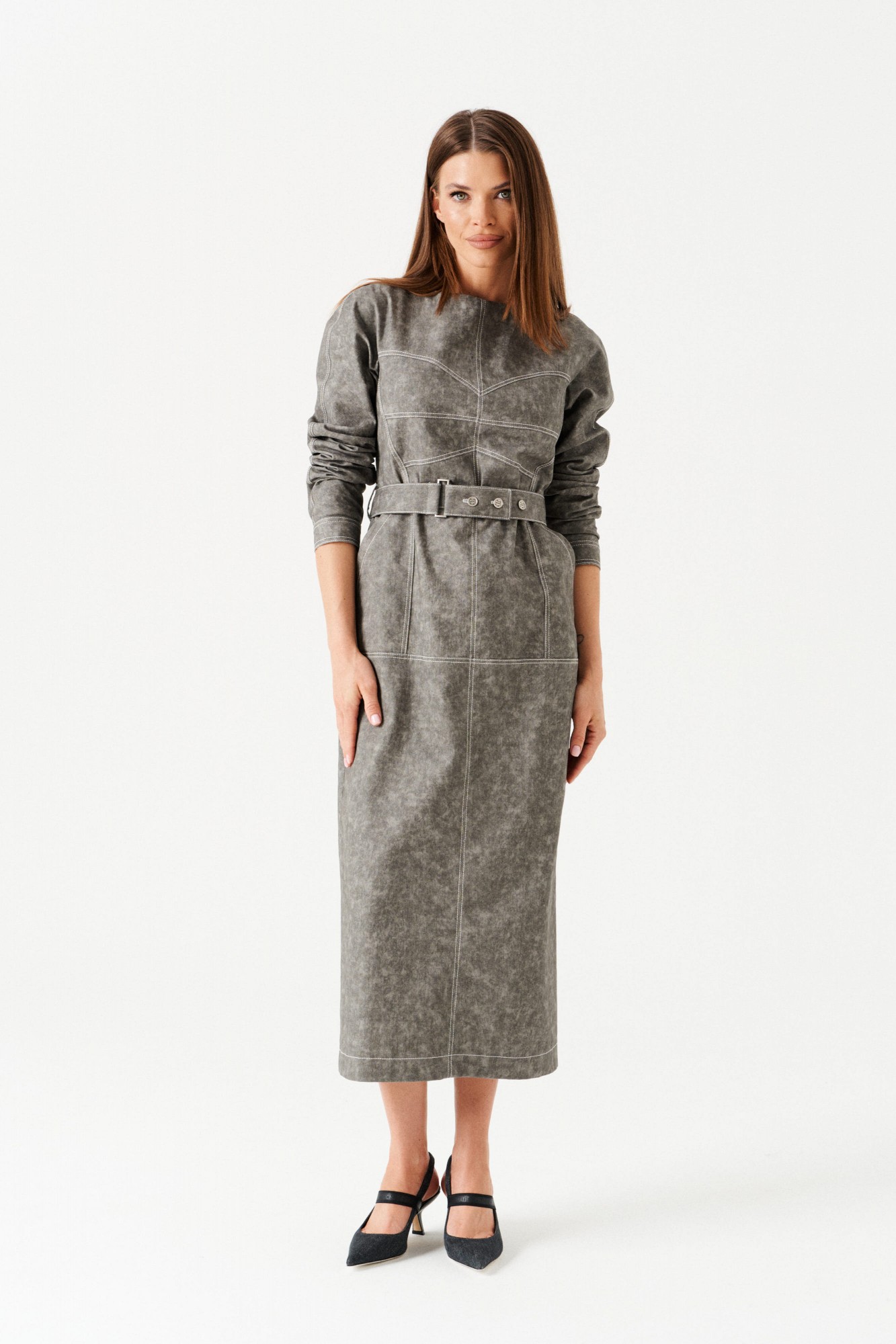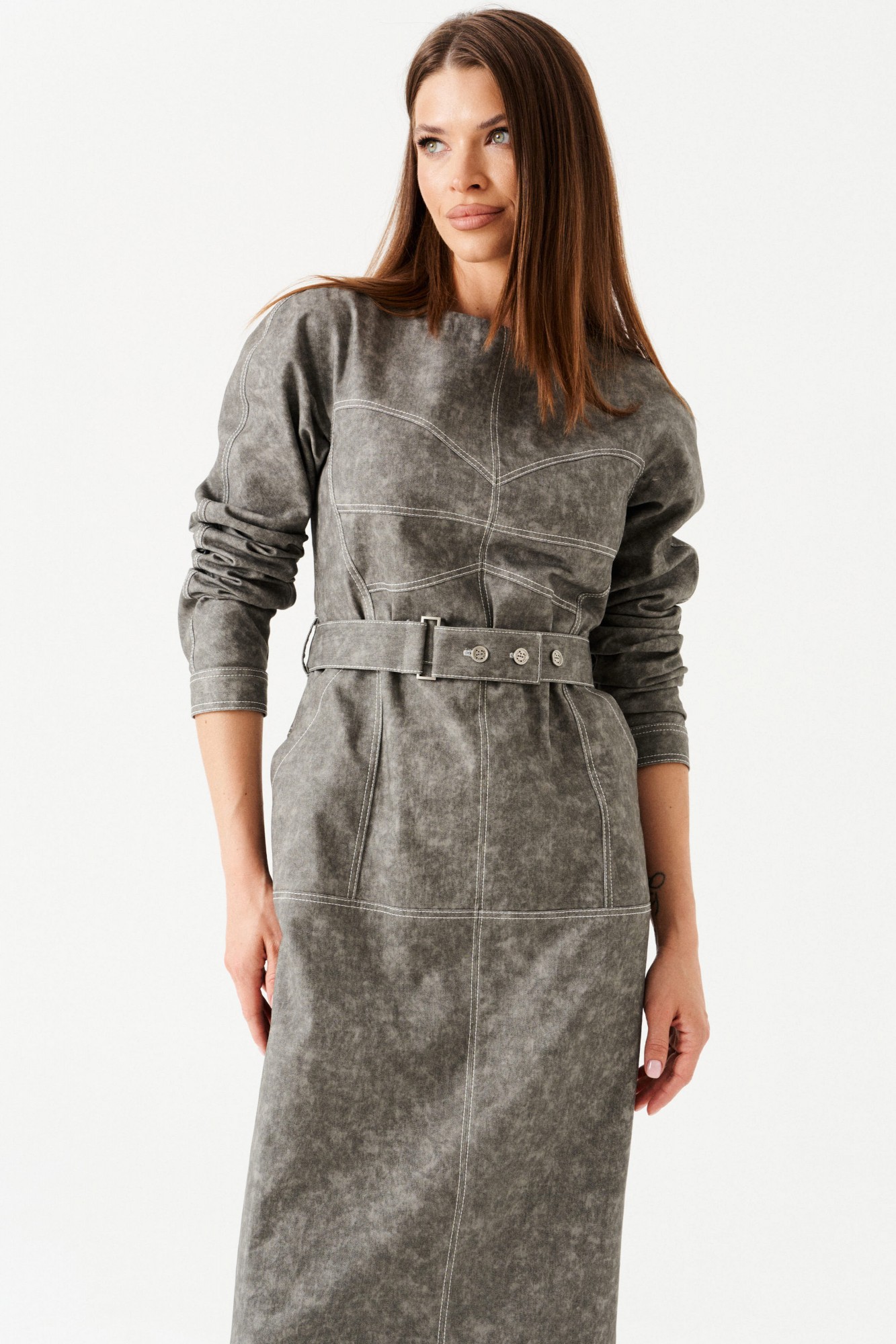 Платье женское из джинсовой хлопковой ткани, отрезное, длинное, полуприлегающего силуэта, с застежкой на потайную молнию в среднем шве спинки. Перед с круглым вырезом горловины, средним швом, горизонтальным подрезом на уровне линии бедер, накладными карманами с отрезным бочком, декоративно-конструктивными корсетными линиями с контрастной отстрочкой. Верхняя часть спинки с рельефами. Нижняя часть спинки с кокеткой и шпицей. Рукав — реглан, по низу манжета с застежкой на петли и пуговицы. В комплекте съемный пояс из основной ткани, на резинке, с застежкой на петли и пуговицы.