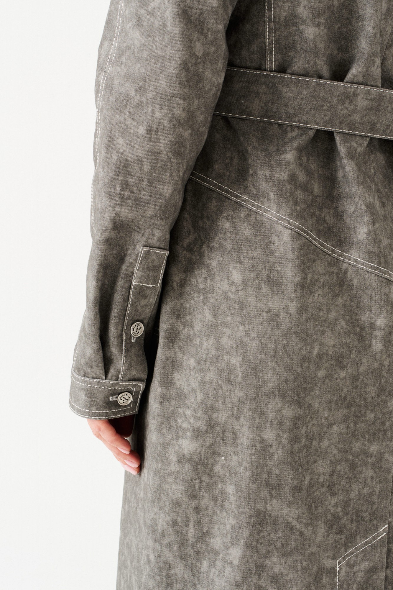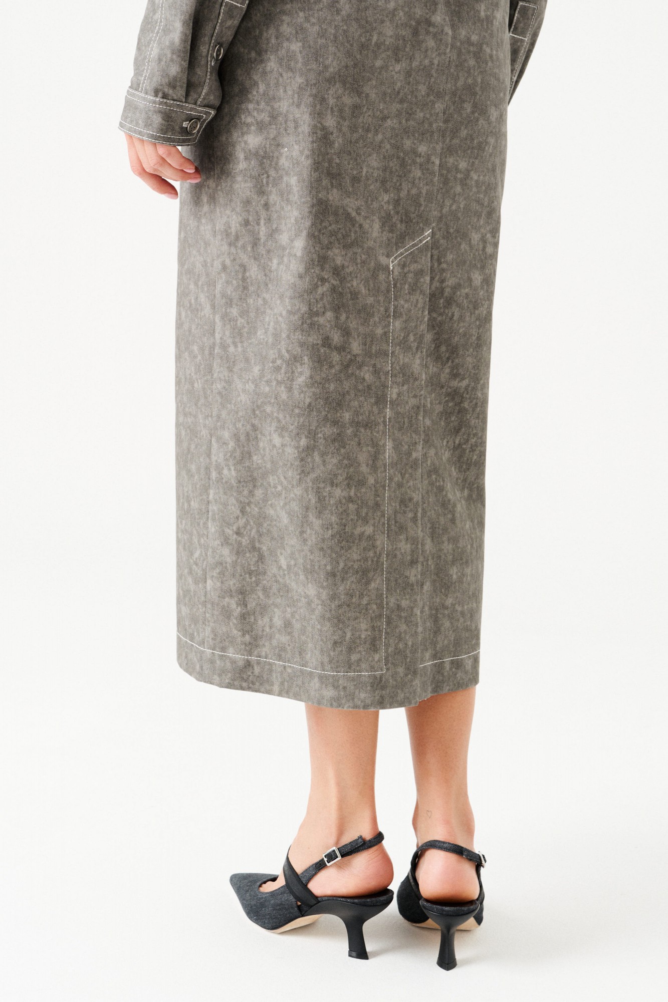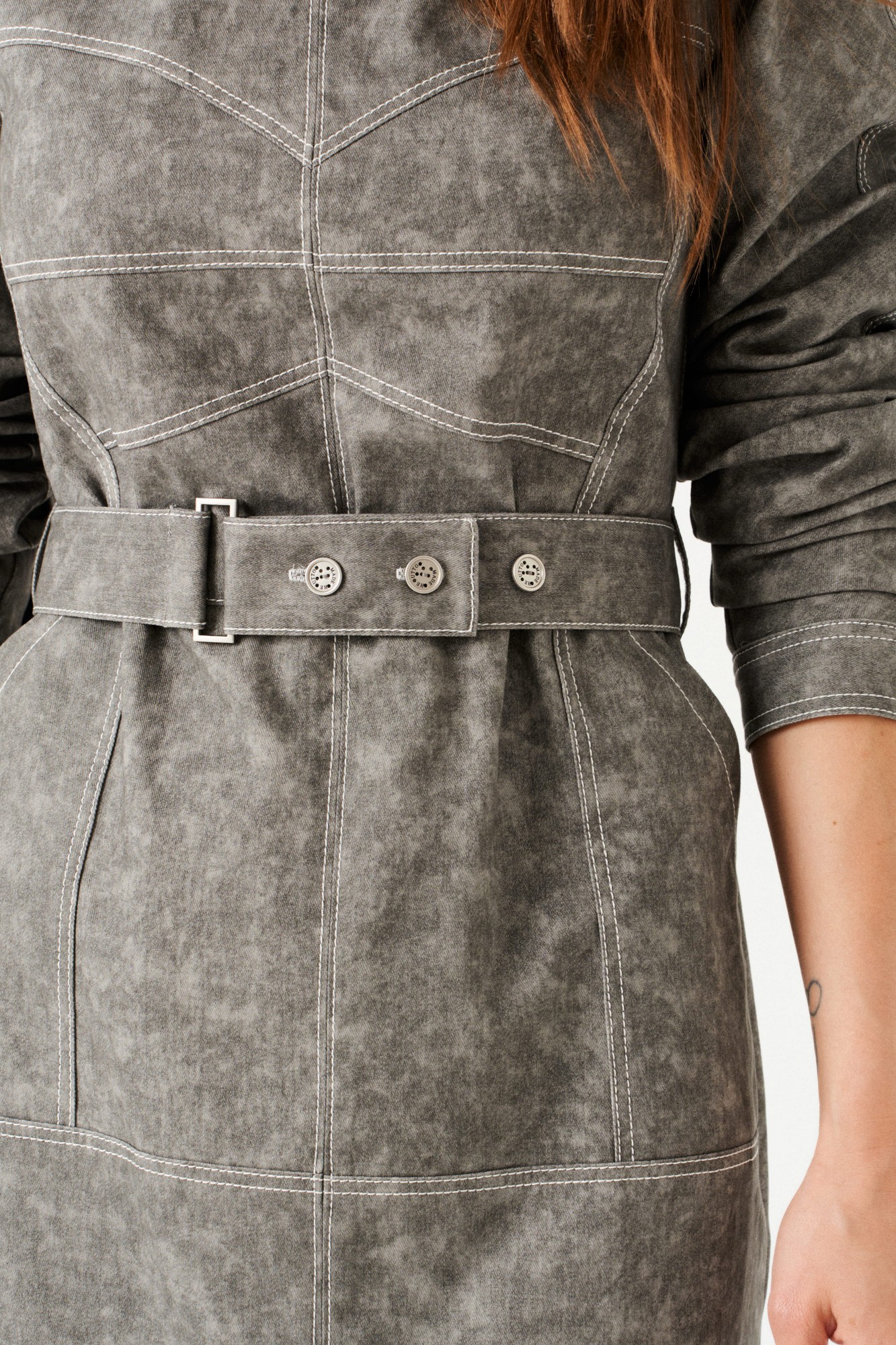 Платье женское из джинсовой хлопковой ткани, отрезное, длинное, полуприлегающего силуэта, с застежкой на потайную молнию в среднем шве спинки. Перед с круглым вырезом горловины, средним швом, горизонтальным подрезом на уровне линии бедер, накладными карманами с отрезным бочком, декоративно-конструктивными корсетными линиями с контрастной отстрочкой. Верхняя часть спинки с рельефами. Нижняя часть спинки с кокеткой и шпицей. Рукав — реглан, по низу манжета с застежкой на петли и пуговицы. В комплекте съемный пояс из основной ткани, на резинке, с застежкой на петли и пуговицы.
