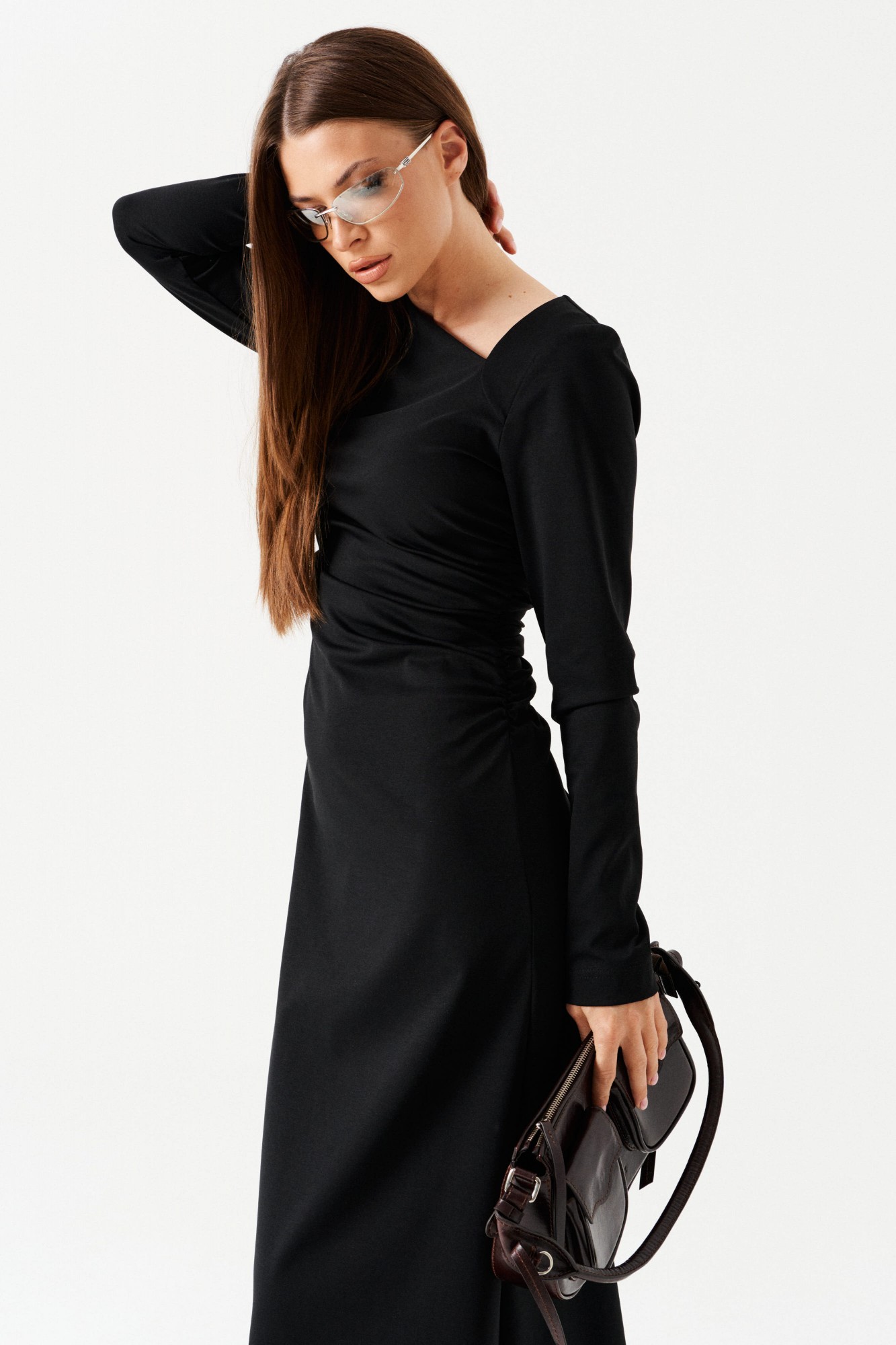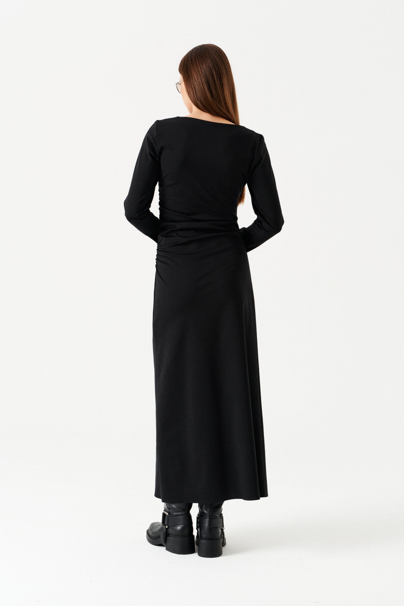Платье женское из трикотажного полотна, прилегающего силуэта, длинное, с асимметричным вырезом горловины. Перед с нагрудными вытачками. Спинка цельная. В левом боковом шве сборка на резинку. Рукав втачной, длинный.