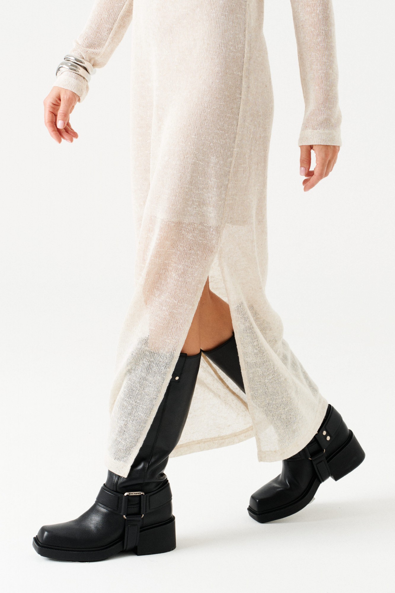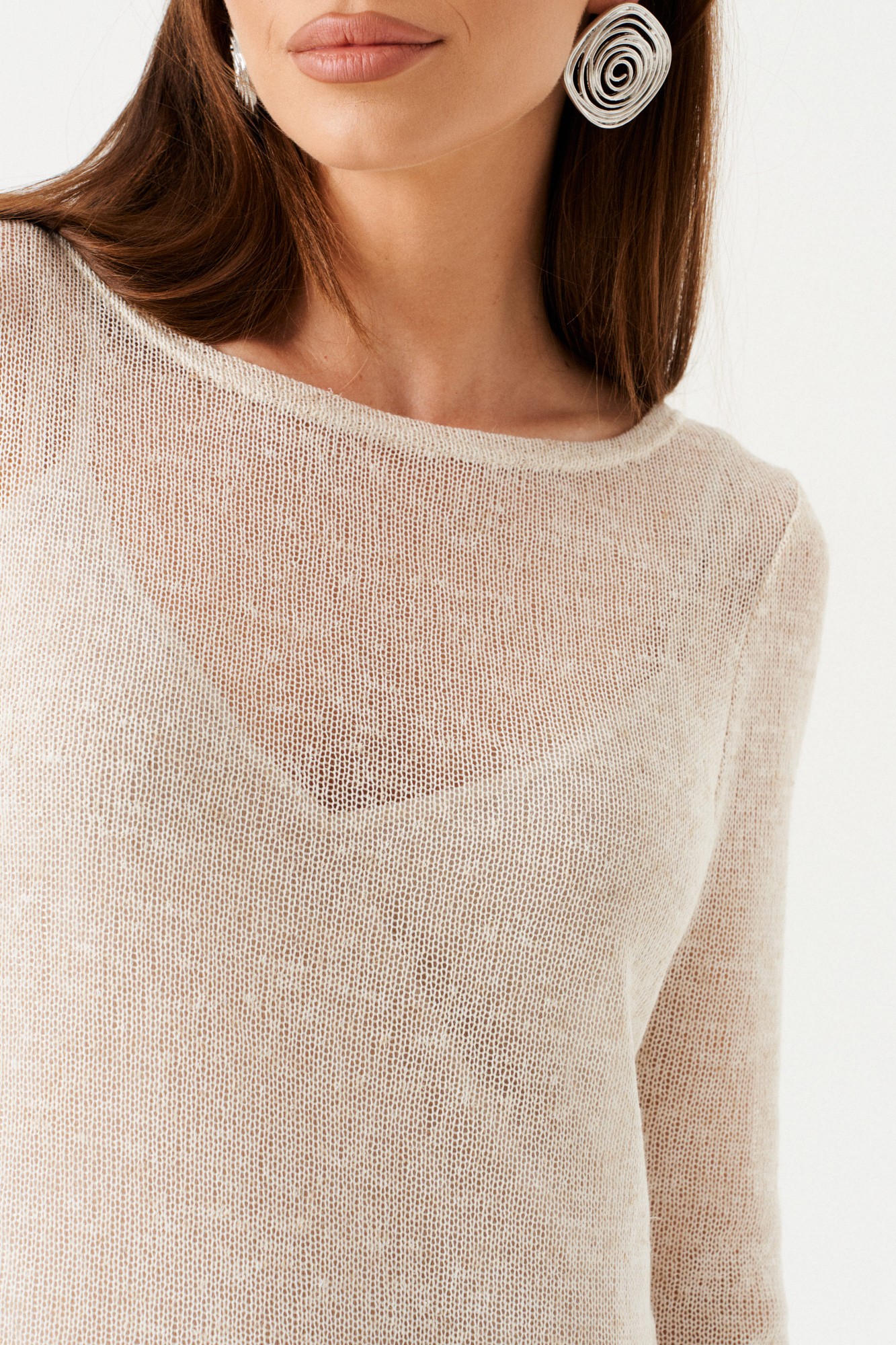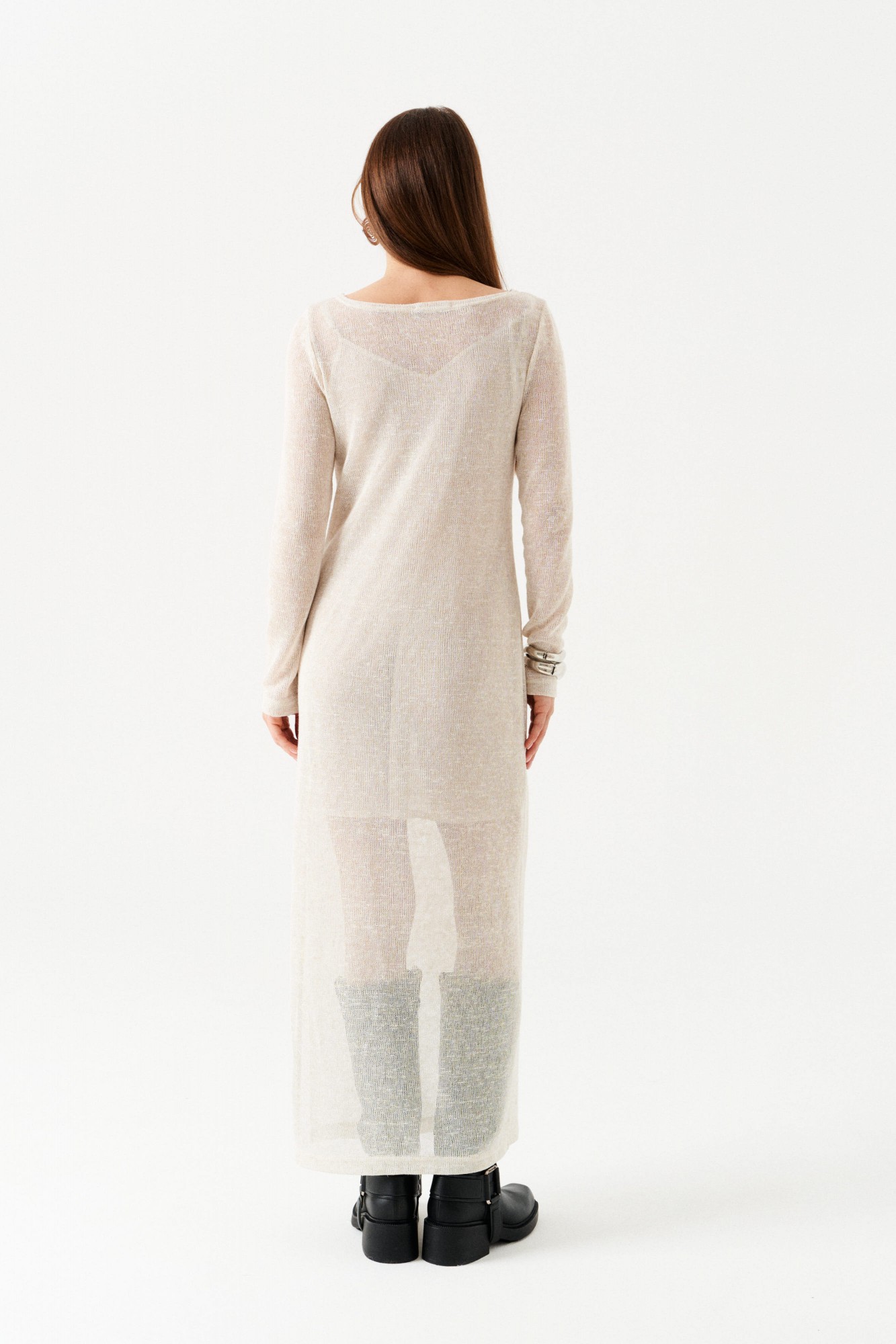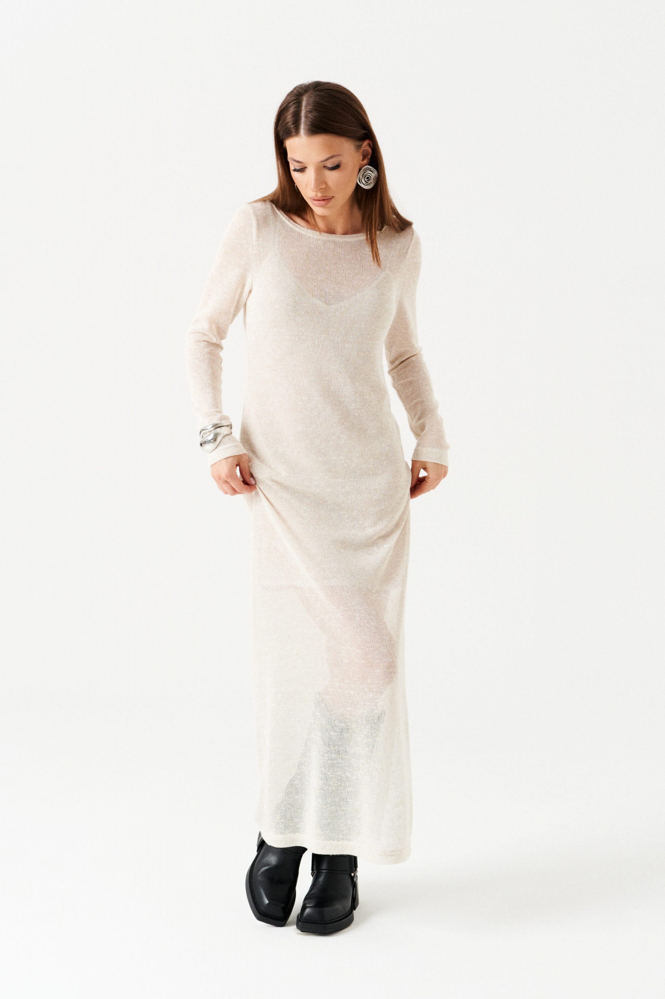 Двойное платье из трикотажного полотна. Верхнее платье прямого силуэта, с круглым вырезом горловины. Длина – макси. Нижнее платье полуприлегающего силуэта на бретелях из основной ткани. Длина нижнего платья – до колен.