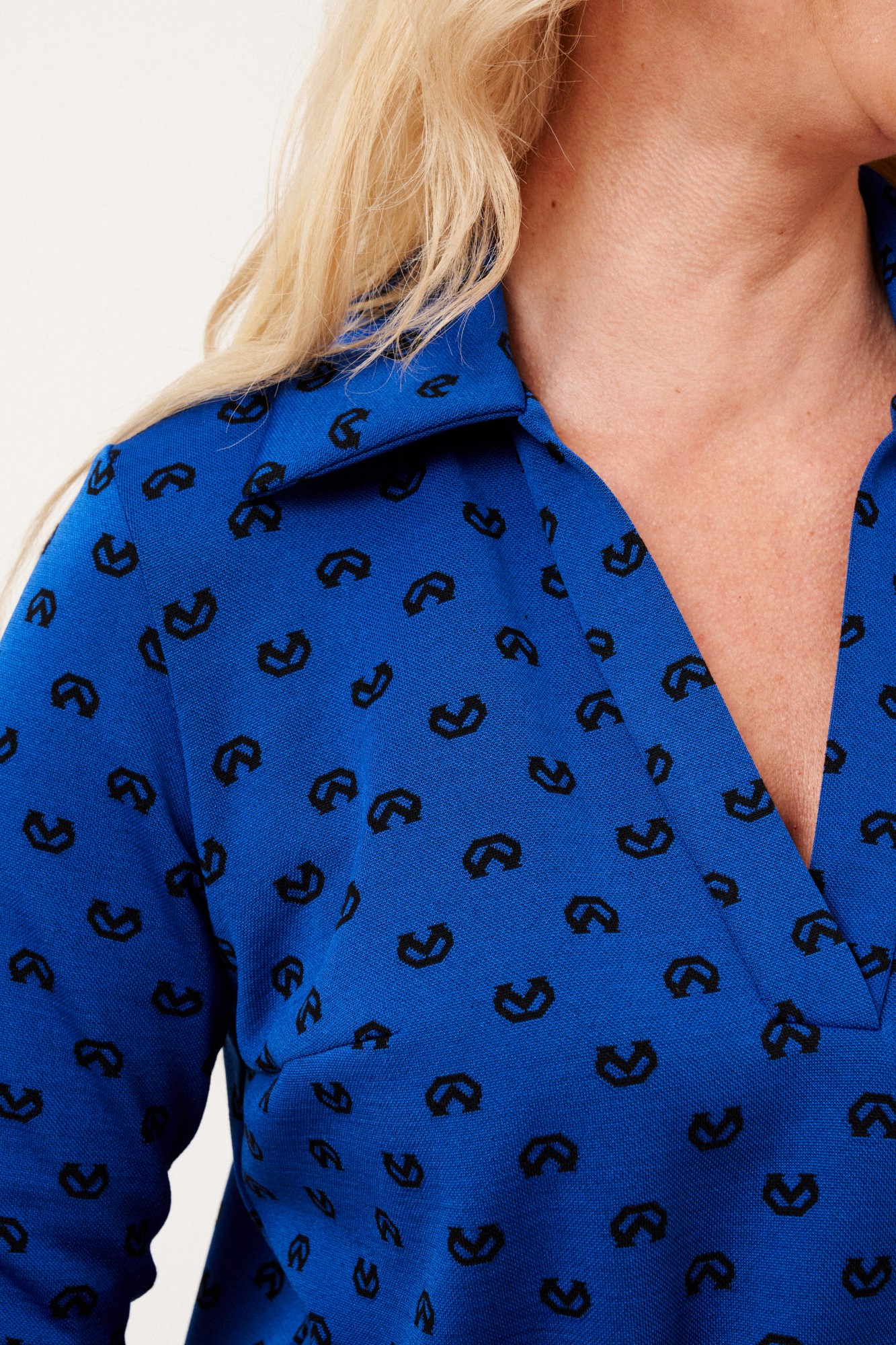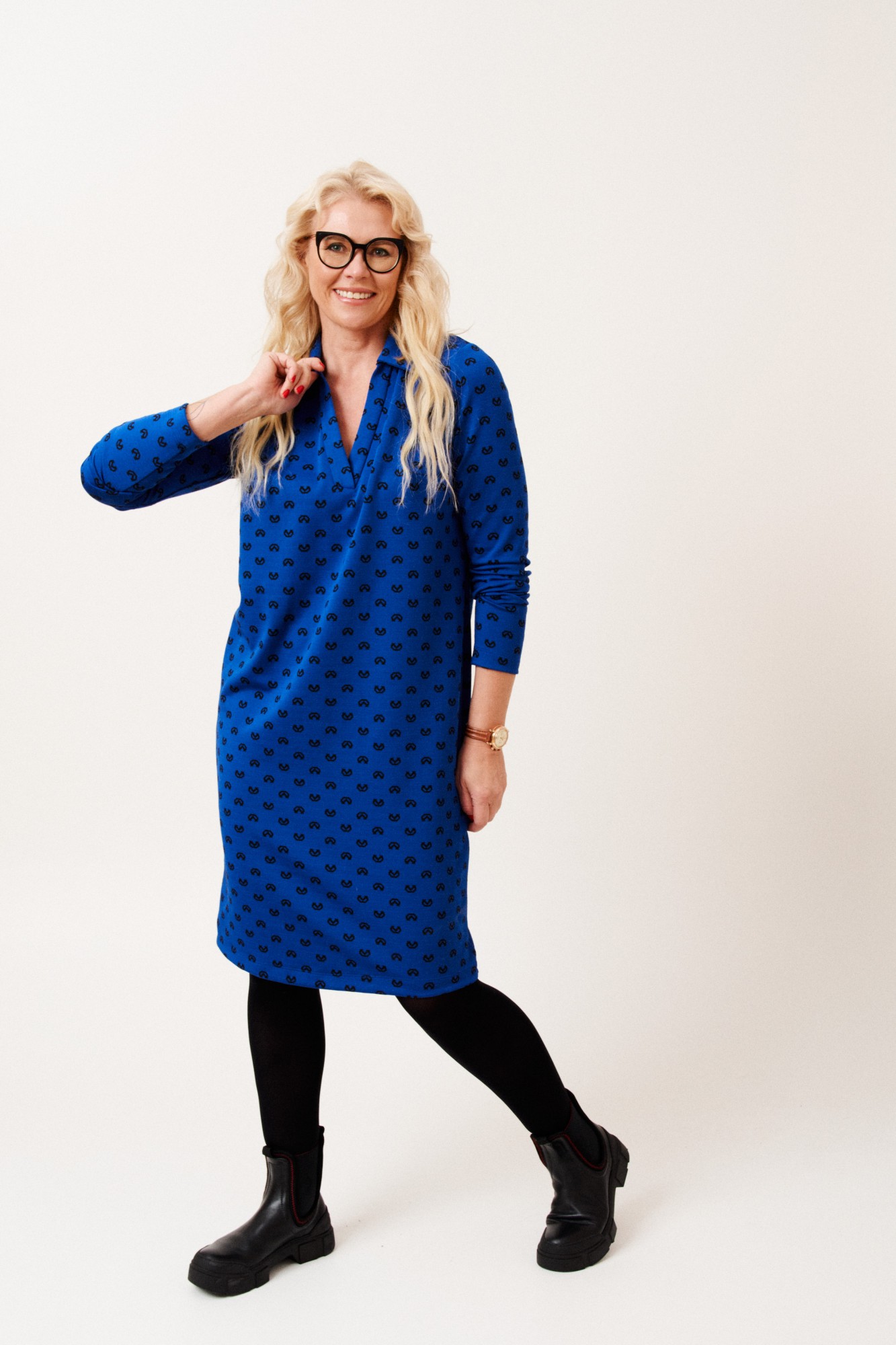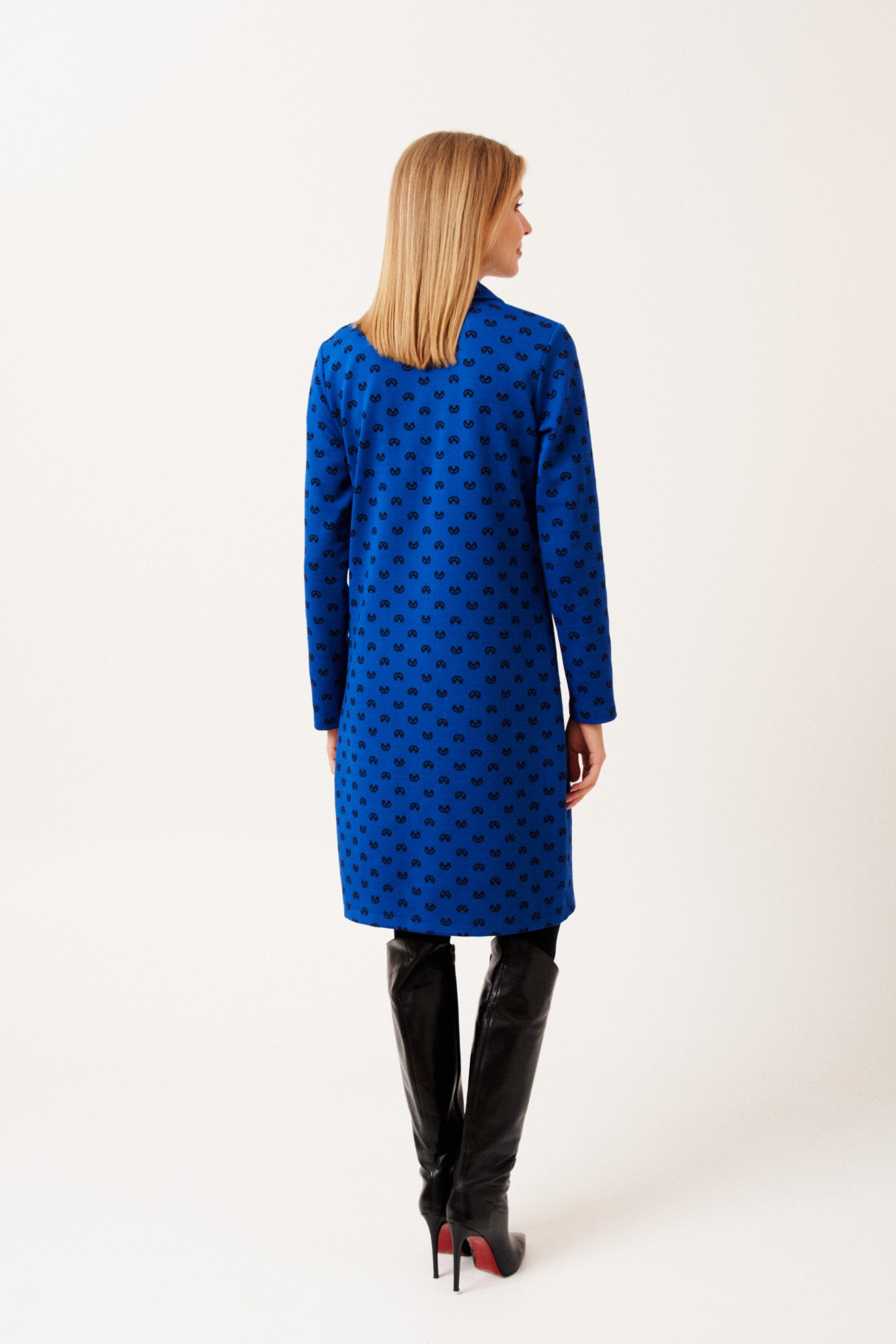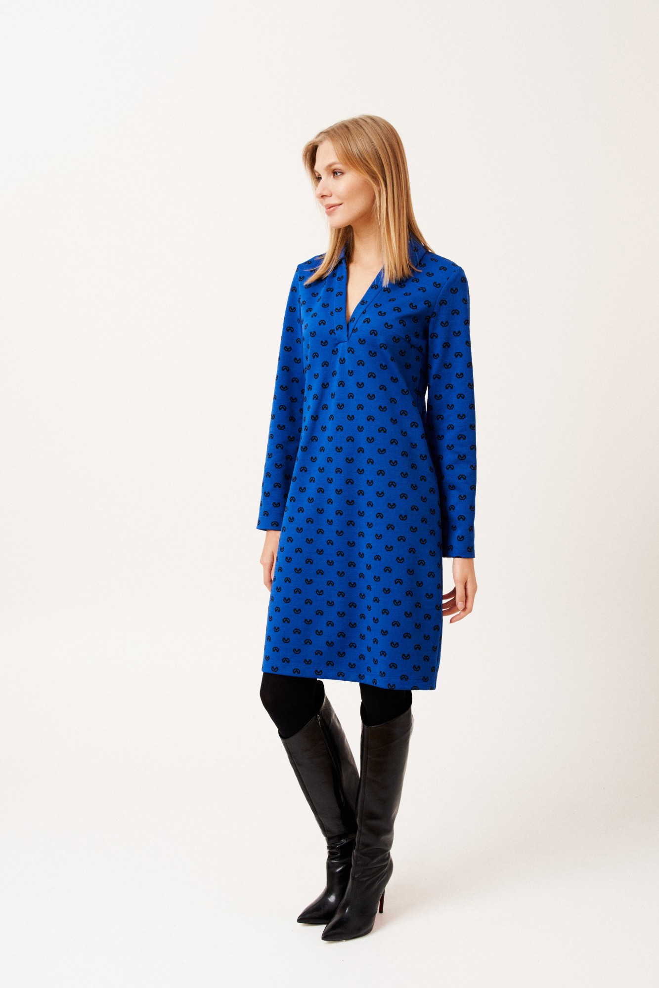 Платье женское, прямого силуэта, длиной ниже линии колен из трикотажной ткани. Перед с нагрудными вытачками. Рукав одношовный, втачной, длинный. Вырез горловины V-образный. Воротник отложной.