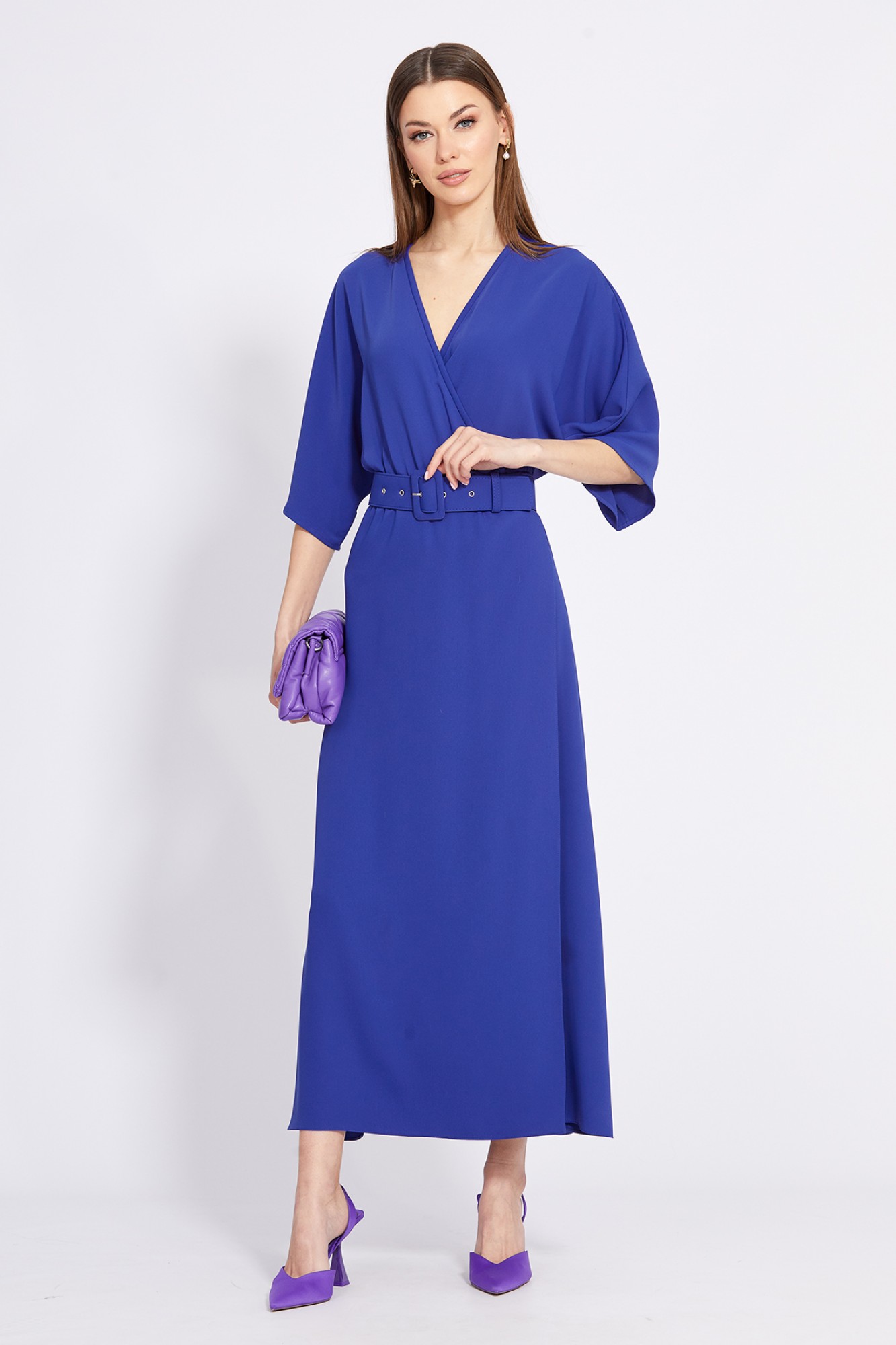 Платье выполнено из однотонной плательной ткани. Платье полуприлегающего силуэта, отрезное по линии талии, длиной миди. Перед лифа и юбки выполнен "на запах". Спинка цельная. Горловина V-образной формы. Рукав покроя "кимоно", длиной до локтя. По талии настрочена эластичная тесьма. В комплект входит съемный ремень с обтяжной пряжкой.