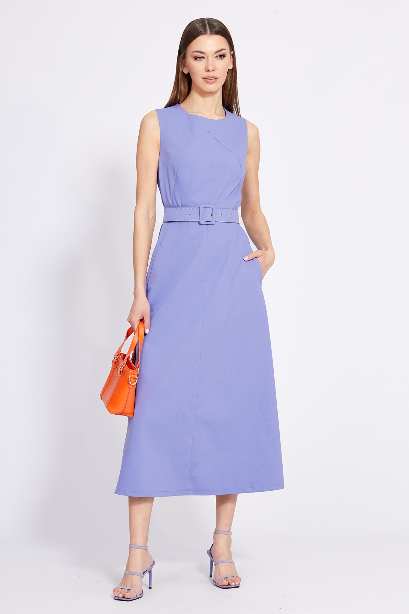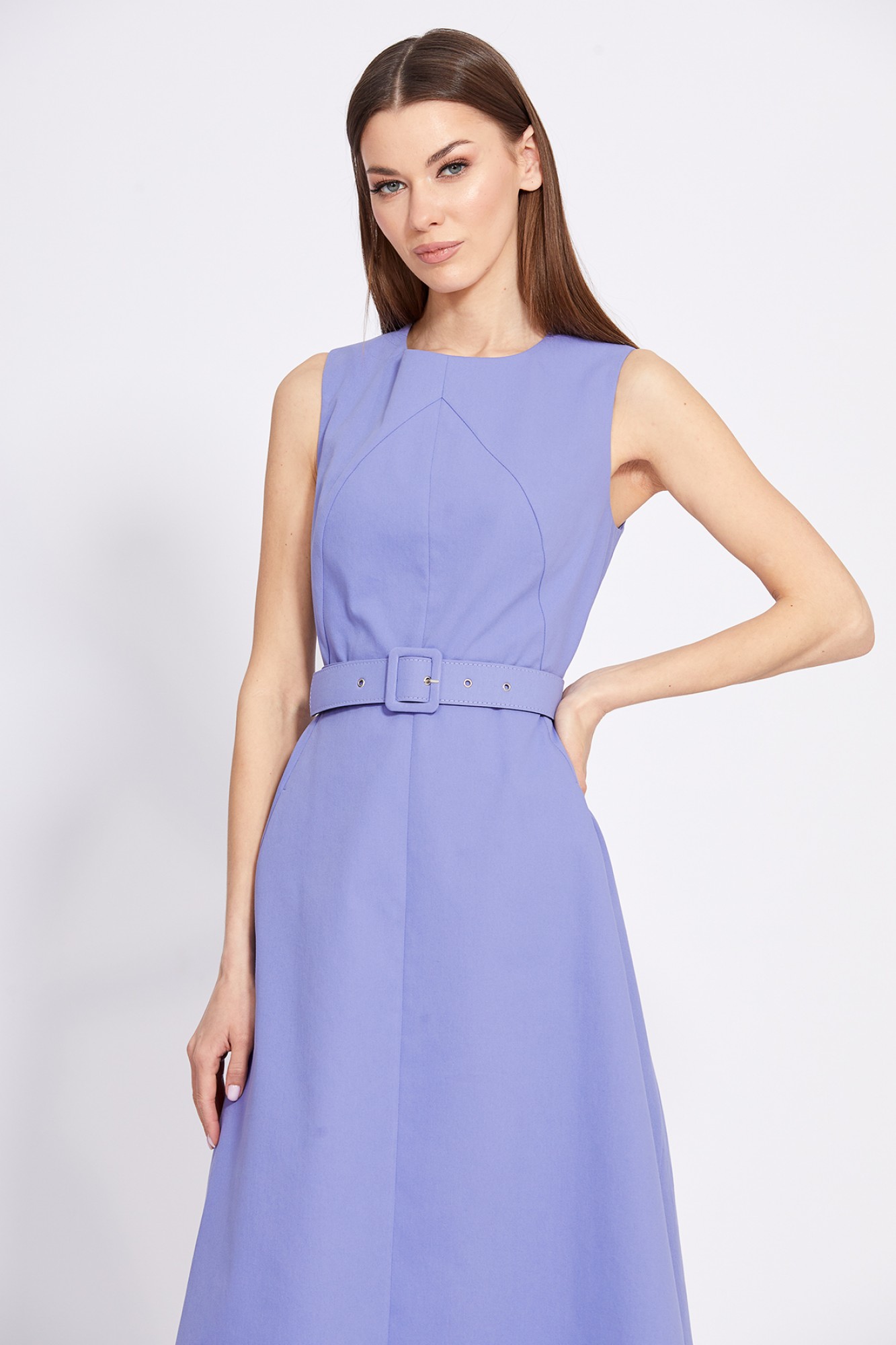 Платье выполнено из тонкого джинса. Платье Х-образного силуэта, отрезное по линии талии, длиной миди. Перед со средним швом и диагональным рельефом. Боковой шов лифа смещён. Застежка на потайную молнию в среднем шве спинки. Горловина округлой формы. Юбка расширена к низу. Переднее и заднее полотнища со средними швами и диагональными рельефами с карманами. Боковой шов юбки отсутствует.