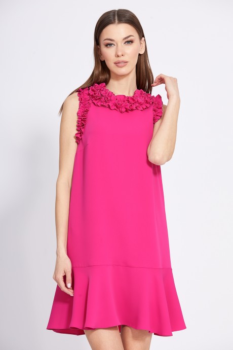 "Платье выполнено из плательной ткани. Платье А-образного силуэта, длиной выше линии колена. Горловина округлой формы. Застежка на потайную молнию в среднем шве спинки. По низу платья широкий волан. Платье декорировано рюшами из основной ткани по проймам и горловине переда.
