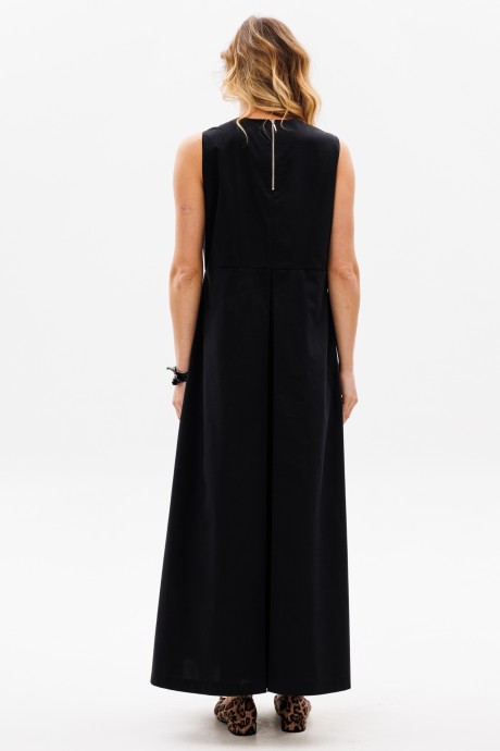 Платье выполнено из плательно-блузочной ткани. Платье А-образного силуэта, длиной миди. Горловина округлой формы. На спинке средний шов с застежкой на молнию с металлическими звеньями. Плечевой шов заужен. Пройма квадратной формы. Юбка расширена к низу. Юбка цельная со встречными складками по центру с обеих сторон. В боковых швах карманы.
