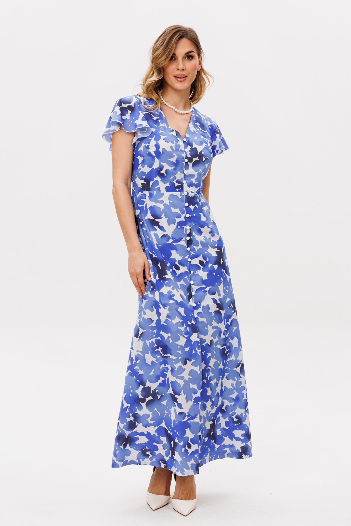Платье выполнено из плательно-блузочной ткани с цветочным принтом. Платье Х-образного силуэта, длиной миди. Платье отрезное по линии талии. Спереди центральная застежка на пуговицы. Горловина переда V-образной формы. Плечевой шов заужен. Рукав втачной, одношовный, длиной выше линии локтя, расширенный к низу. Платье на отлетной по низу подкладке.
