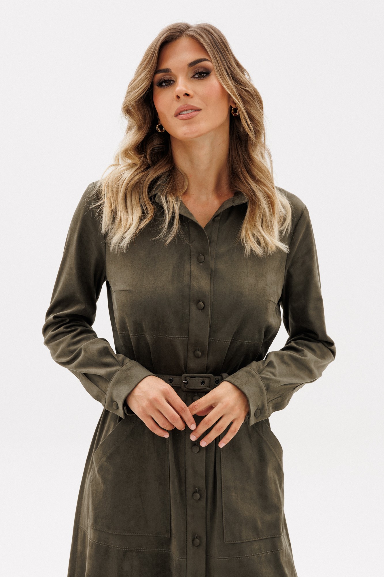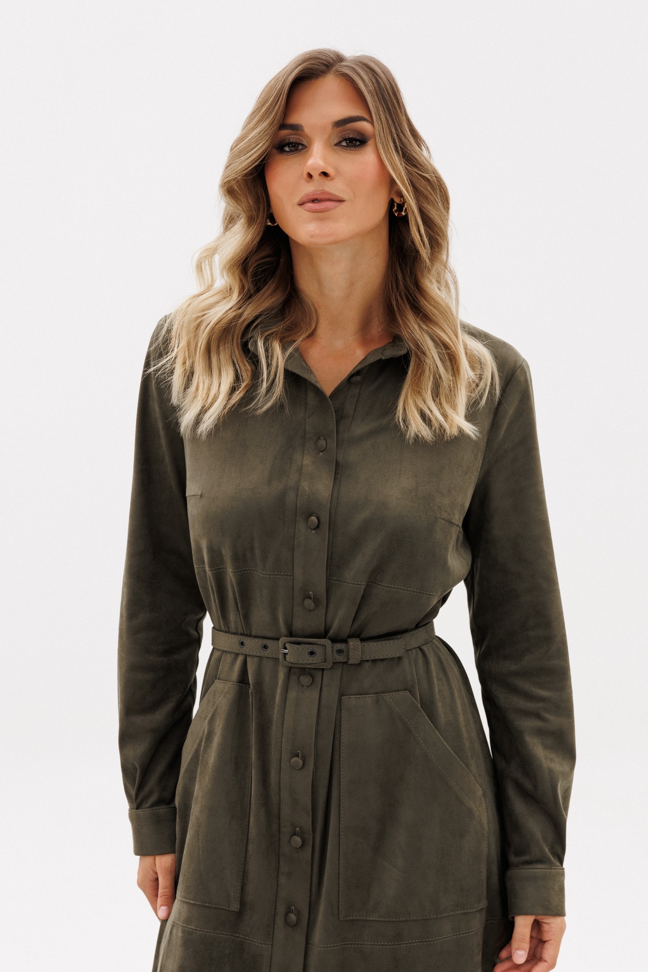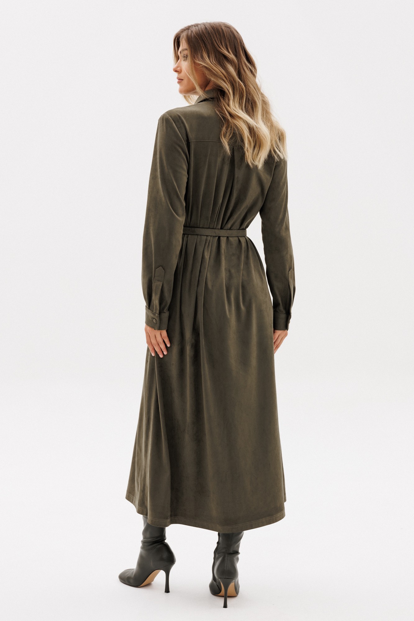 Платье выполнено из тонкой искусственной замши. Платье прямого силуэта, длиной миди. Спереди горизонтальные подрезы, накладные карманы и центральная застежка до верха с планкой на пуговицы. На спинке кокетка и встречная складка. Воротник стояче-отложной с отрезной стойкой и застежкой на пуговицу. Рукав втачной, одношовный. По низу рукава две складки и планка-обтачка. Низ рукава на притачной манжете с застежкой на пуговицу. Платье декорировано нашивкой из натуральной кожи по кокетке спинки. В комплект входит ремень из основной ткани с обтяжной пряжкой.