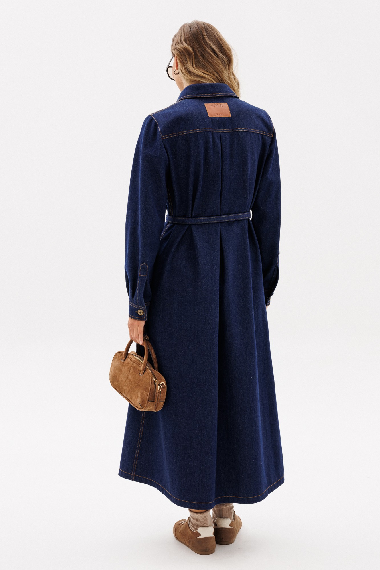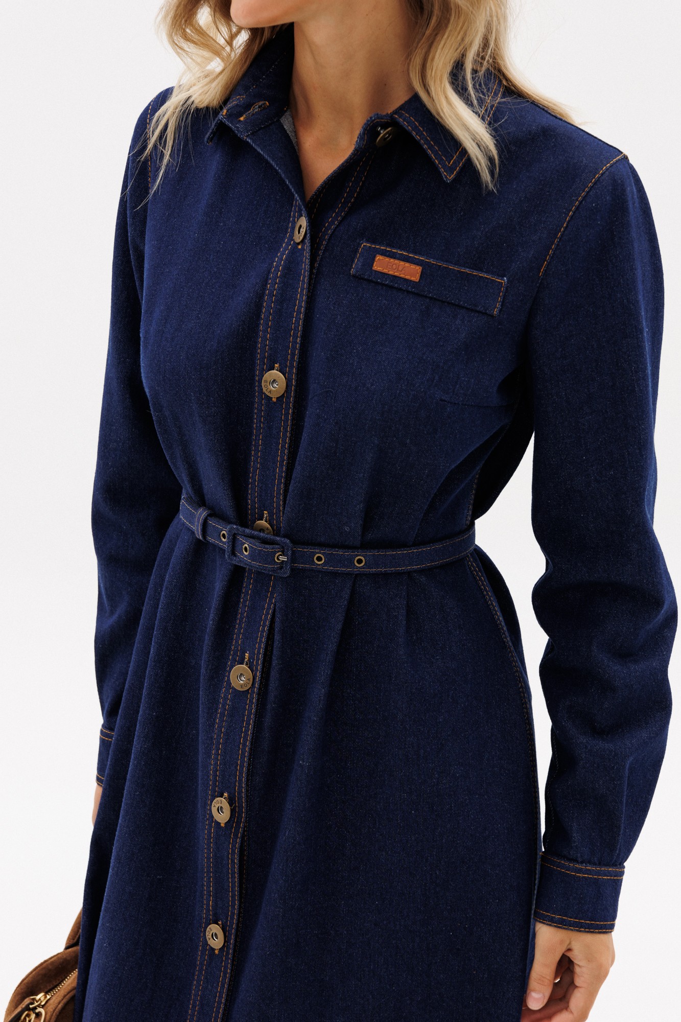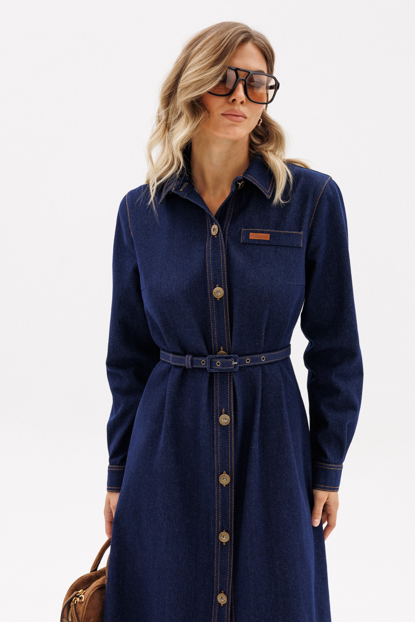 Платье выполнено из джинса. Платье рубашечного силуэта, длиной миди. Застежка спереди на металлические пробивные пуговицы. На спинке кокетка и встречная складка от нее. Воротник стояче-отложной с отрезной стойкой. Рукав втачной, одношовный, с прорезью и складкой по низу. Низ рукава на манжете, застегивающейся на пуговицу. В боковых швах карманы. Платье декорировано нашивками по переду и спинке.