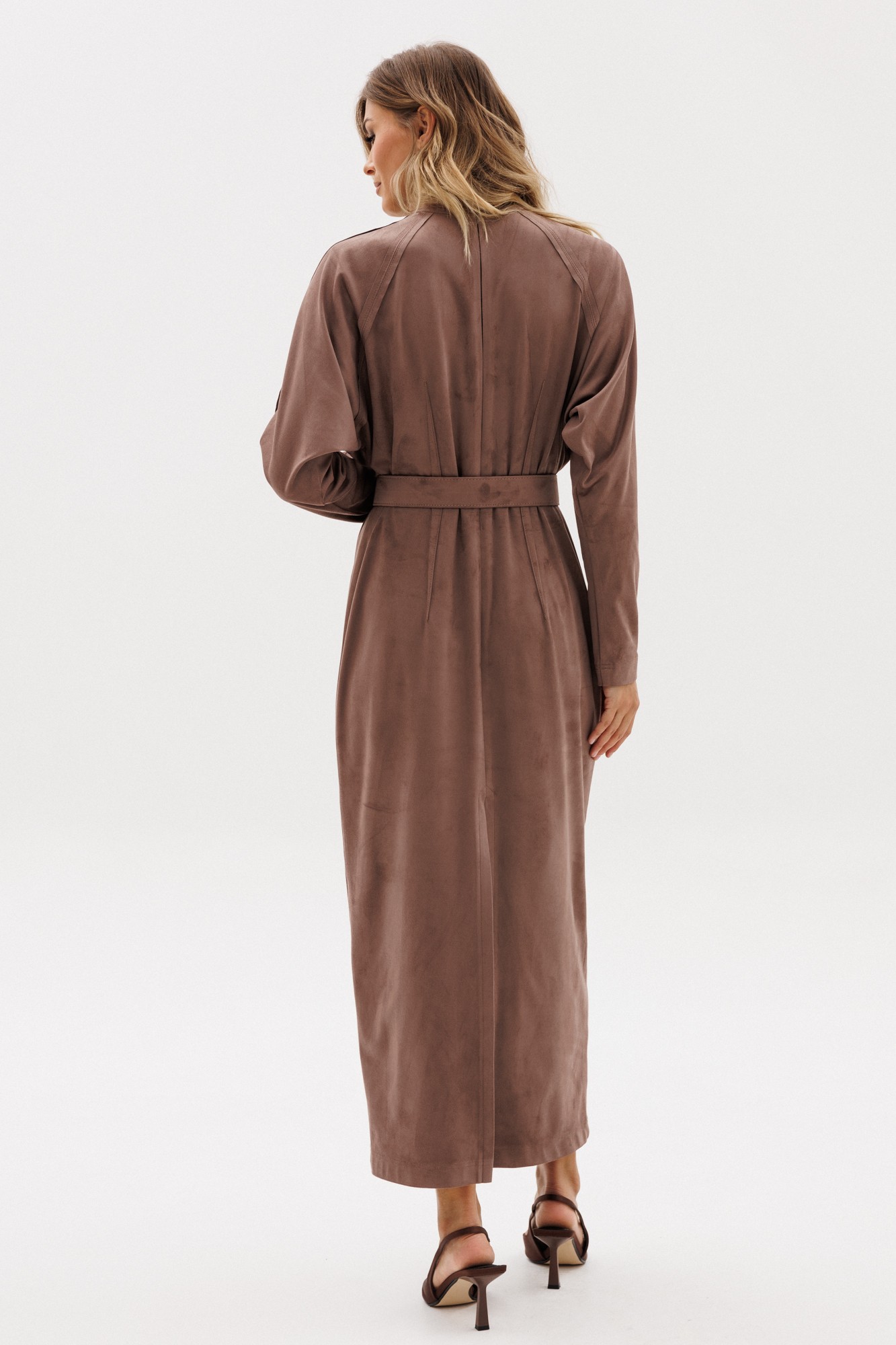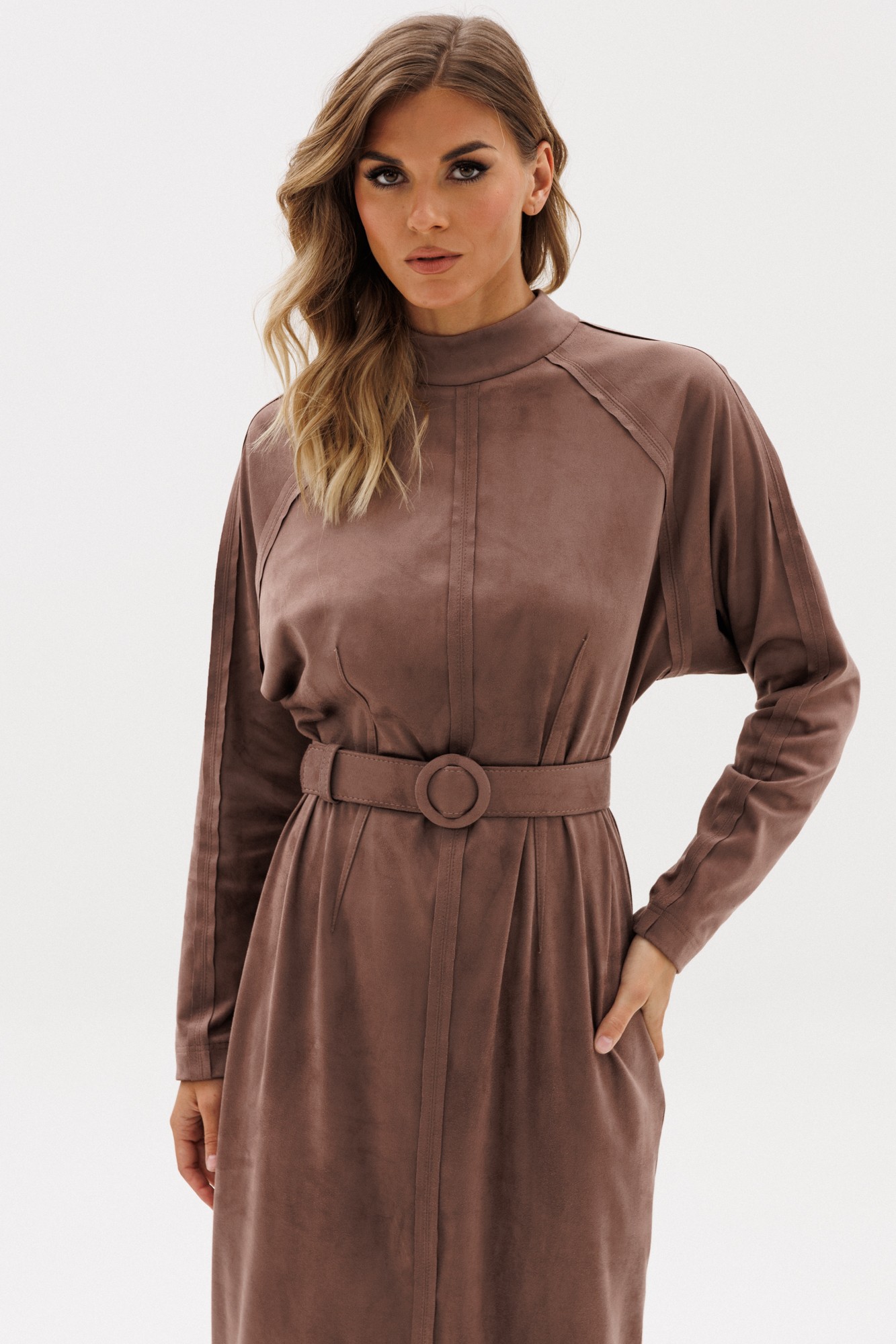 Платье выполнено из тонкой искусственной замши. Платье полуприлегающего силуэта, длиной миди. Платье отрезное по линии талии. Спереди и на спинке таллиевые вытачки и средний шов. Застежка на потайную молнию в среднем шве спинки. Воротник-стойка. Рукав покроя реглан. Средний шов переда, таллиевые вытачки, верхний шов рукава и линии реглана обработаны ""на лицо"". В комплект входит съемный ремень из основной ткани с обтяжной пряжкой.