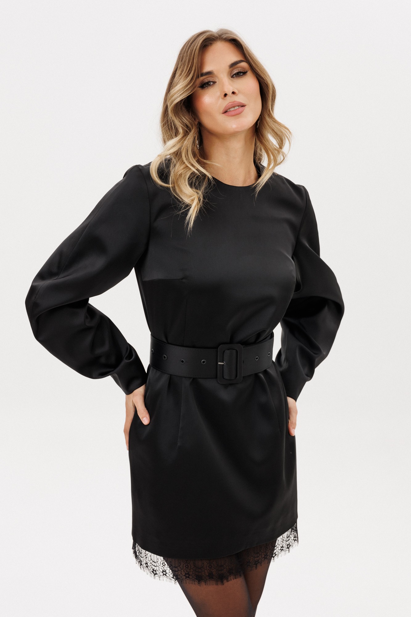 Платье выполнено из плотного атласа. Платье полуприлегающего силуэта длиной выше линии колена. Застежка на потайную молнию сзади в среднем шве спинки. Горловина округлой формы. Рукав двухшовный, фигурной формы. Низ платья декорирован кружевом. Платье на притачной по низу подкладке. В комплект входит съемный ремень из основной ткани с обтяжной пряжкой и блочками.