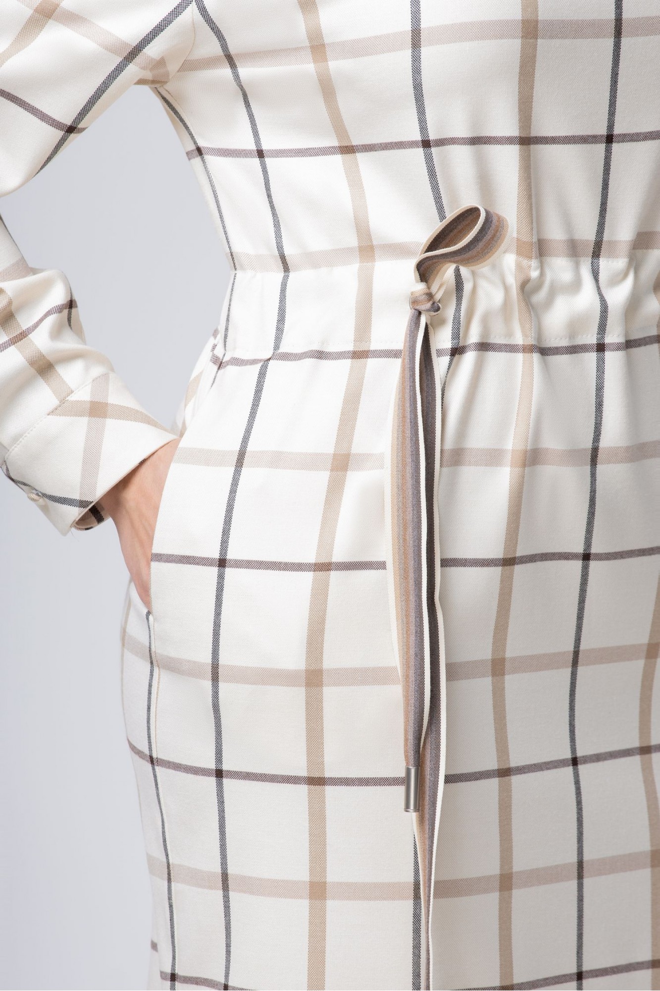 Платье женское текстильное полуприлегающее без подкладки. Головина обработана воротником. Плечо спущенное, рукав длинный, обработан манжетой, застегивающейся на петлю и обтяжную пуговицу. Спинка со средним швом с потайной молнией и разрезом. По талии кулиска с киперной лентой с наконечниками. В боковых швах карманы.