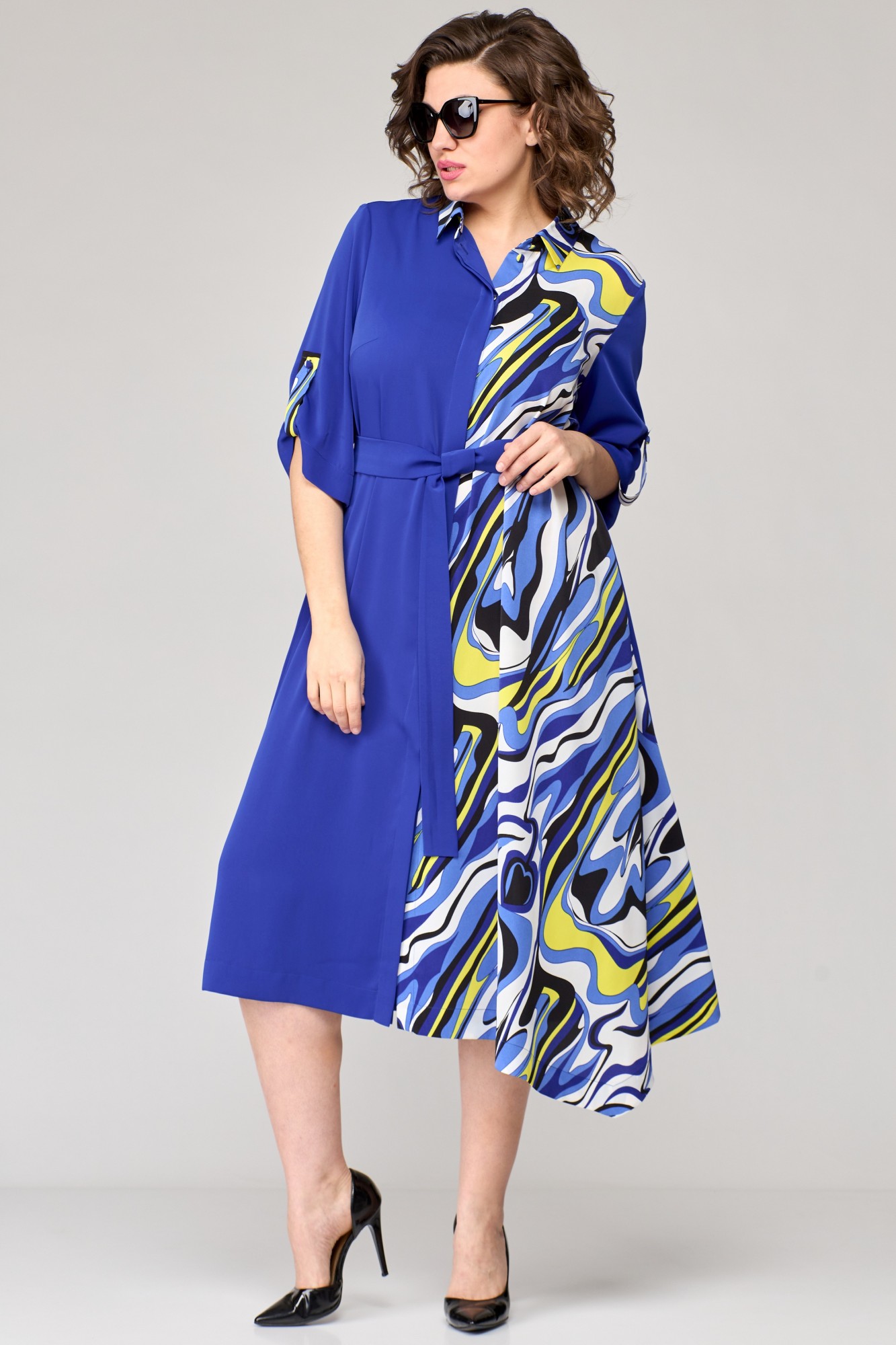 Платье женское нарядно-повседневного стиля, полуприлегающего силуэта, расширенное к низу. Выполнено из текстильного полотна двух дизайнов. Застежка центральная потайная на пуговицах, воротник на стойке рубашечного типа, рукав втачной, по низу на притачной манжете, в боковых швах обработаны карманы. Платье ассиметричное, одна из полочек выполнена углом. Декором служит съёмный пояс, выполненный из искусственной кожи.