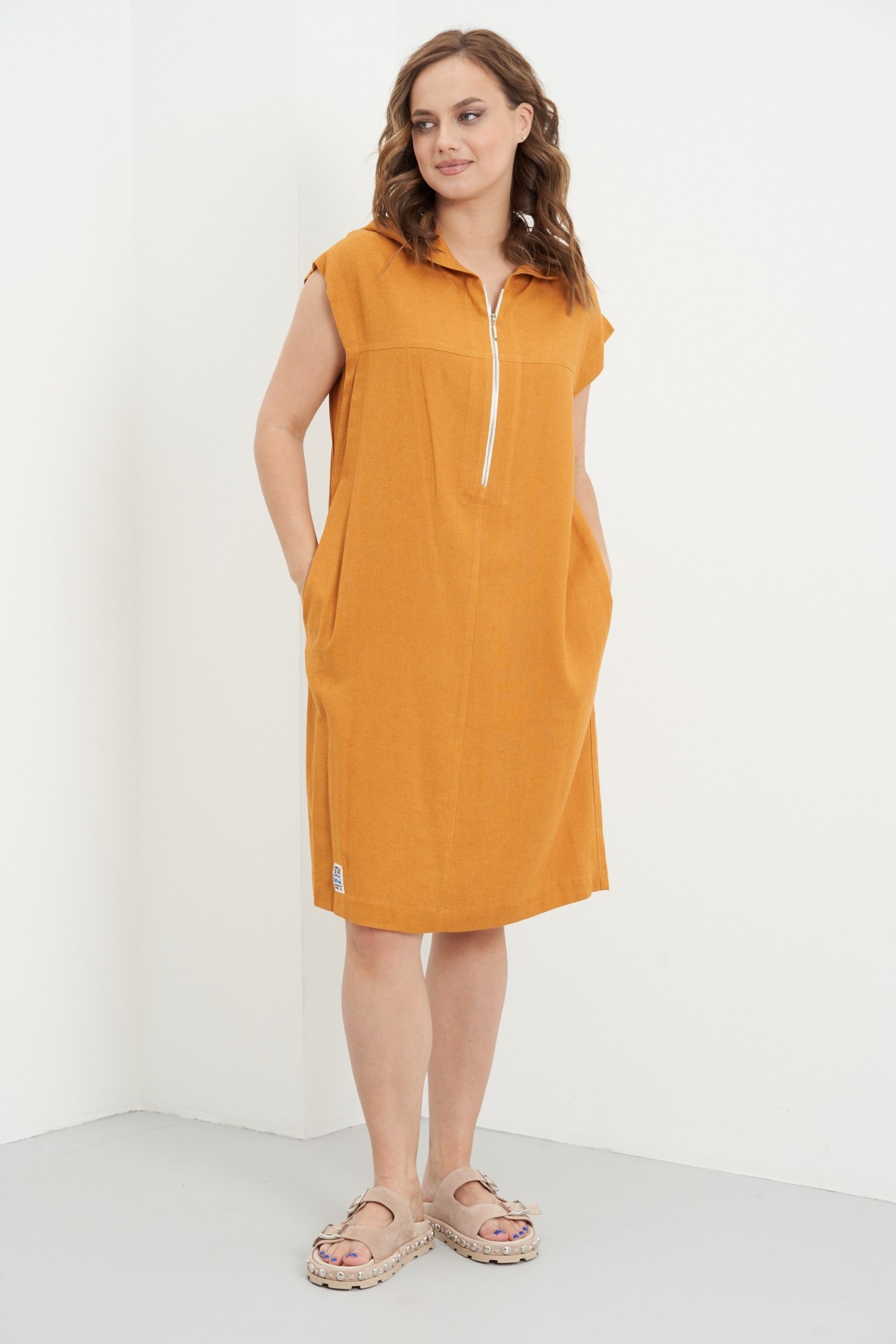 Женское платье из льняной однотонной ткани для повседневной носки. Платье прямого силуэта, со спущенной линией плеча, и проймой, переходящей в подрез треугольной формы. Перед лифа состоит из двух частей: горизонтальной кокетки с цельнокроенным капюшоном и нижней части. Застёжка на тесьму-молнию в центральном шве переда. Спинка платья состоит из двух частей: горизонтальной кокетки и нижней части, в среднем шве спинки обработана шлица. В боковых швах - карманы. Длина платья по среднему шву спинки около 99 см.