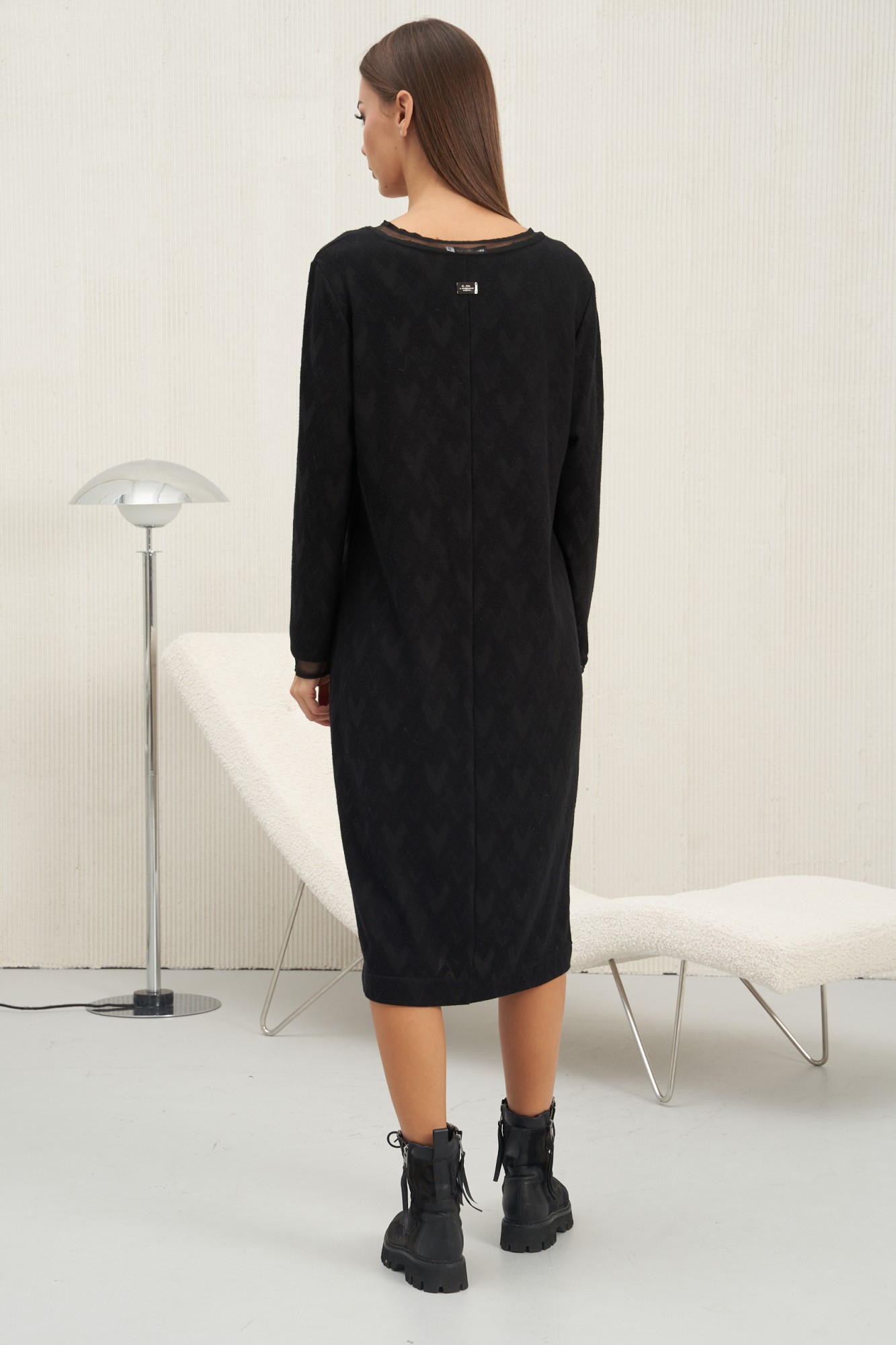 Элегантное платье полуприлегающего силуэта, втачного покроя, длины миди. Особую изысканность модели придаёт отделочный довяз по линии горловины и низкам рукавов.