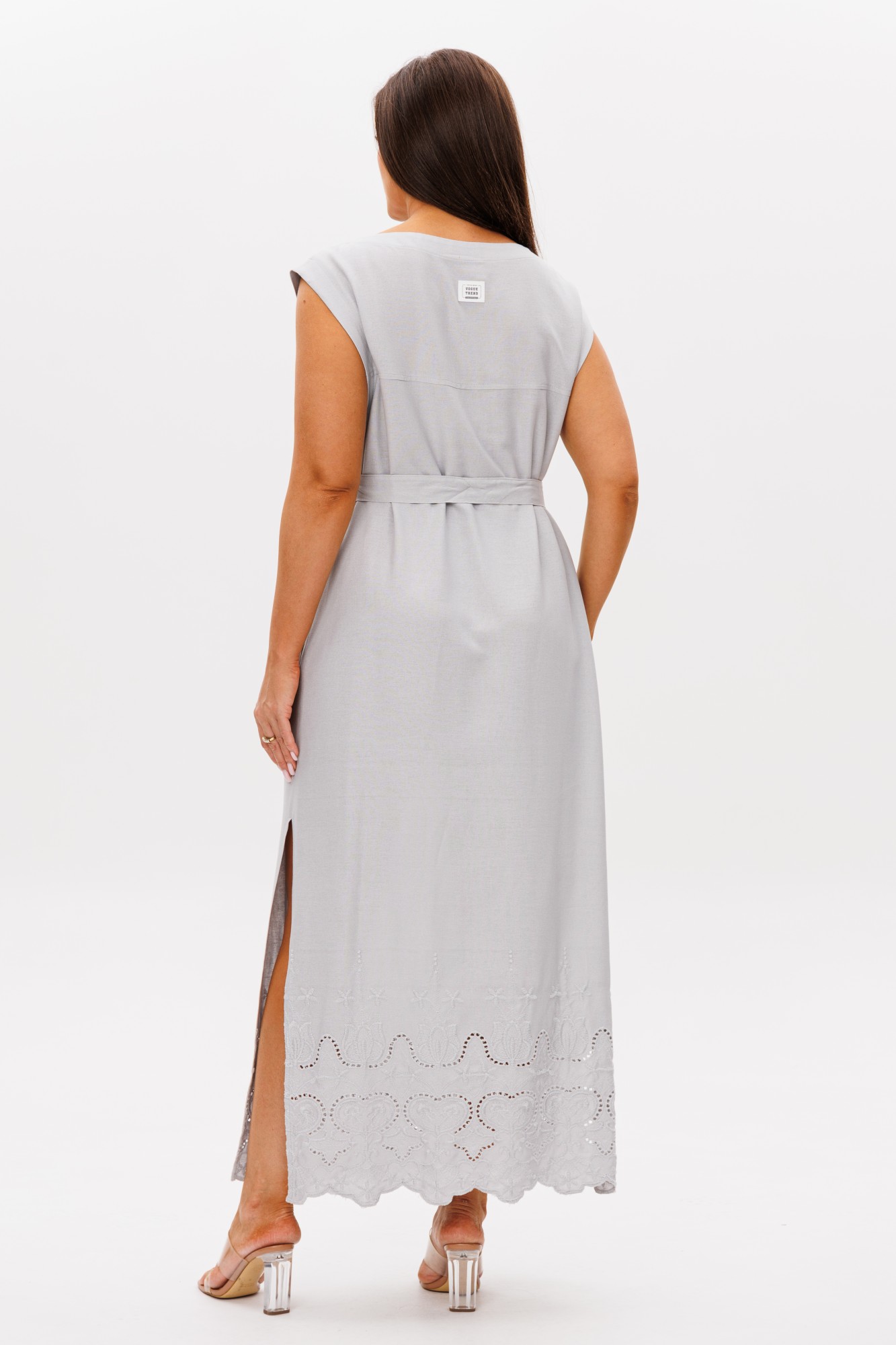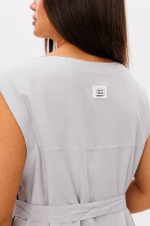 Женское платье из однотонной ткани для повседневной носки. Платье прямого силуэта, со спущенной линией плеча, и проймой, переходящей в подрез треугольной формы. Перед лифа состоит из двух частей: горизонтальной кокетки и нижней части. Застёжка на тесьму-молнию в центральном шве переда. Спинка платья состоит из двух частей: горизонтальной кокетки и нижней части, в среднем шве спинки обработана шлица. Модель дополнена съемным поясом.