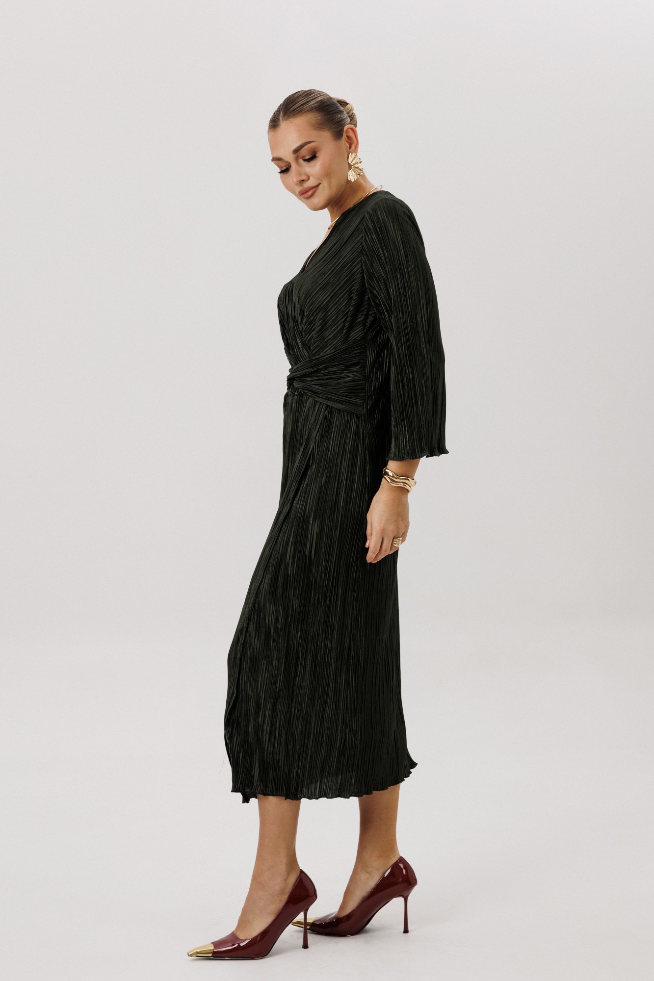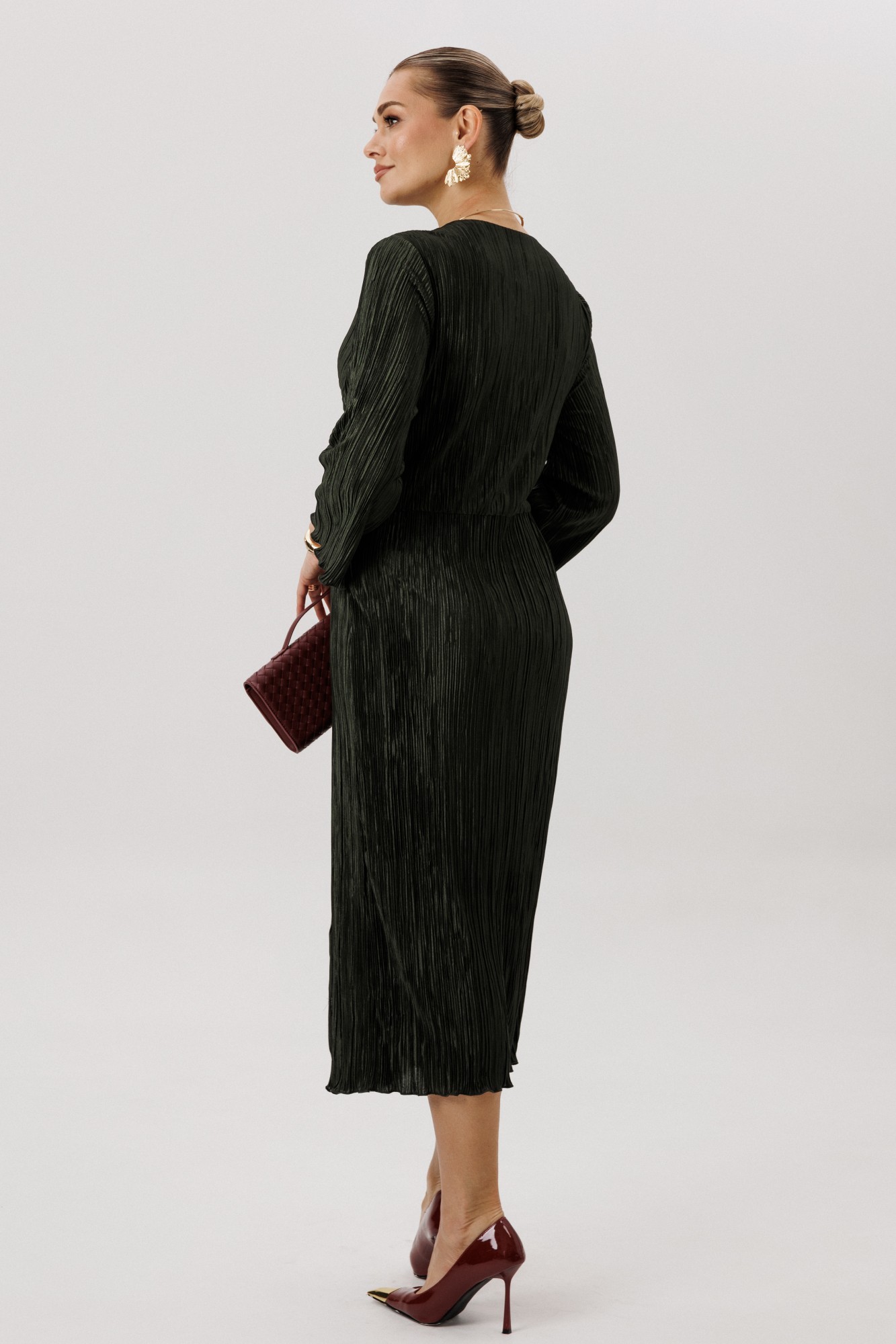 Очарование и красота девушки любого возраста засияют еще ярче, если выбрать для нарядного образа изысканное вечернее платье. Темно-зеленый цвет-фаворит сезона 2024-2025 года. Женственный силуэт, подчеркивающий линию талии, и невероятная фактура гофрированного полотна делают эту модель не только изысканно-красивой, но и мега удобной. Полуприлегающий силуэт, втачной покрой, рукав длиной 7/8, отрезной лиф с запахом, юбка с запахом по переднему полотнищу. По линии талии по переду акцентная драпирующаяся деталь-перевертыш. По линии талии на спинке-эластичная тесьма.