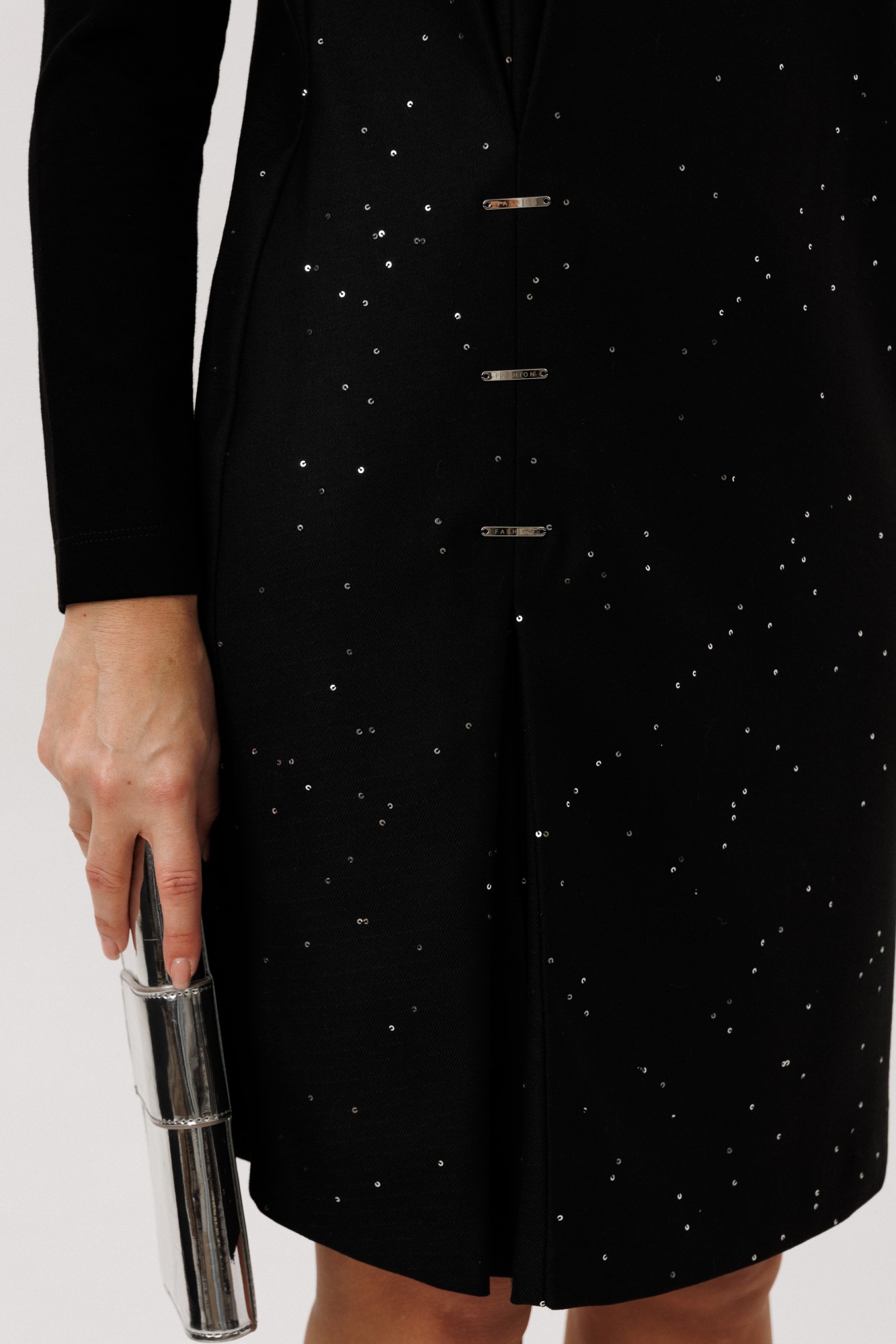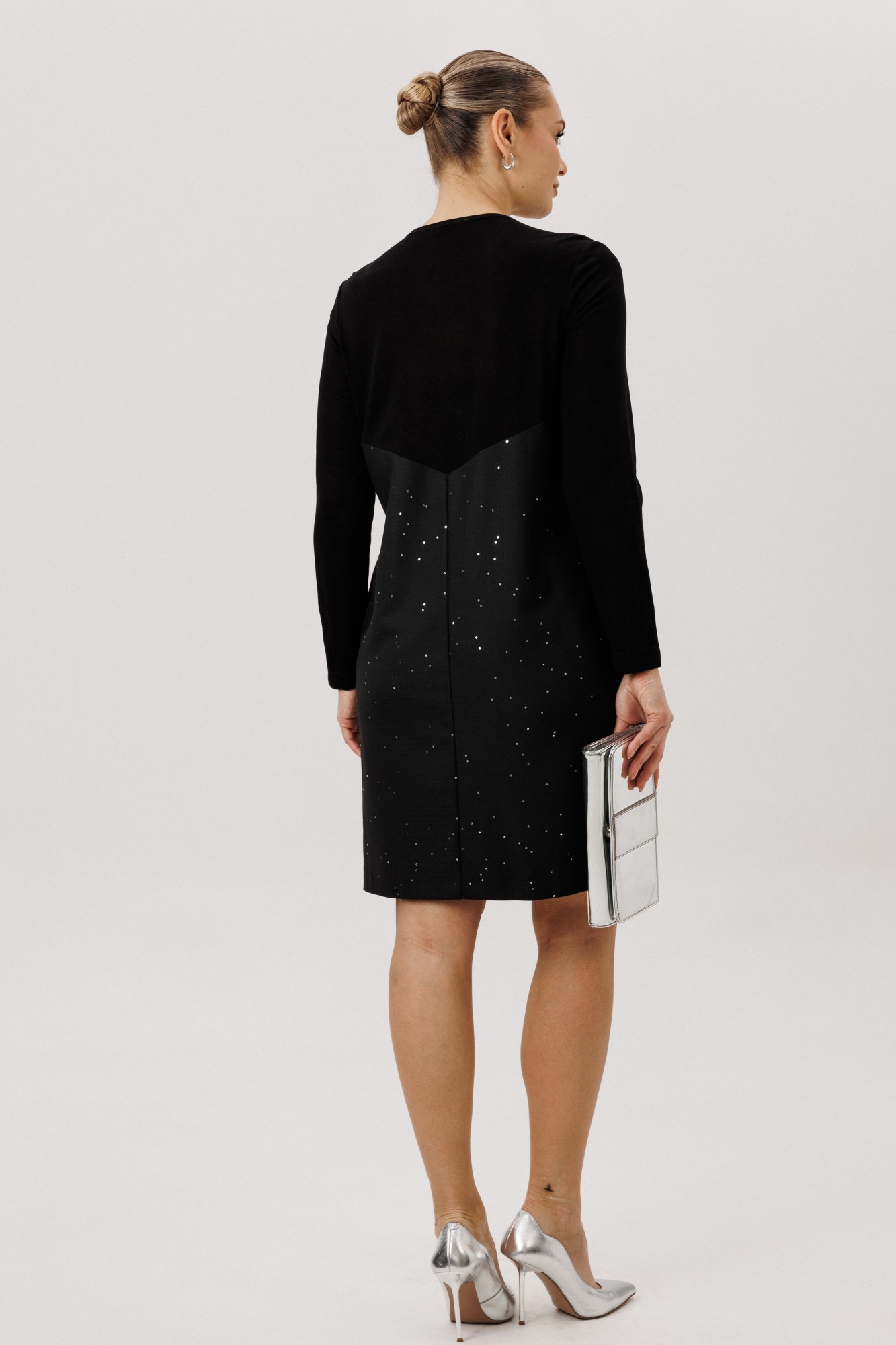 Платье остаётся неизменным символом женственности и элегантности, являясь ключевым элементом гардероба. Акцент - на многофункциональность! Это и самостоятельный наряд, и в дополнении с другими элементами одежды (жакеты) - гармоничный образ от вечернего выхода до повседневного. Свободный упрямлённый силуэт, втачной рукав, круглая горловина. Полочка с отрезной кокеткой, ассиметричным рельефом со встречной складкой и разрезом, нагрудной вытачкой. Спинка с центральным швом и отрезной фигурной кокеткой. Рукав зауженный, длинный. Кокетка полочки, спинка и рукава - из мягкого вискозного фактурного трикотажа. Полочка и спинка - из эффектного поливискозного полотна с лёгким вкраплением пайетки.