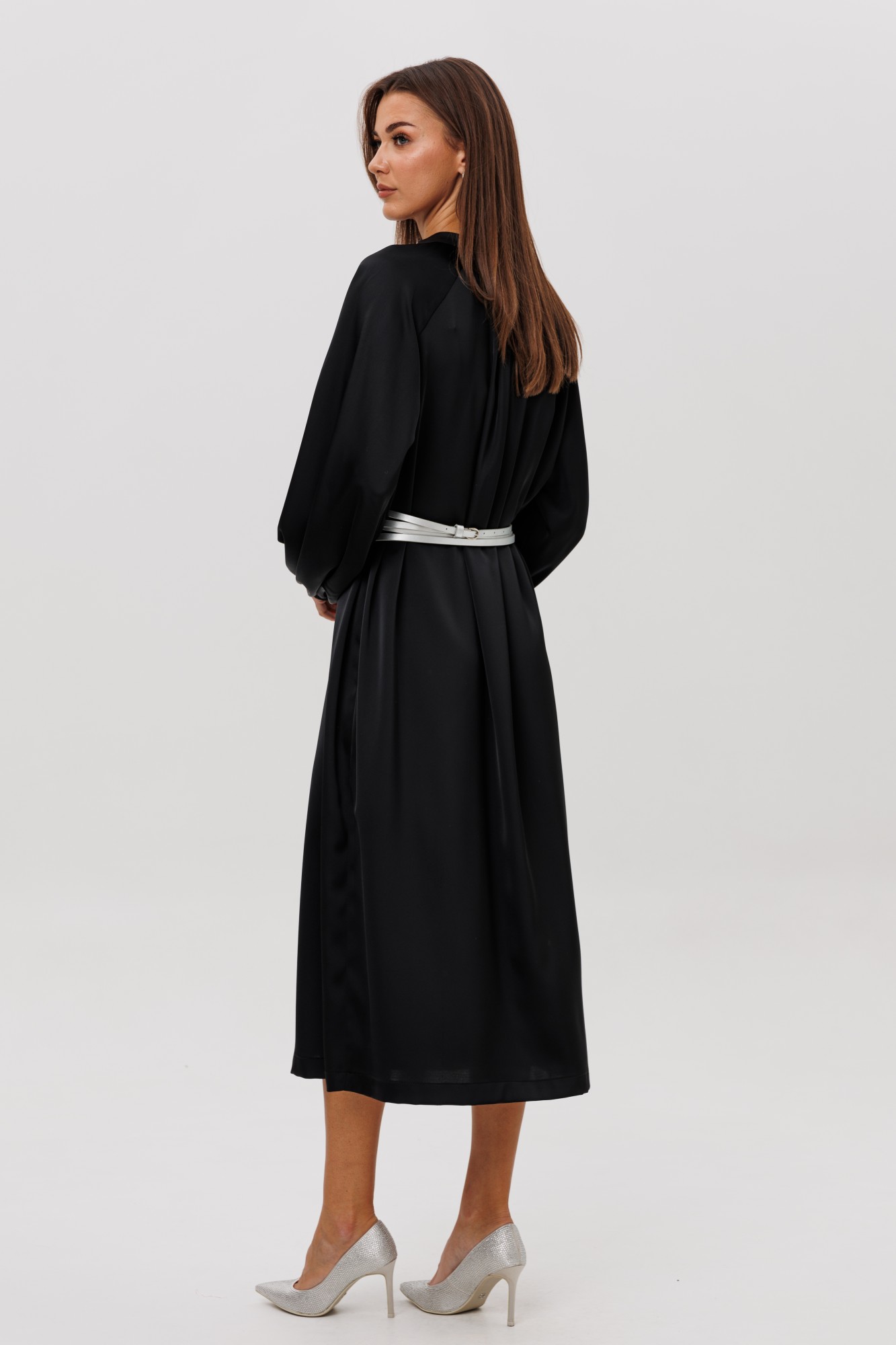 Платье из гладкого атласного полотна свободного рубашечного покроя. Модель выполнена с мягкой сборкой по горловине, застёжкой на пуговицы и объёмными рукавами на манжете. Акцентом выступают эффектные серебристые пояса, подчёркивающие талию и добавляющие образу современный, элегантный штрих. Ideal для деловых встреч, ужинов и особых выходов.