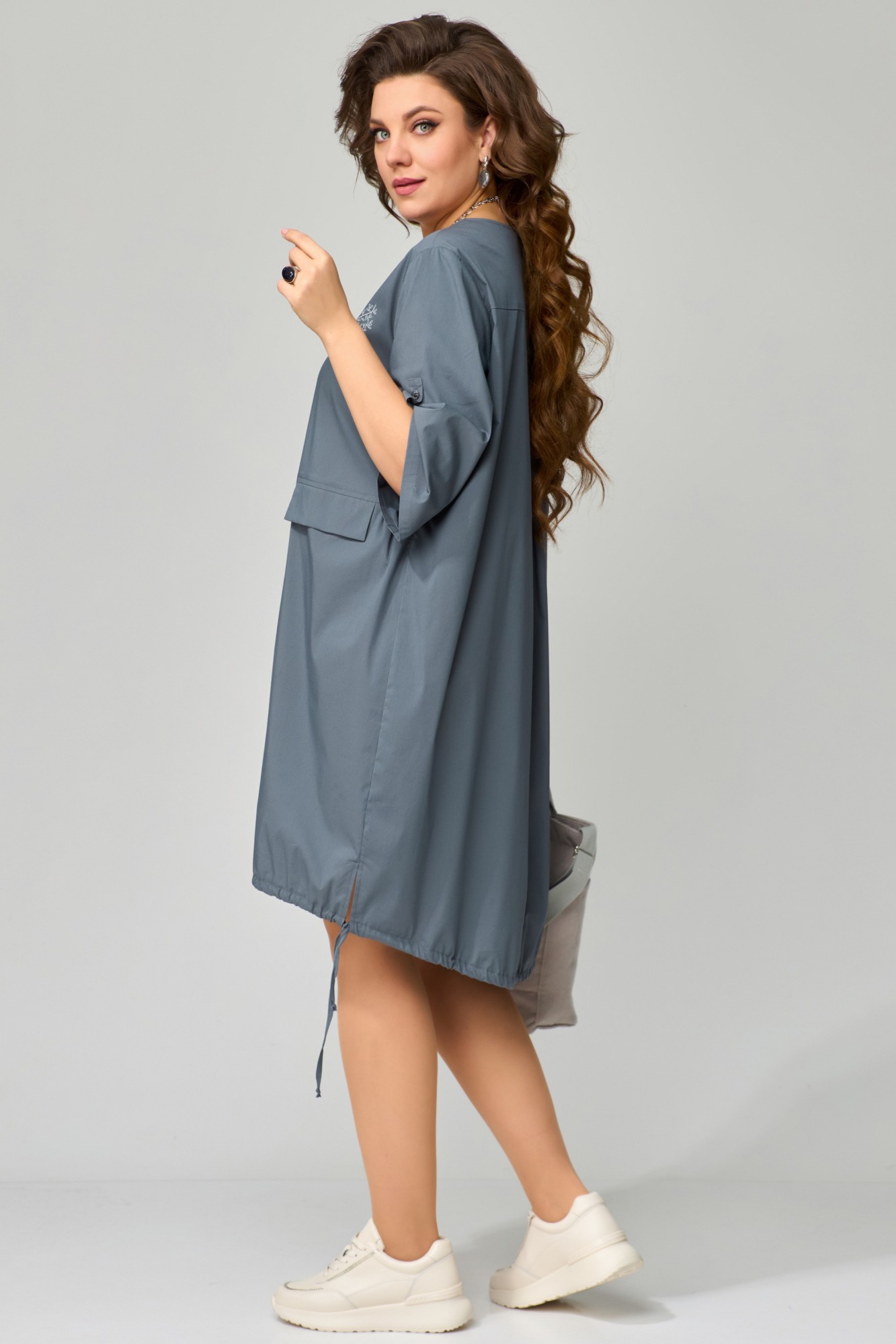 Платье женское "Саедана", оверсайз. Длина по переду выше колена, спинка удлиненная. Низ собран на кулису. По талии подрез со сборкой, в котором обработаны карманы с клапанами. Рукав втачной, длина 3/4. Длина рукава регулируется патой. Линия плеча спущена. Горловина круглая, обработана притачной бейлой. Украшение в комплект не входит.